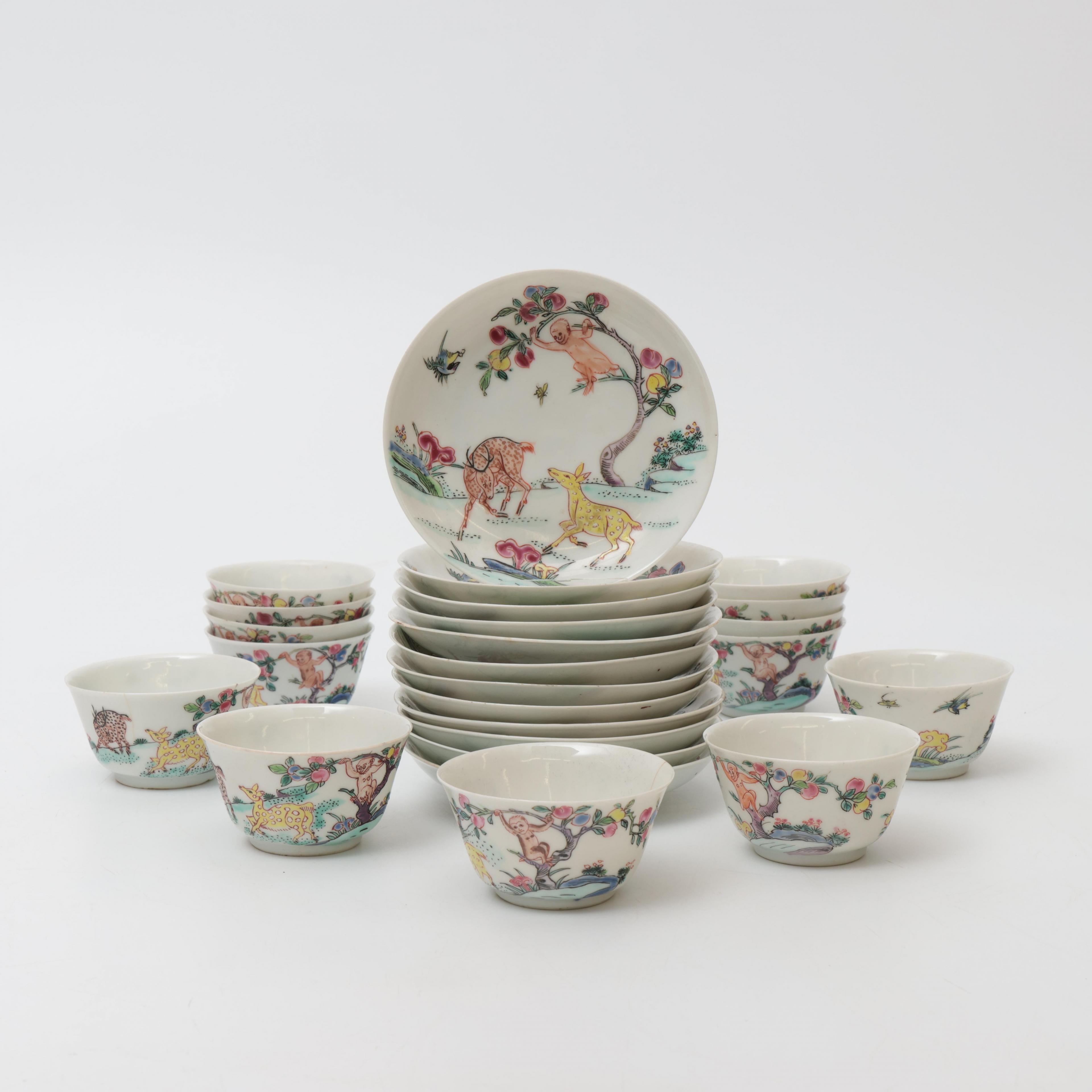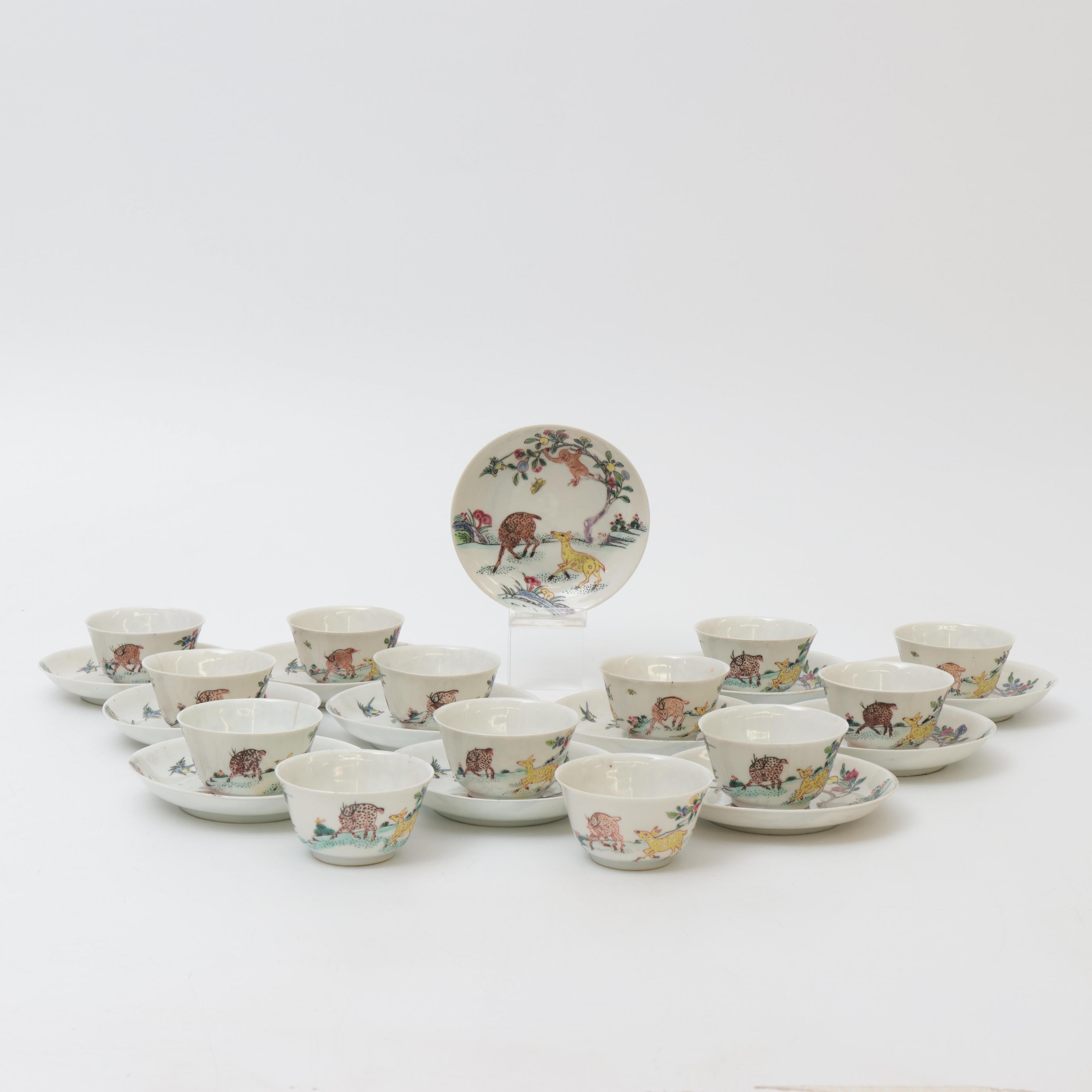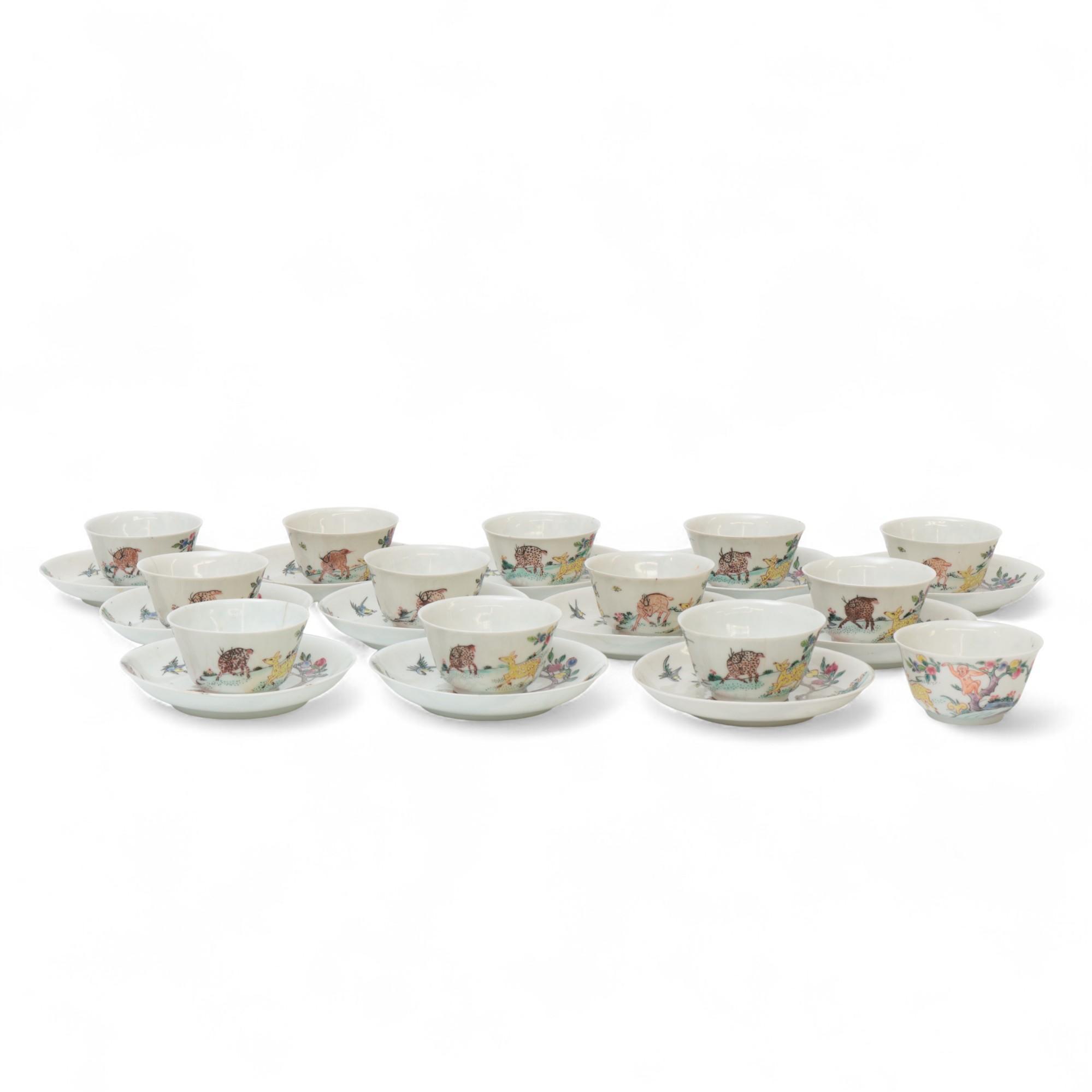 China, a set of thirteen famille rose porcelain 'deer and monkey' cups and twelve saucers, 18th century,