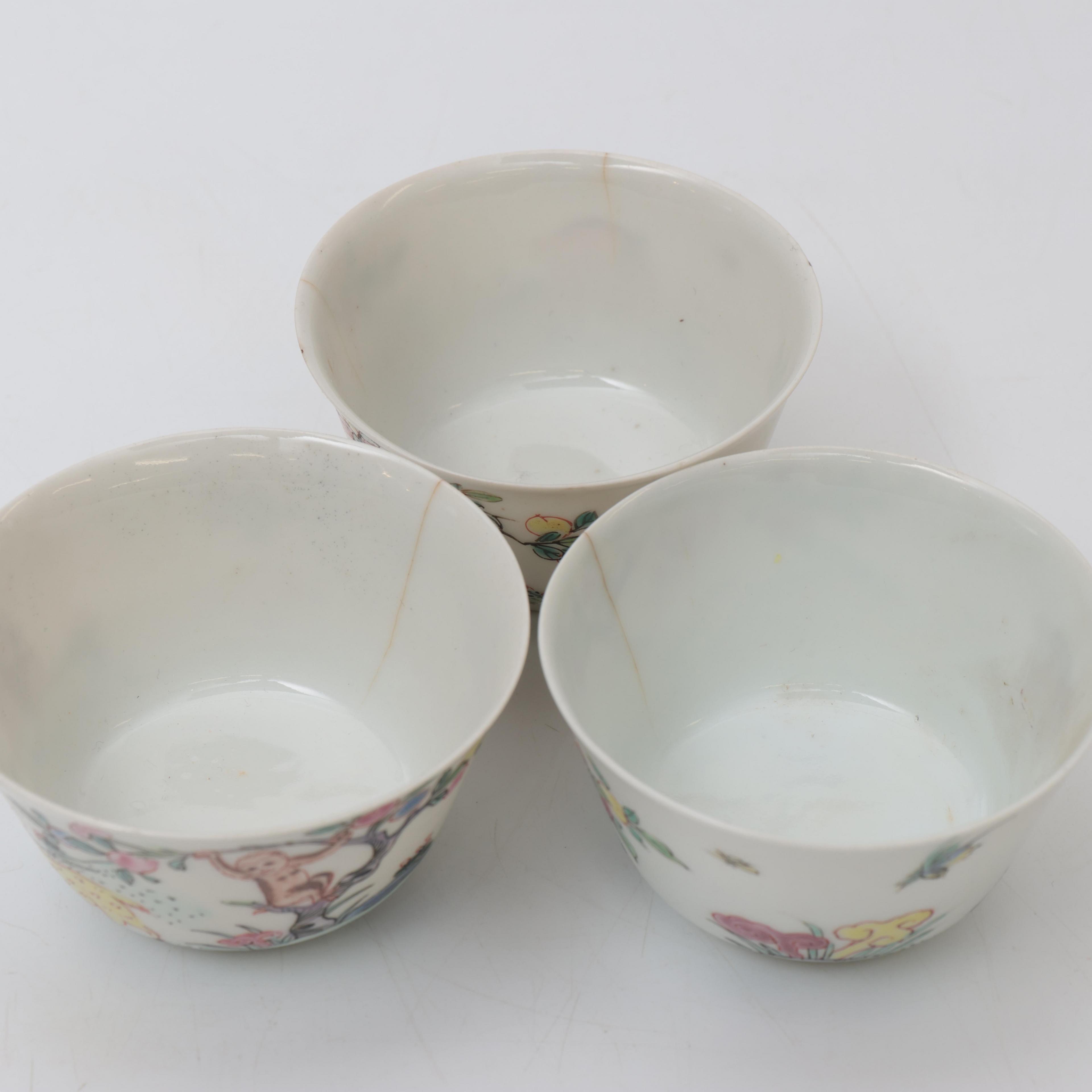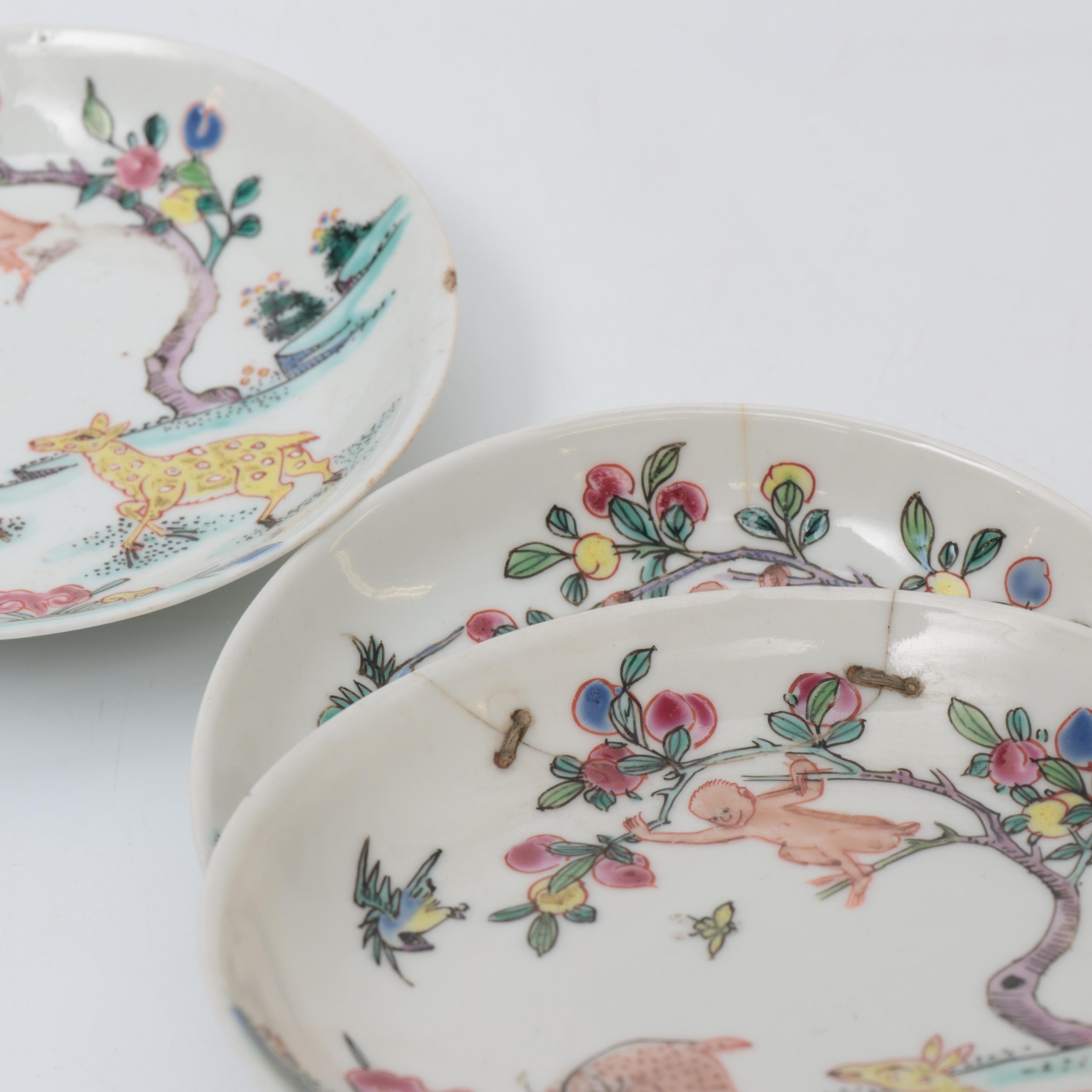 each decorated with a pair of spotted deer with a monkey seated in a peach-tree beside them (five cups and three saucers with small chips and hairlines, one saucer with restored chip with crams)