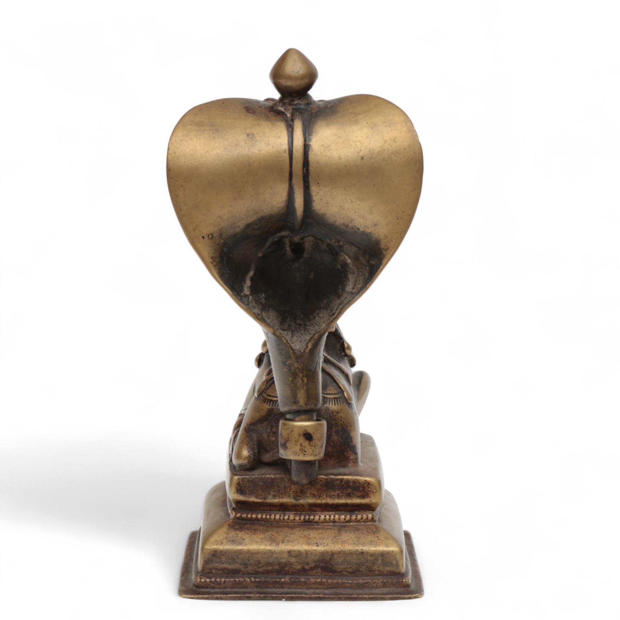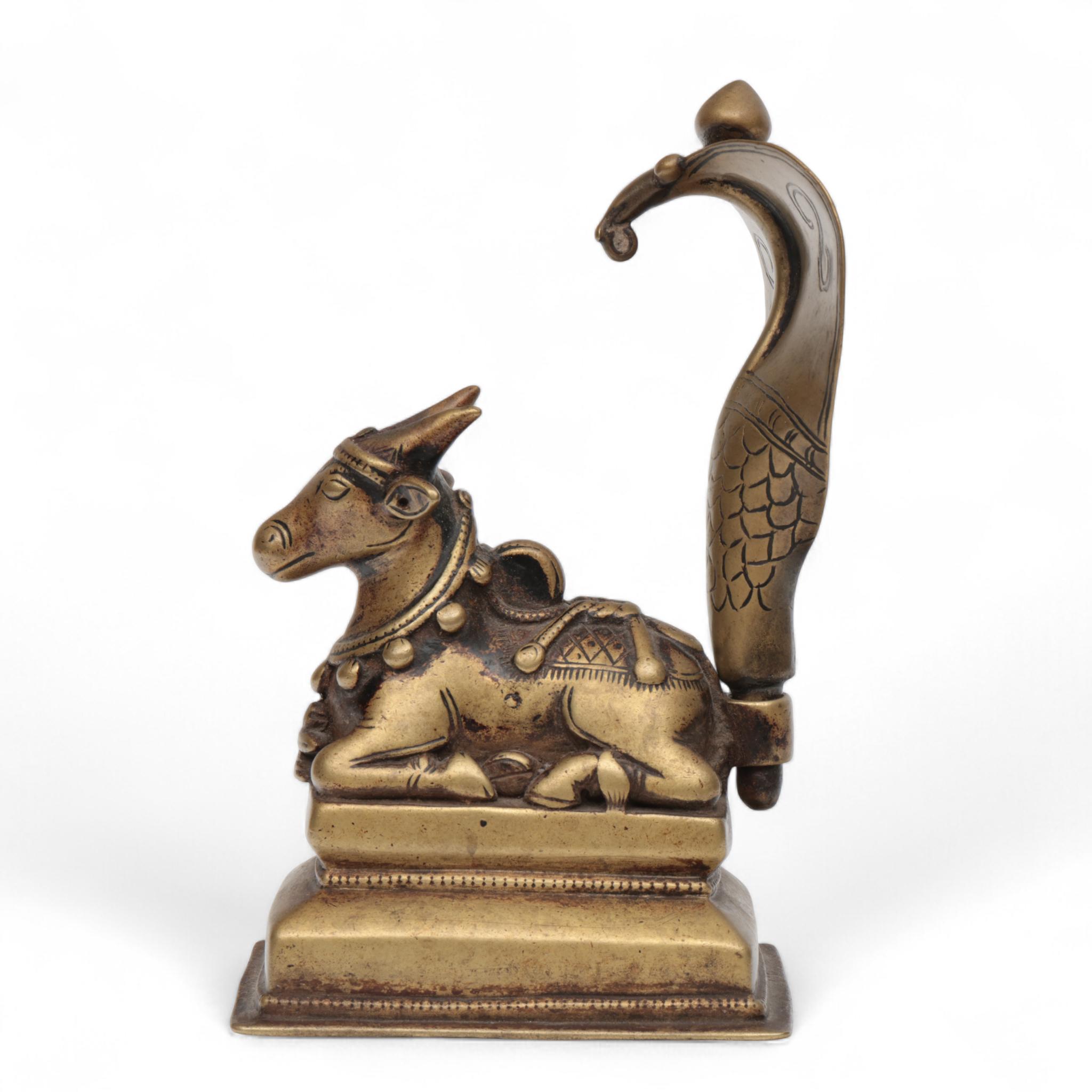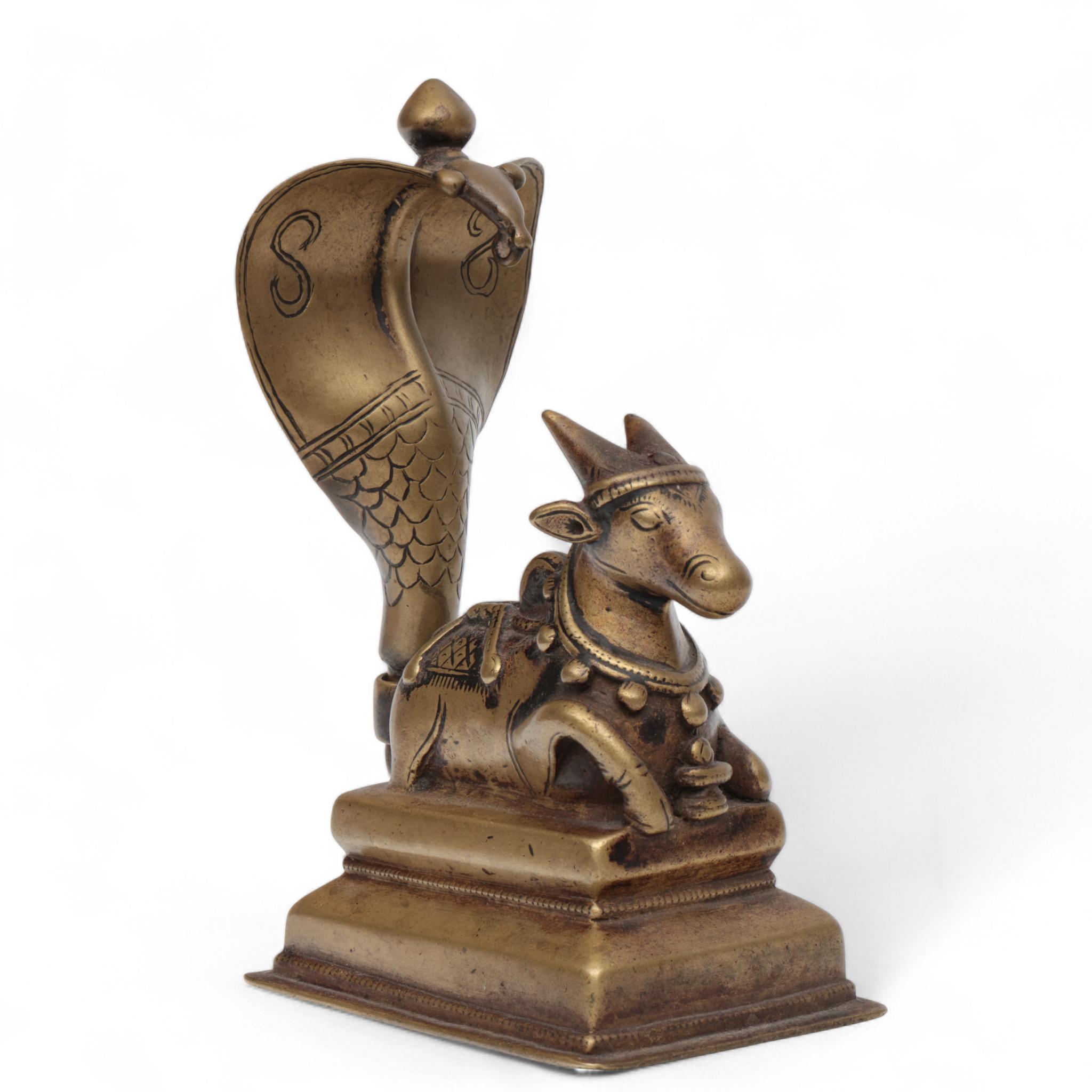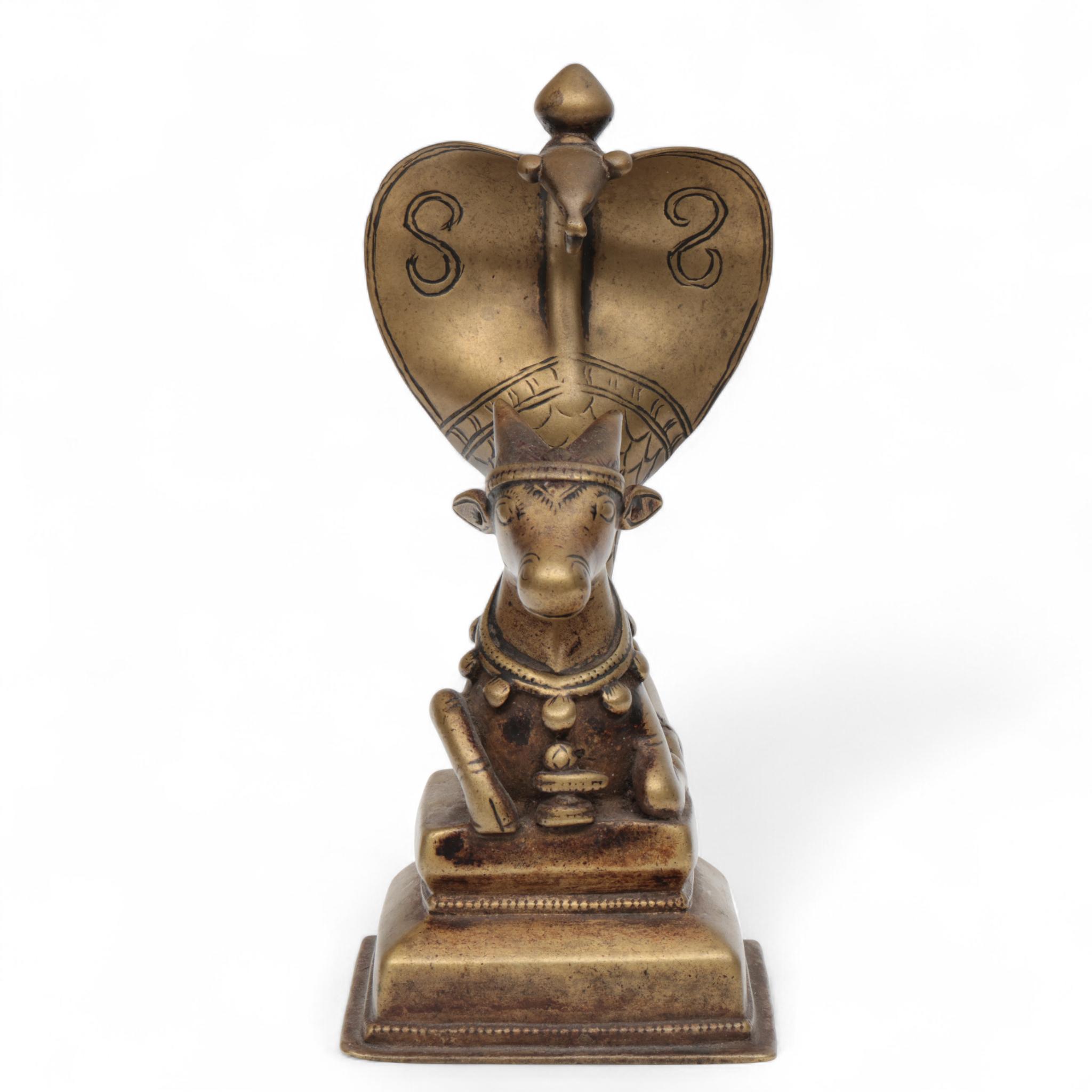 India, a copper alloy sculpture of a seated Nandi with a Naga throne, 19th century