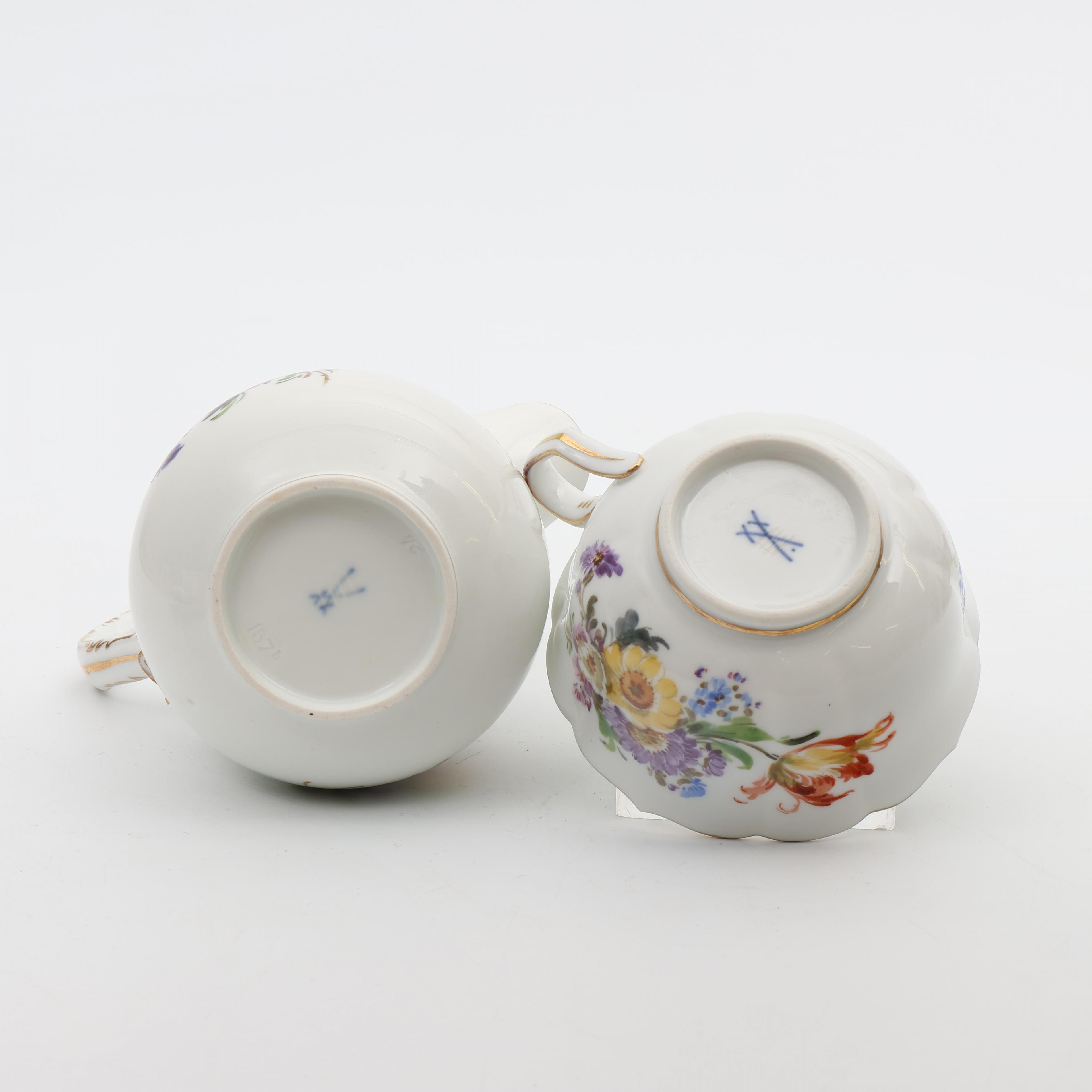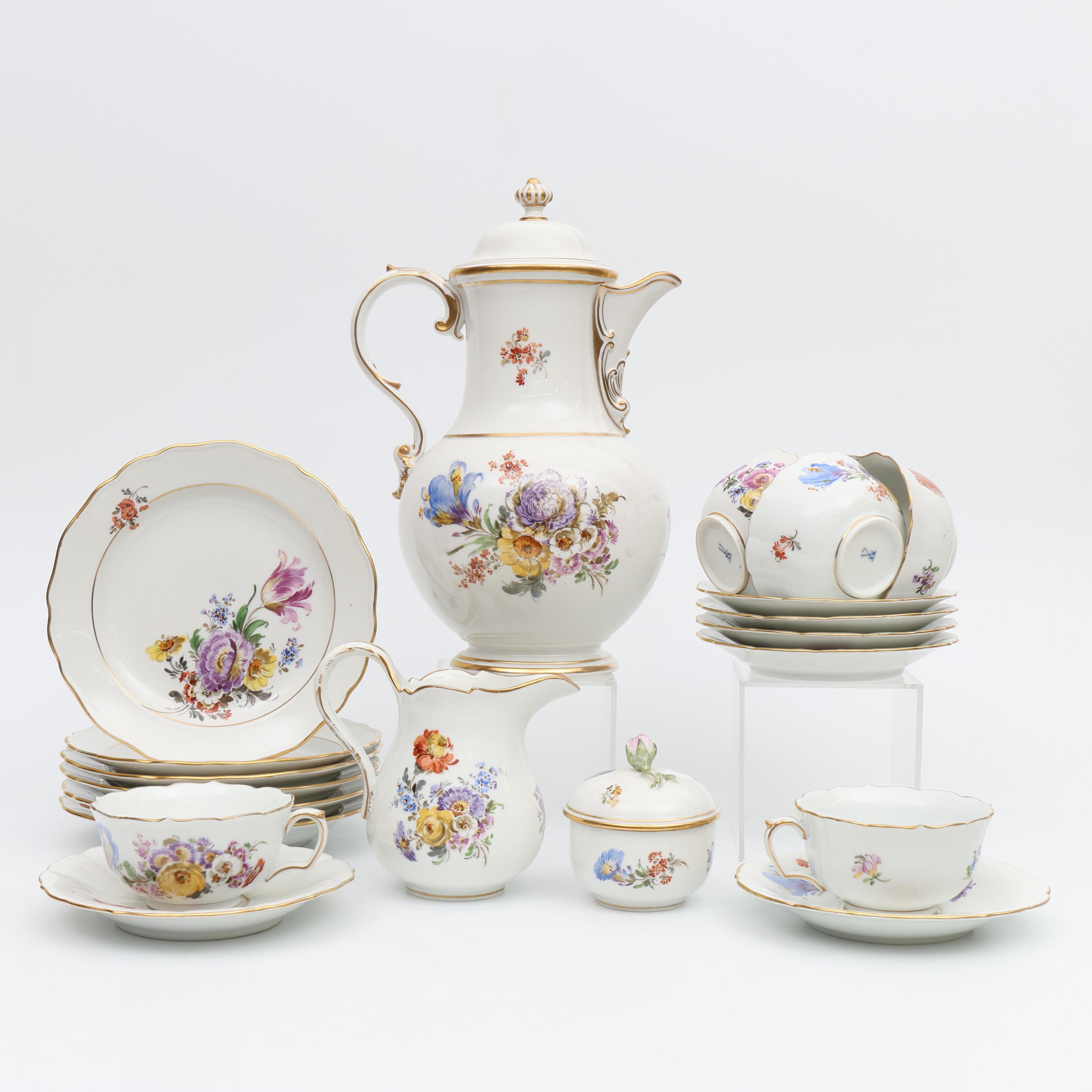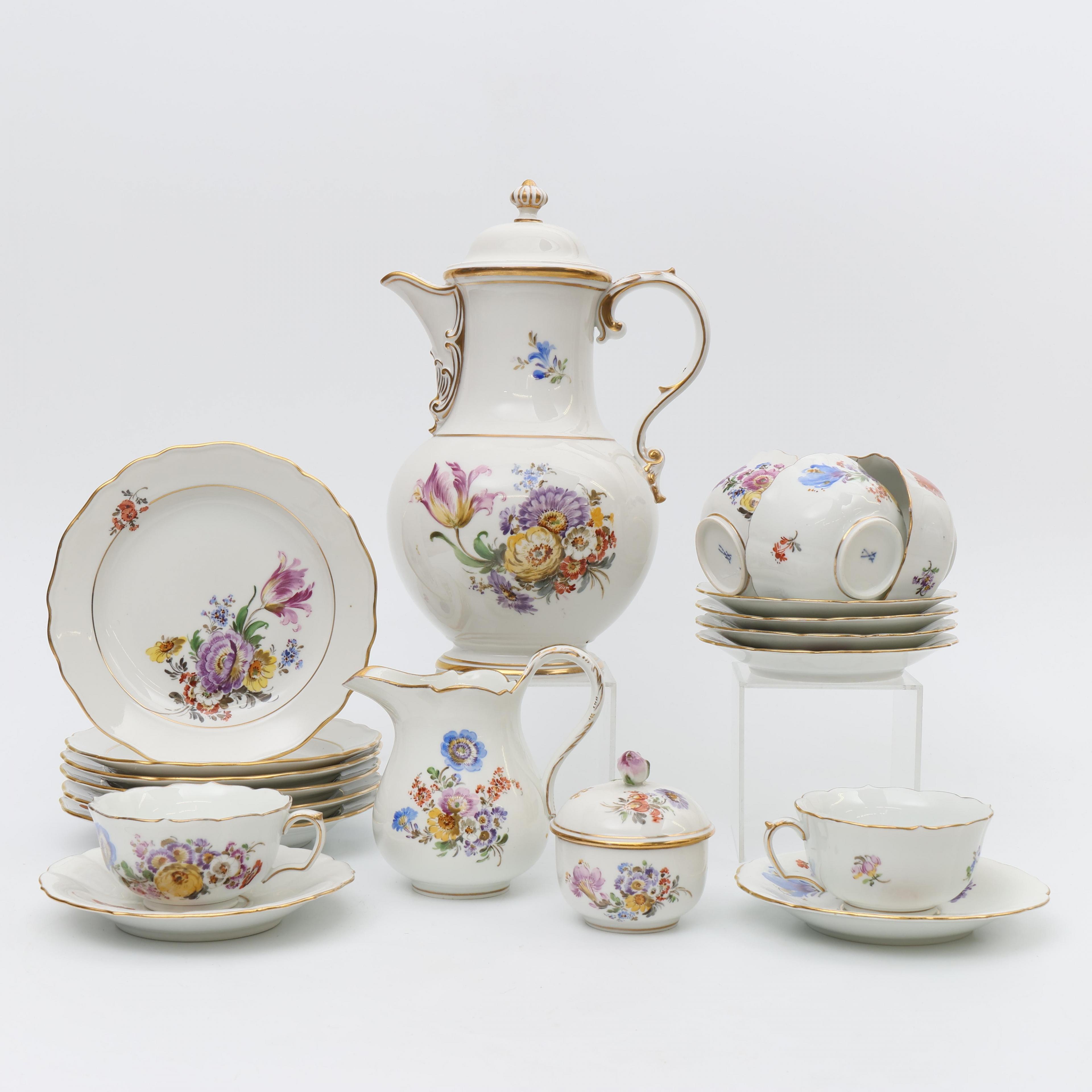 Uitgevoerd met geschilderd decor van bloemen. Bestaande koffiepot, suikerpot, melkkan, zes gebaksbordjes, en zes kop- en schotels.