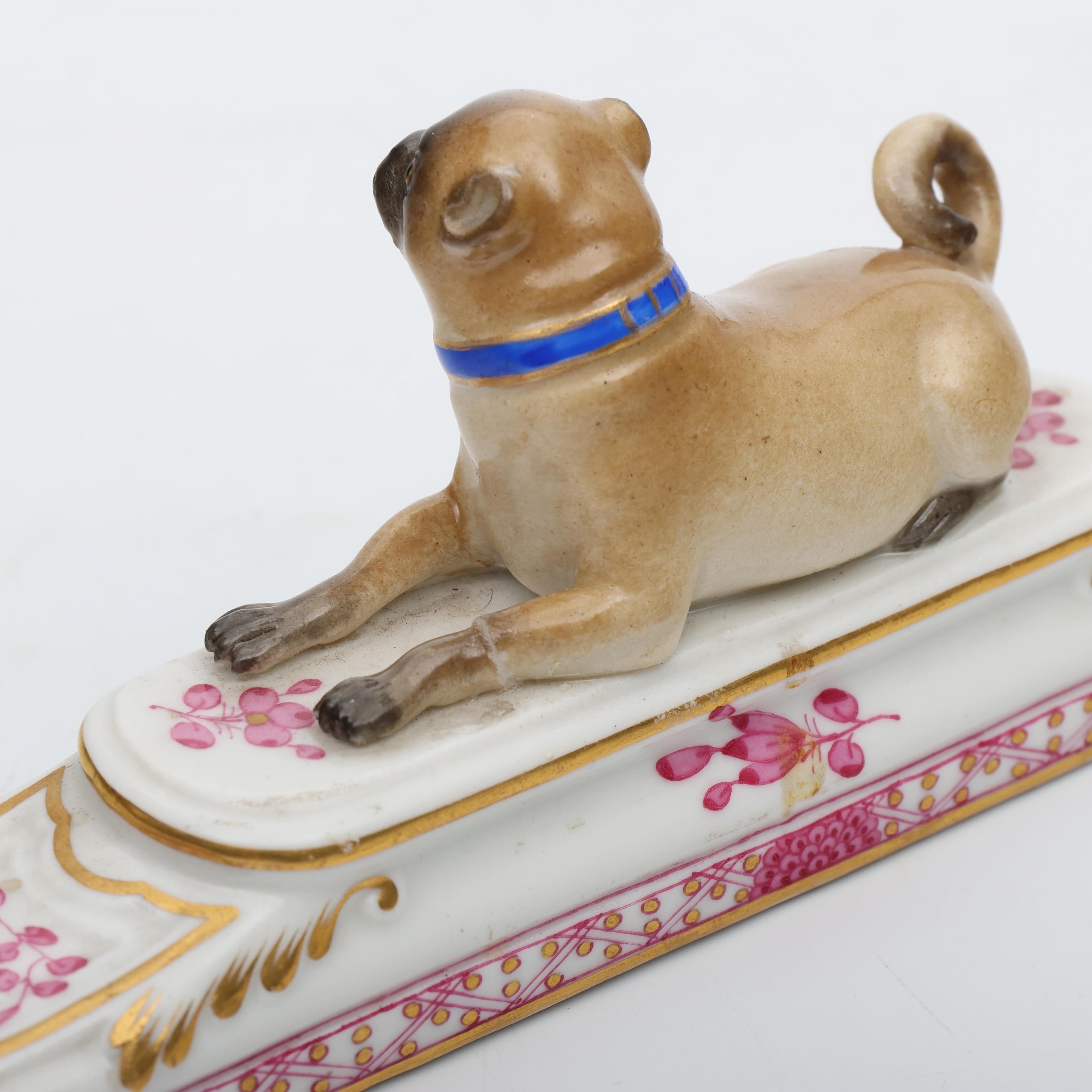 Uitgevoerd met geschilderd floraal decor en sculptuur van Mopshond. (pootje gelijmd).