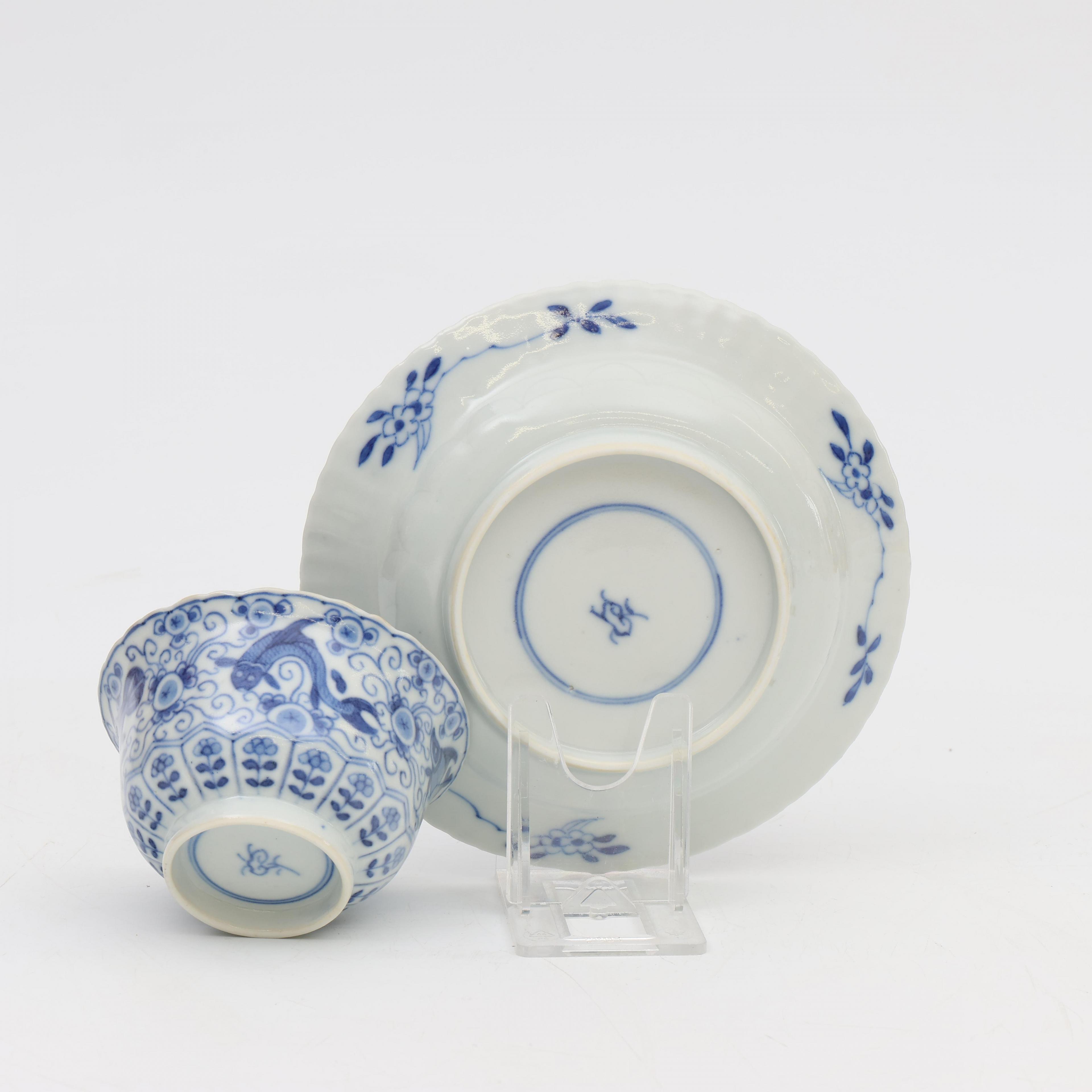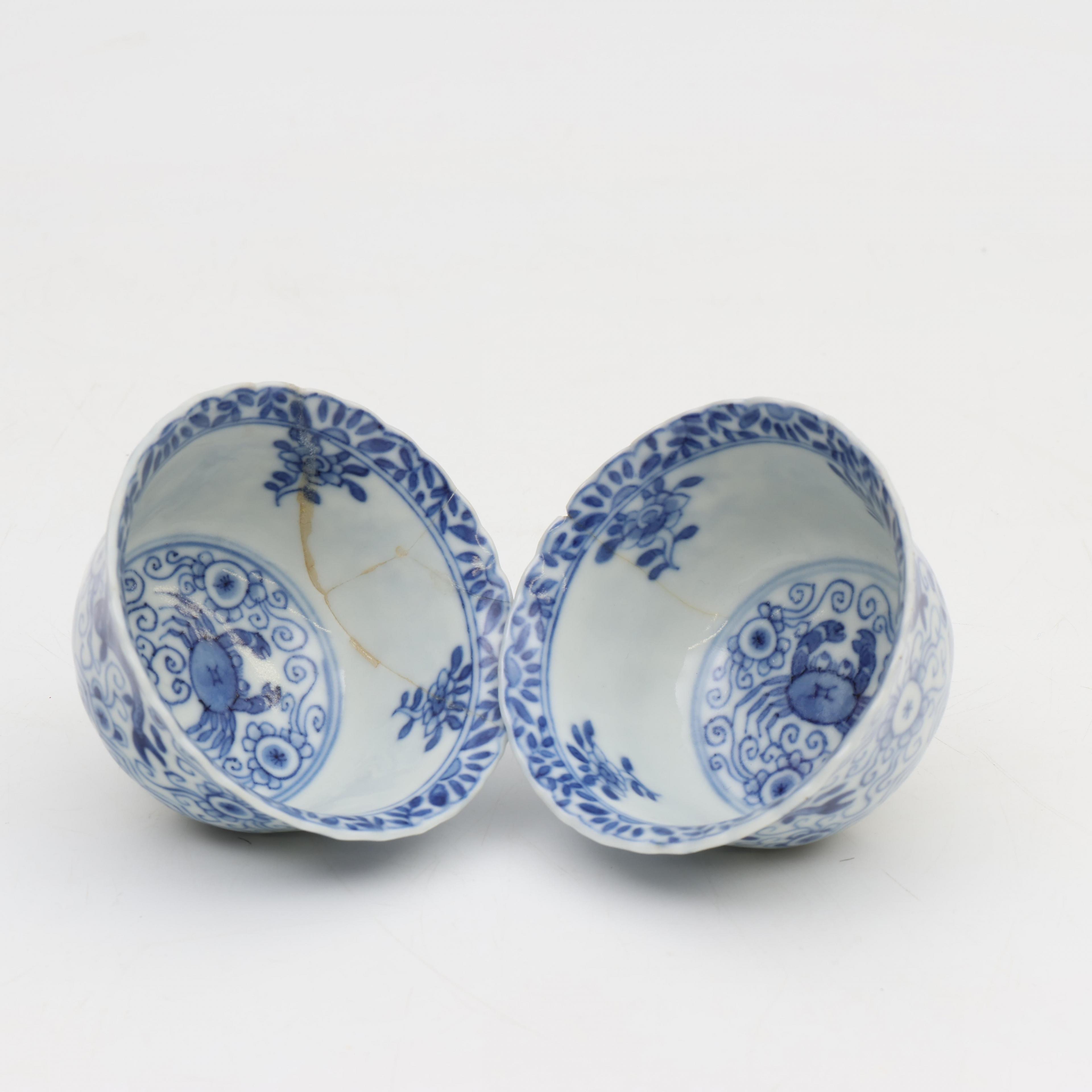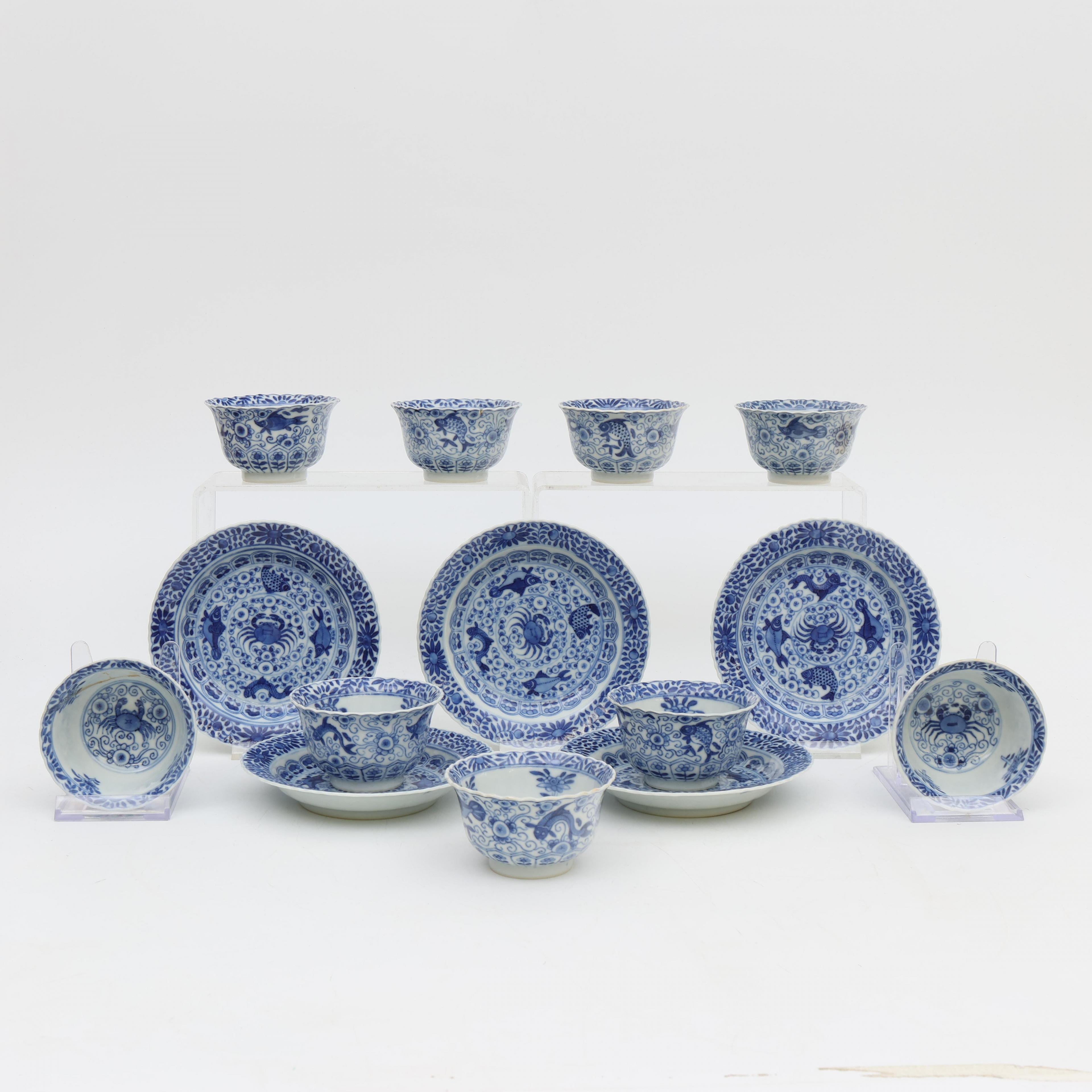 China, a set of nine blue and white porcelain 'fish and crab' cups and five saucers, 19th century,