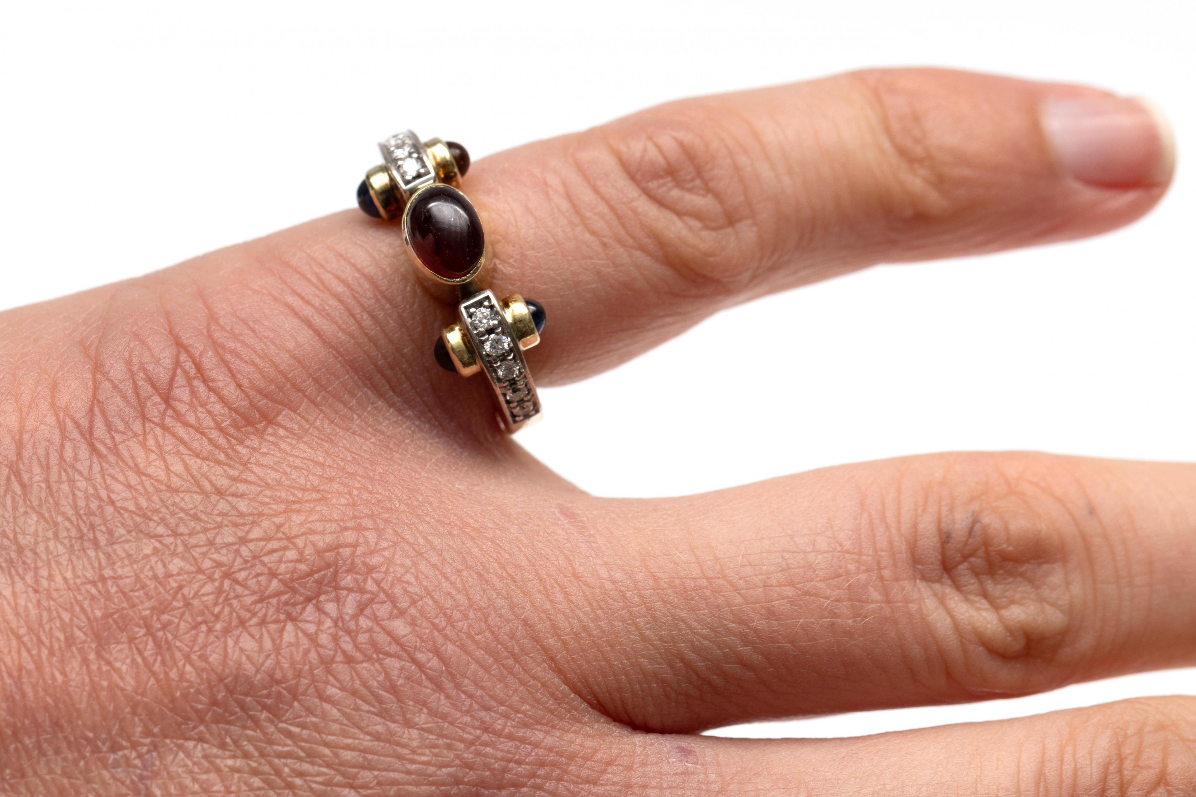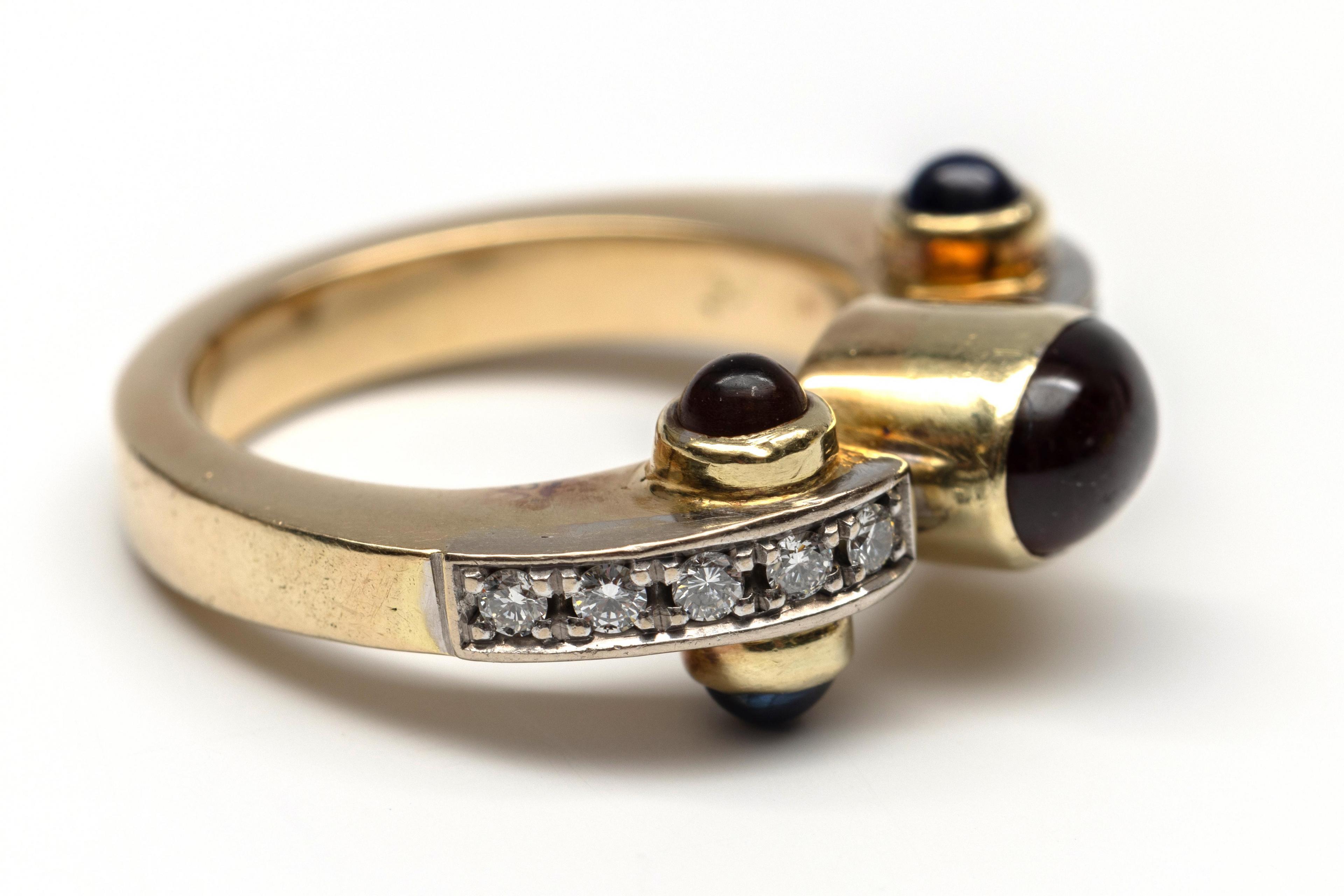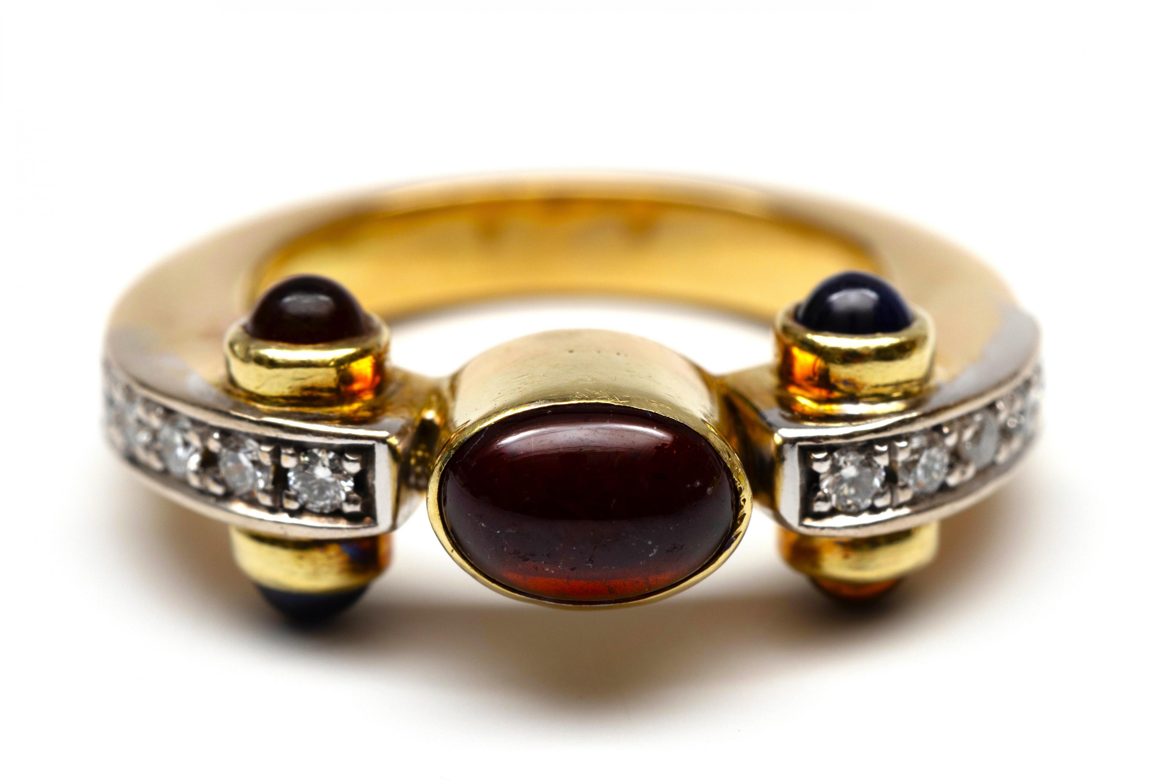 Gold ring, centrally set with an oval cabochon-cut garnet flanked by a row of brilliant-cut diamonds. The shoulders on the sides are set with a cabochon-cut sapphire and a cabochon-cut citrine. Total diamond weight approx. 0.10 ct.