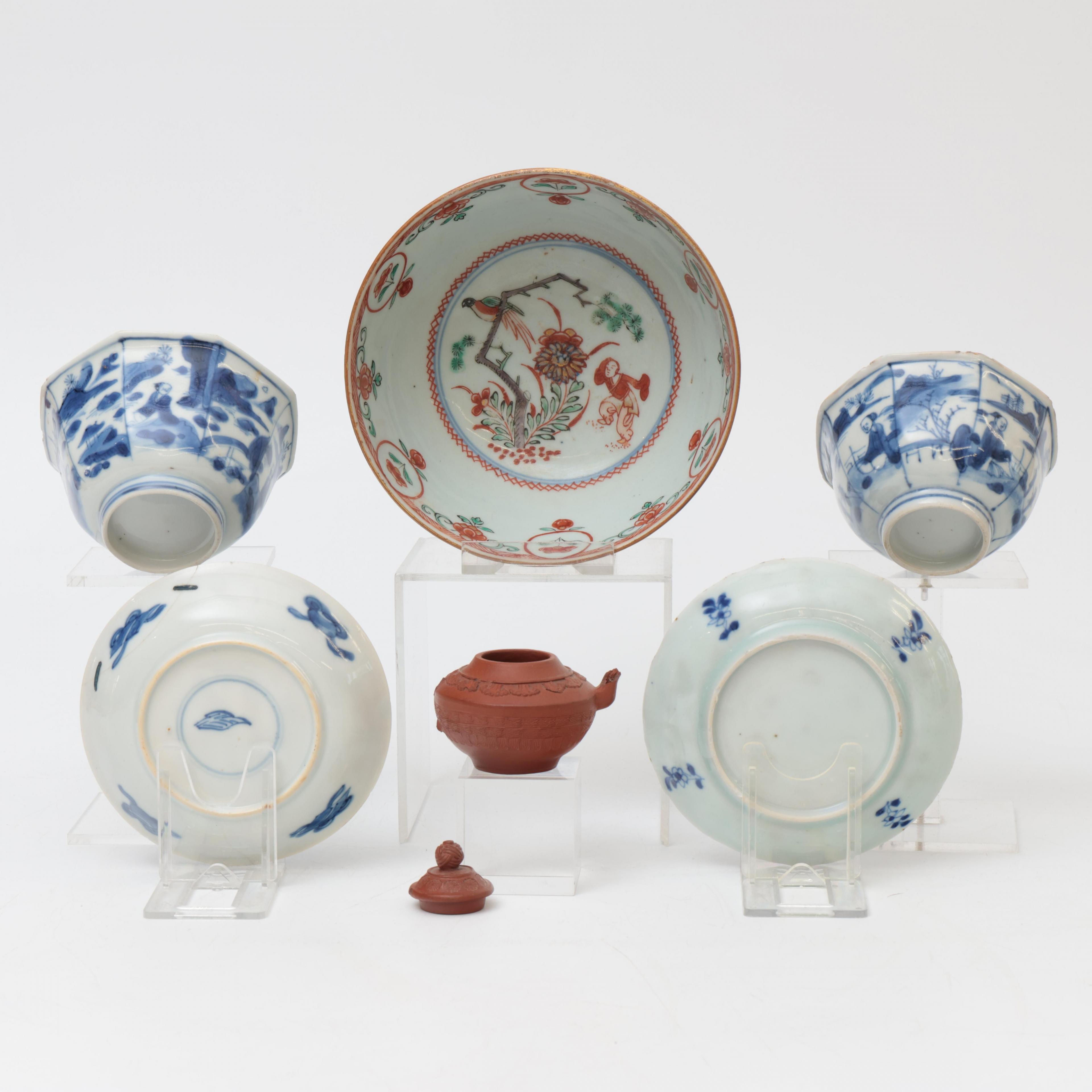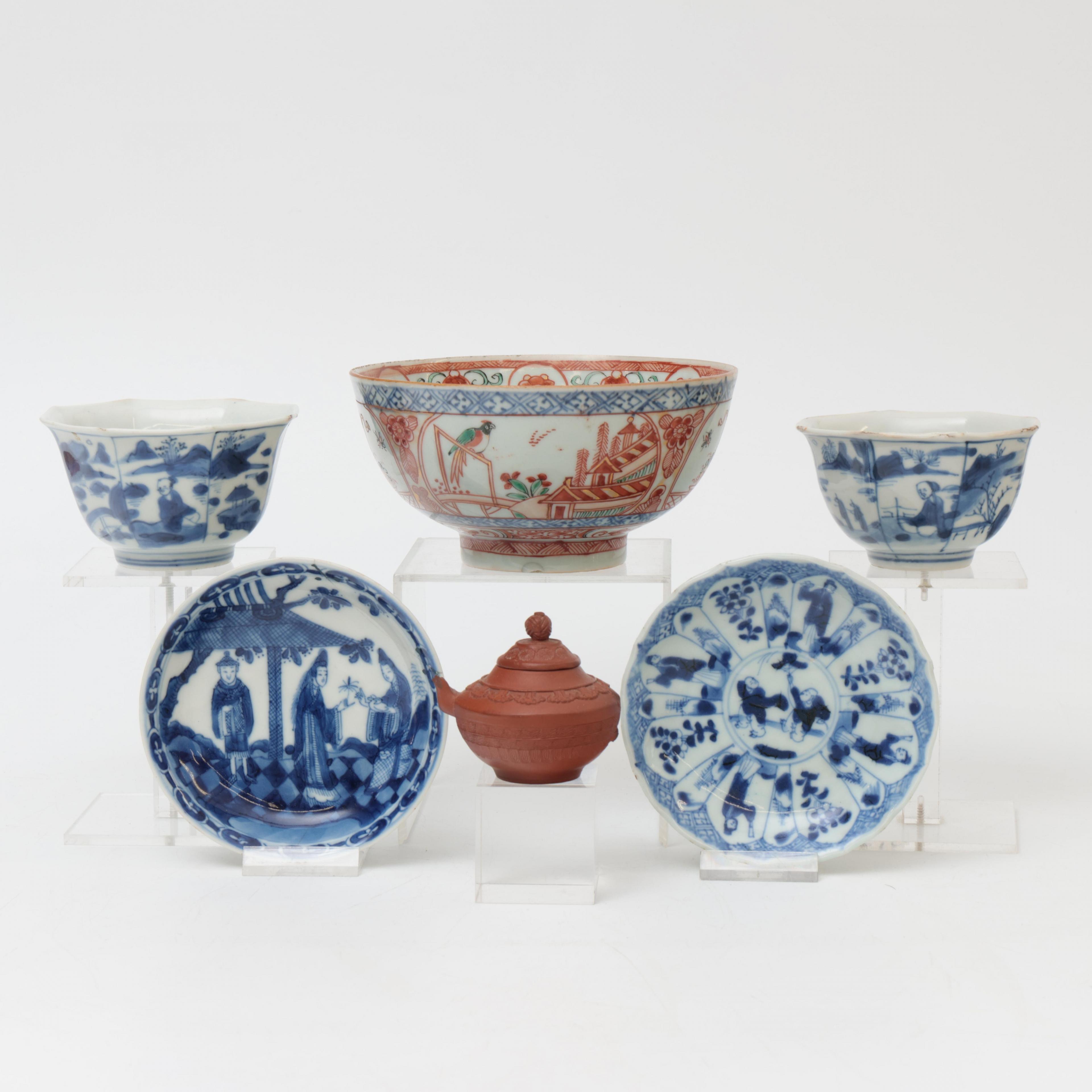 comprising two blue and white cups and saucers, an 'Amsterdams Bont' bowl and an Yixing teapot (teapot with broken spout and handle broken away)