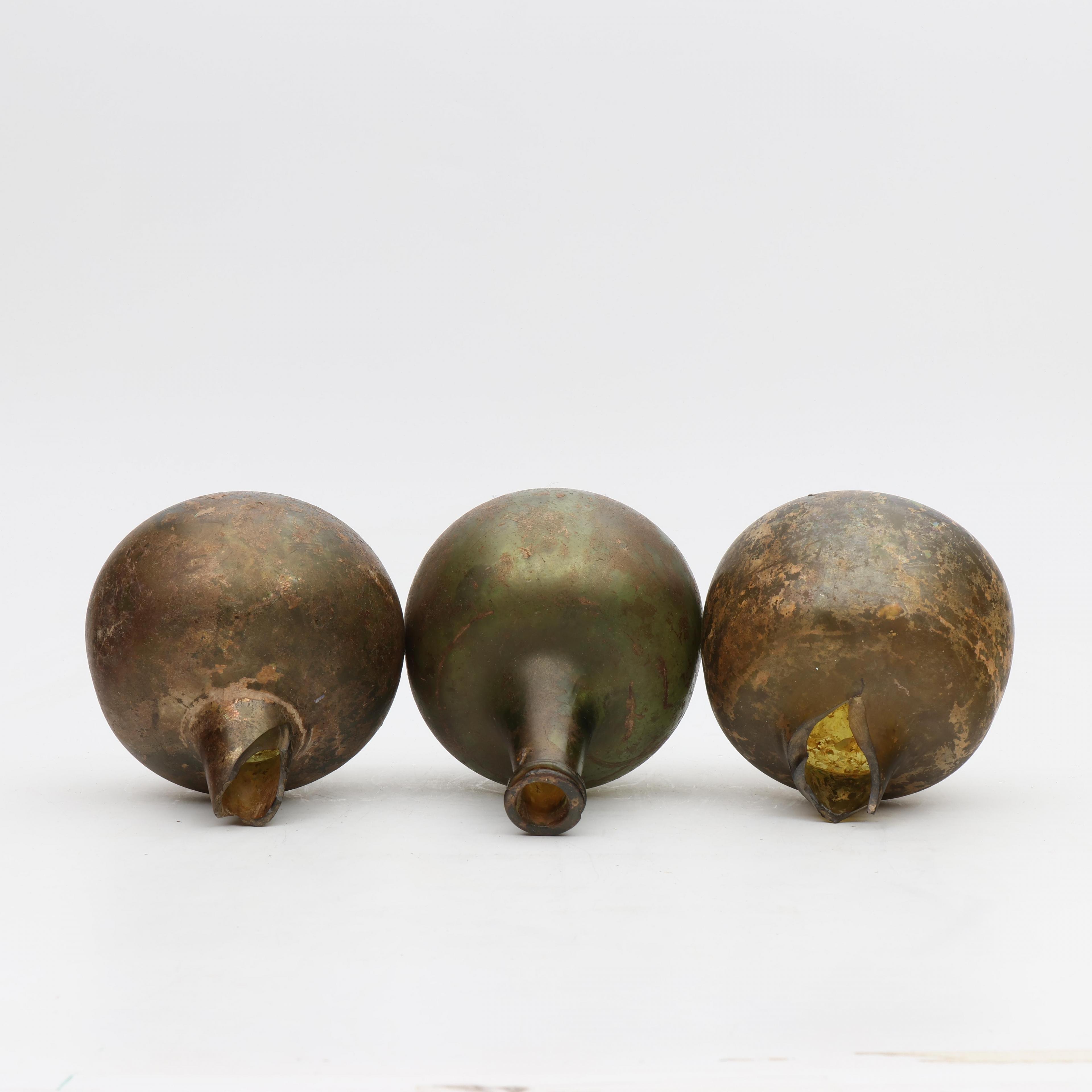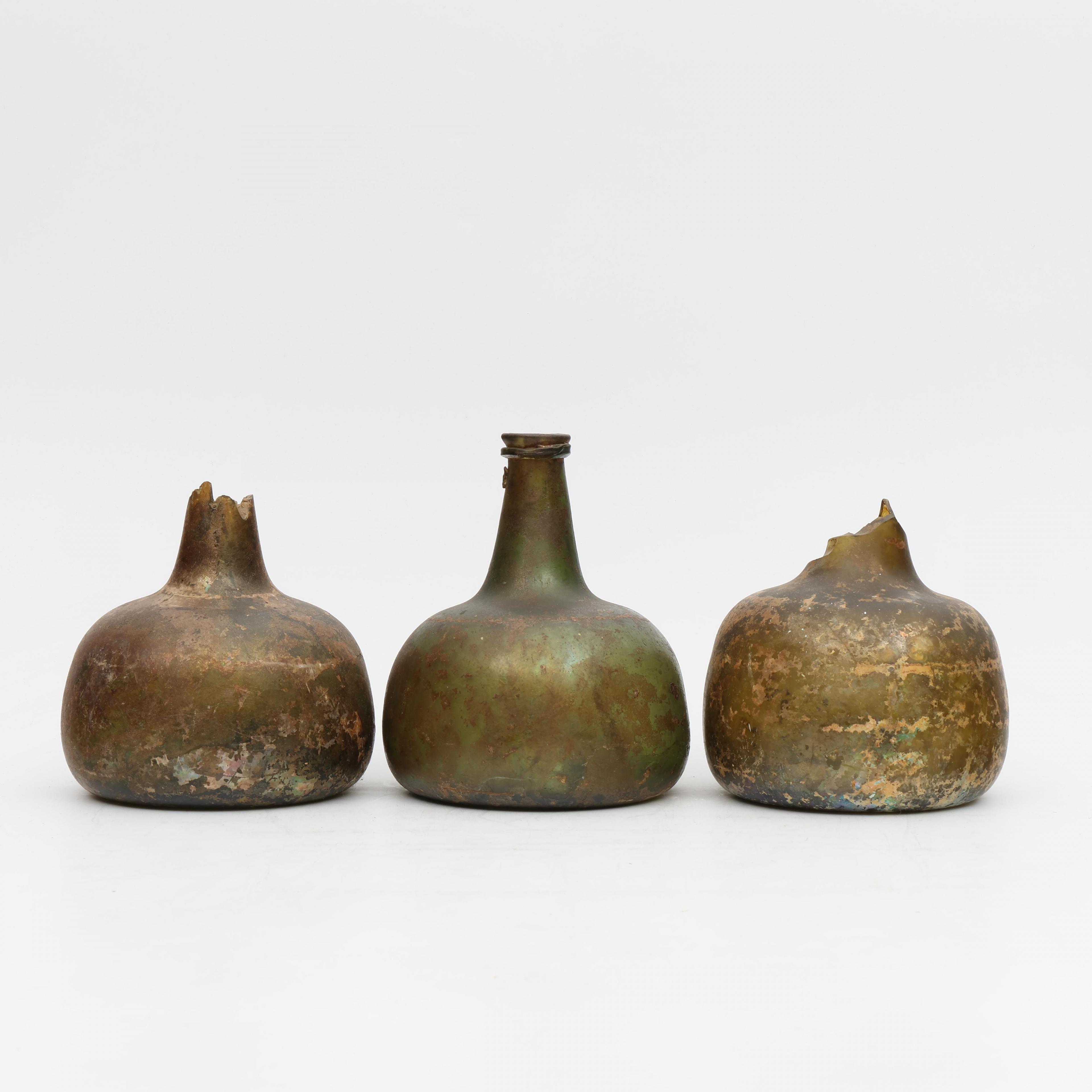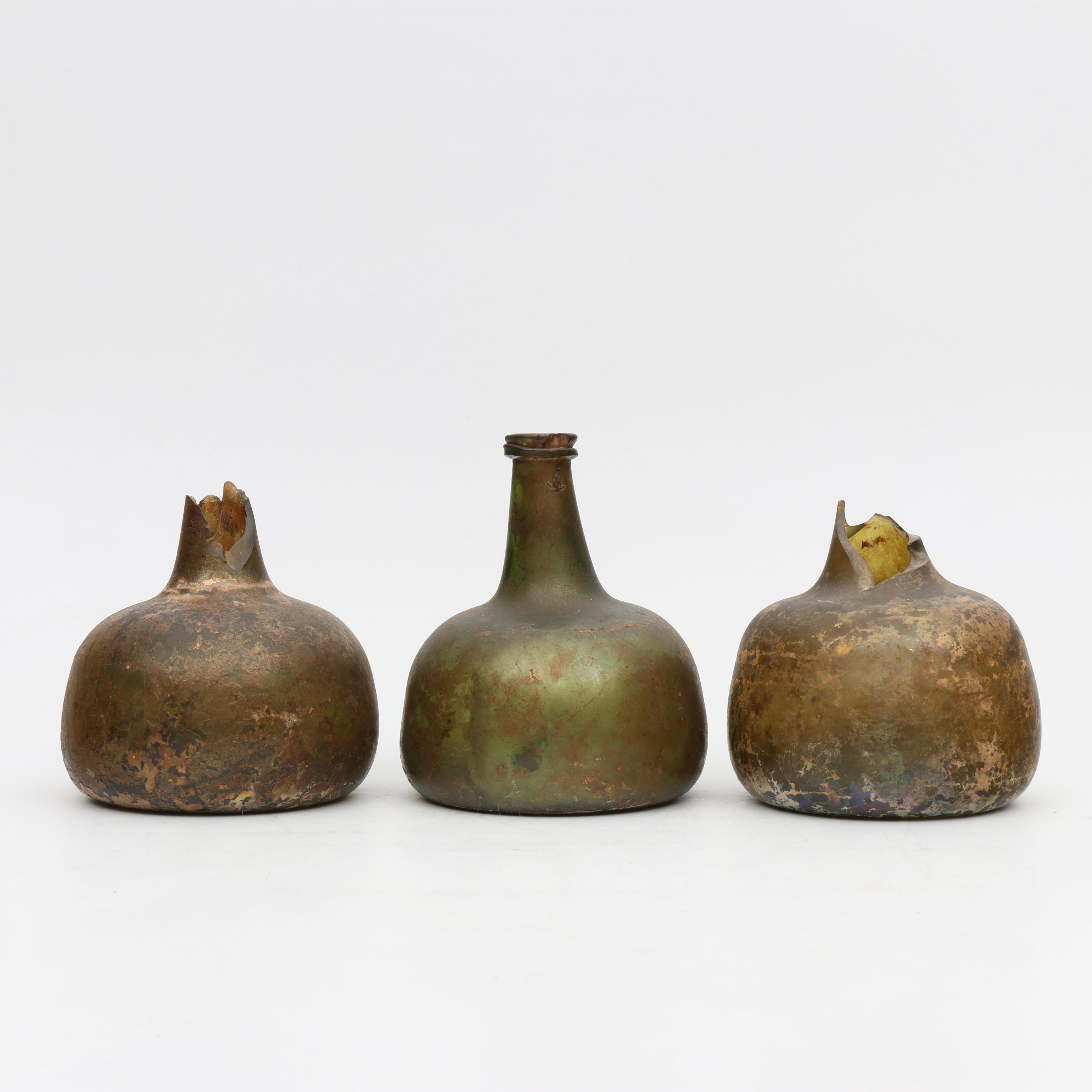 Drie glazen wijnflessen 'kattekoppen', 18e eeuw;