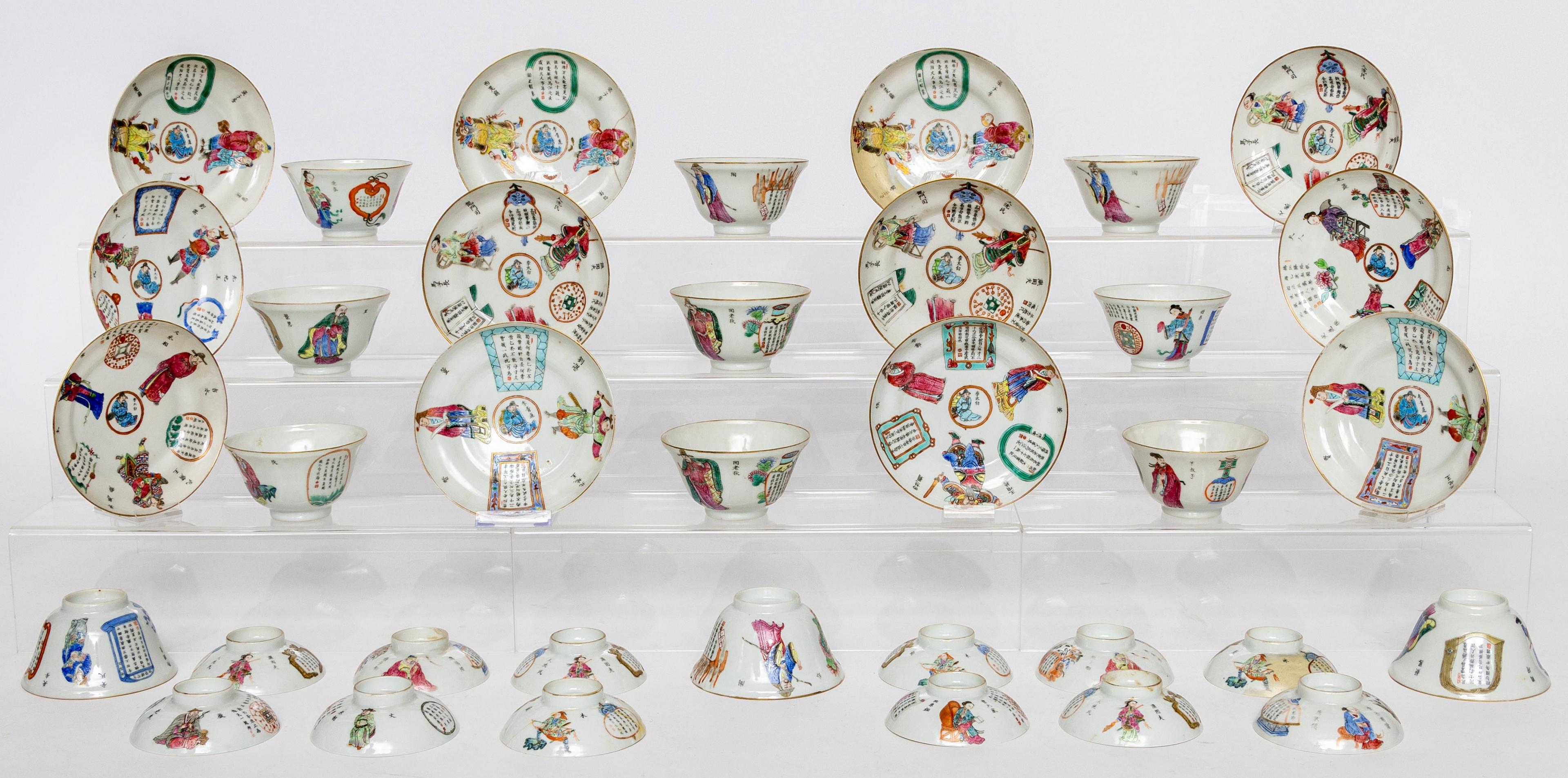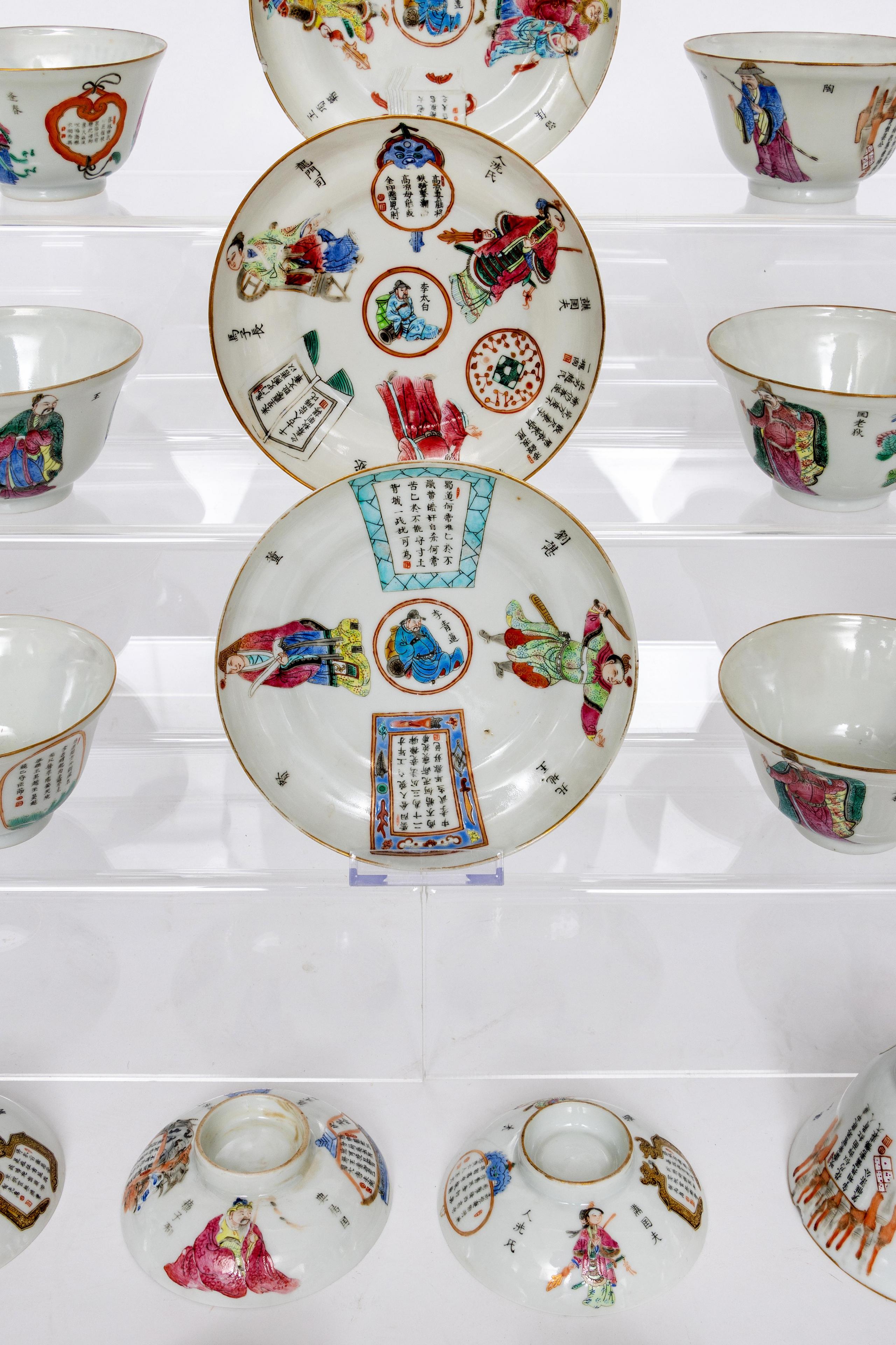each variously painted with figures and calligraphies from 'The Book of Peerless Heroes' (various chips, hairlines and damages and restorations)