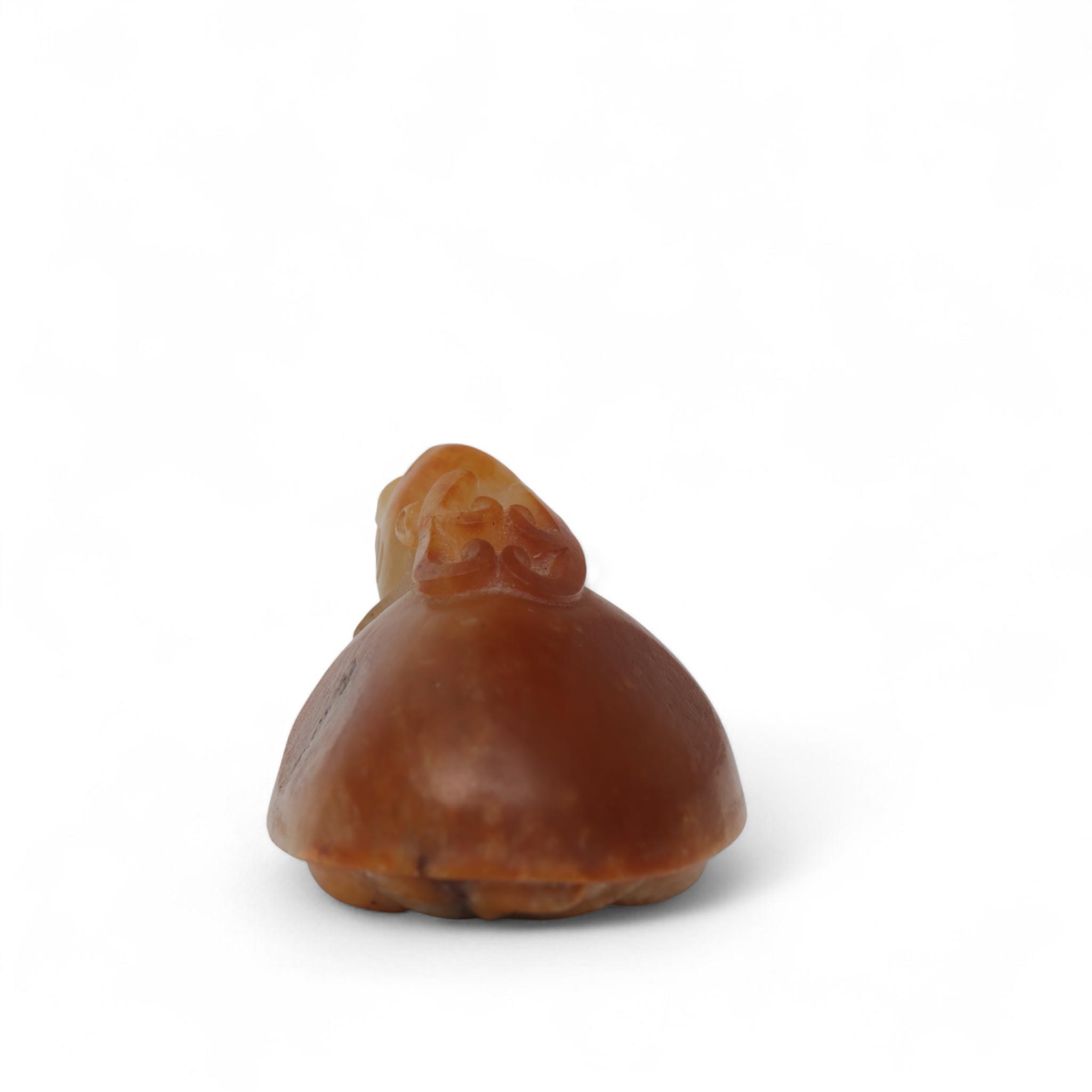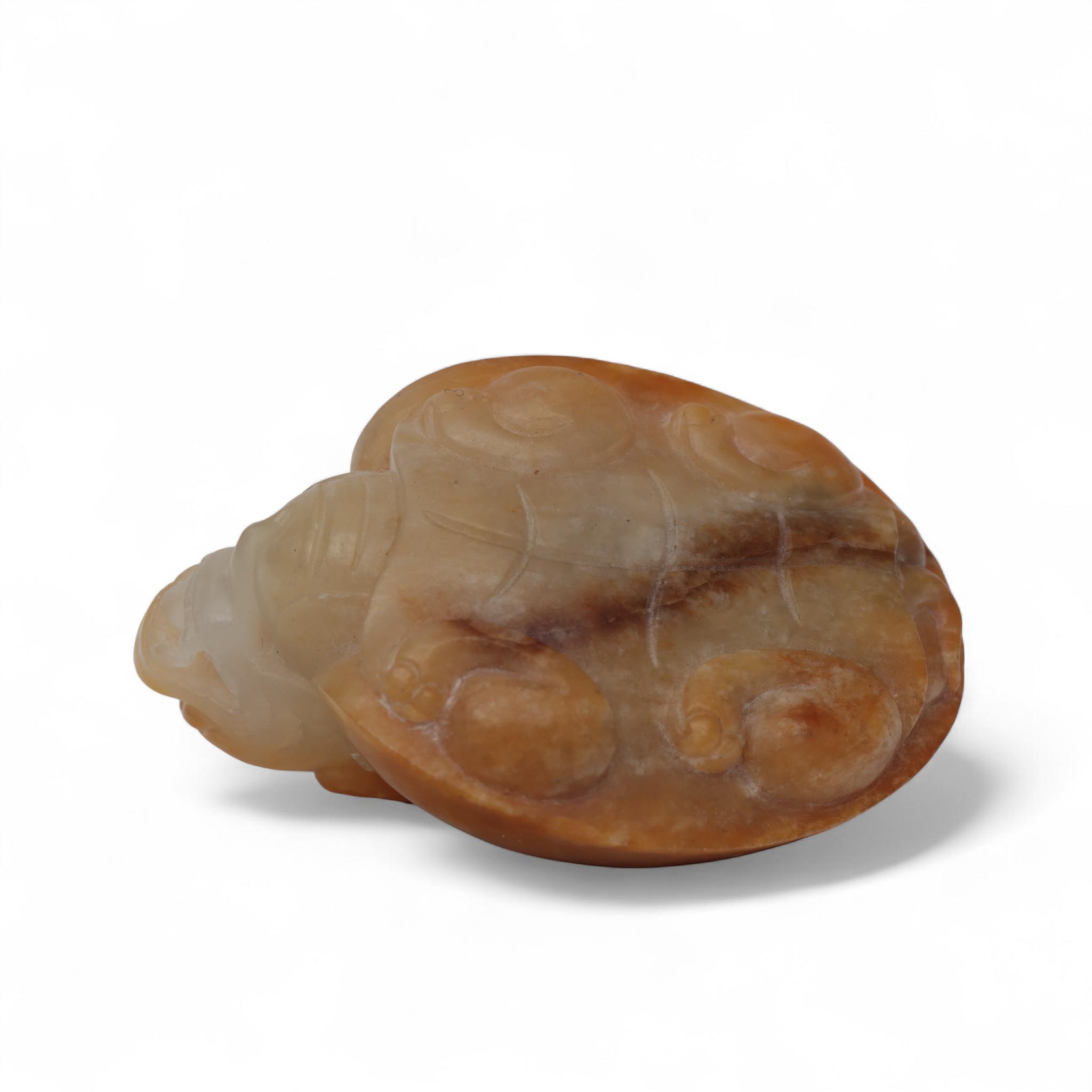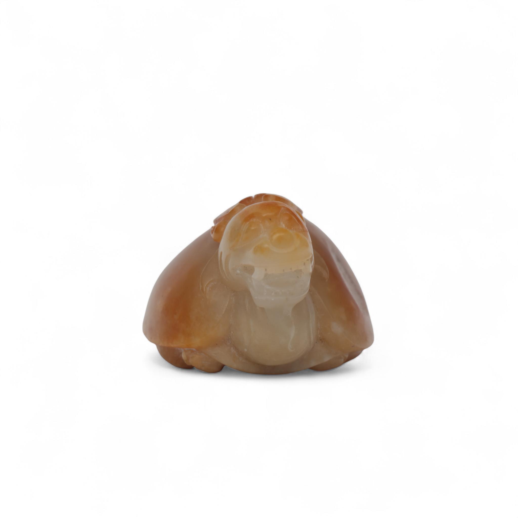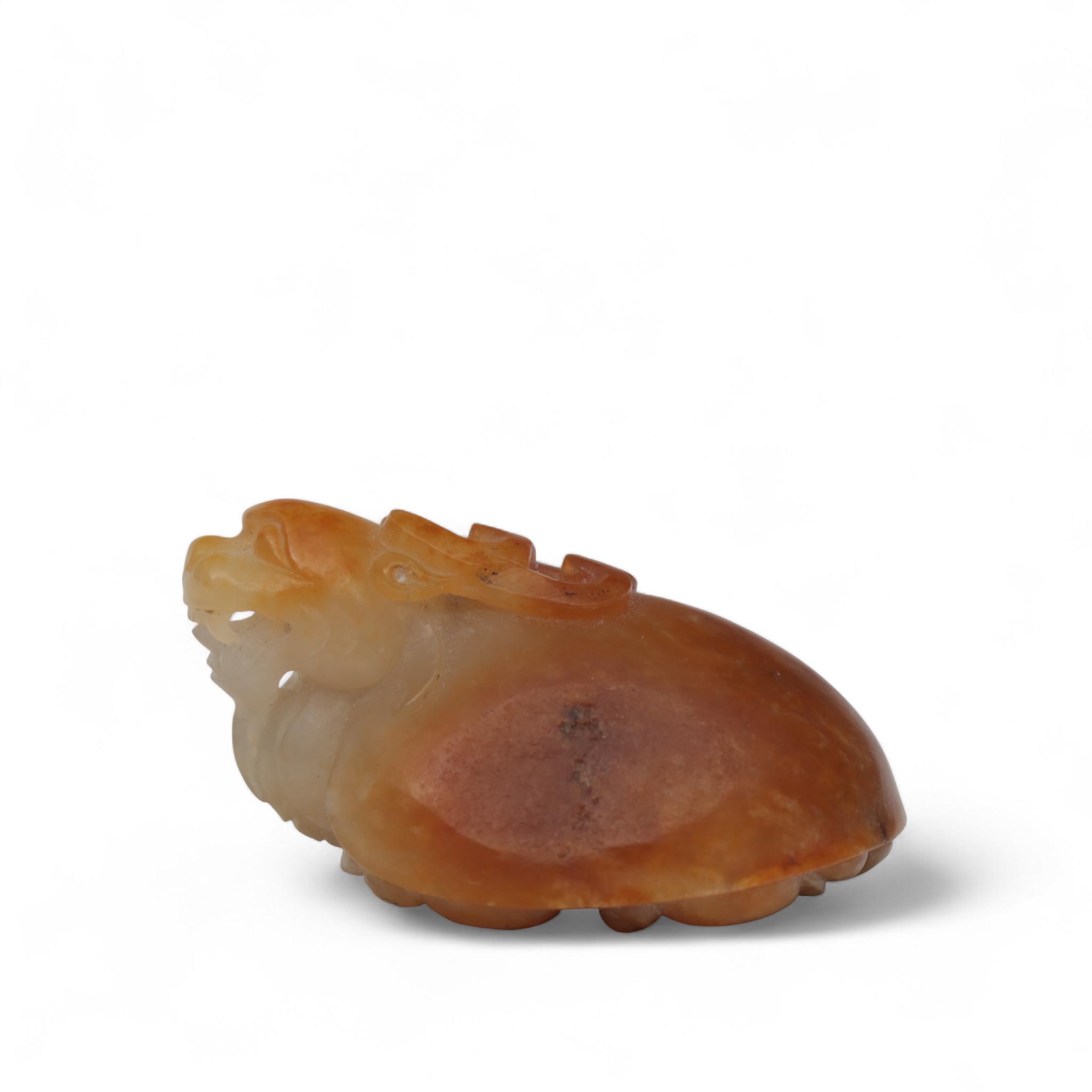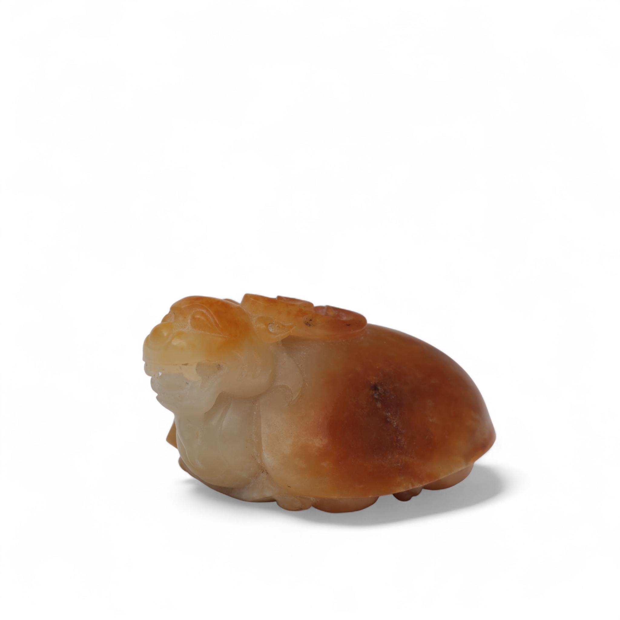 carved with open mouth and horns resting on its tortoise shell back, the stone of a pale tone with large russet areas