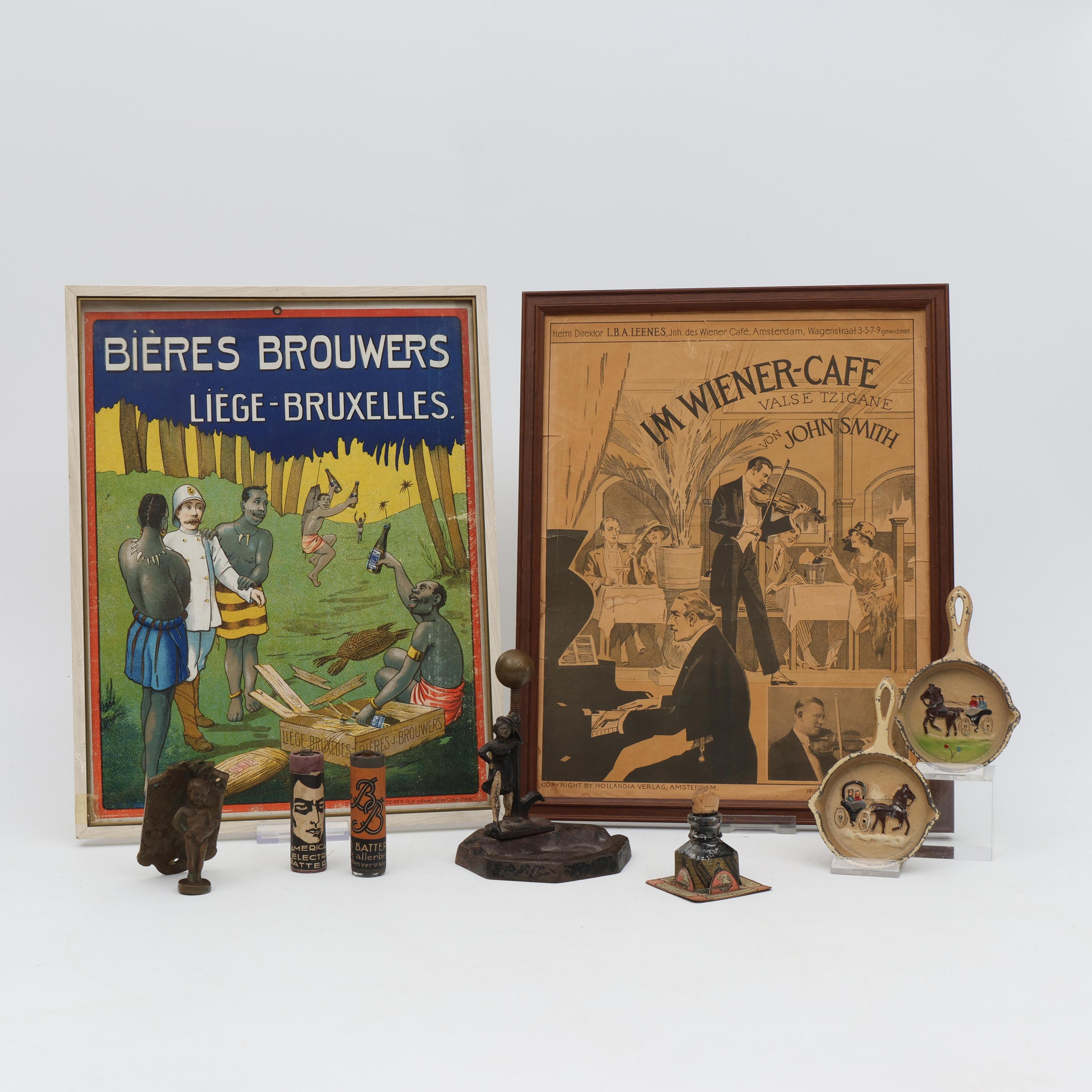 w.b. reclameplaat Bières Brouwers Liége Bruxelles, twee batterijen, inktpot en manneke pis.