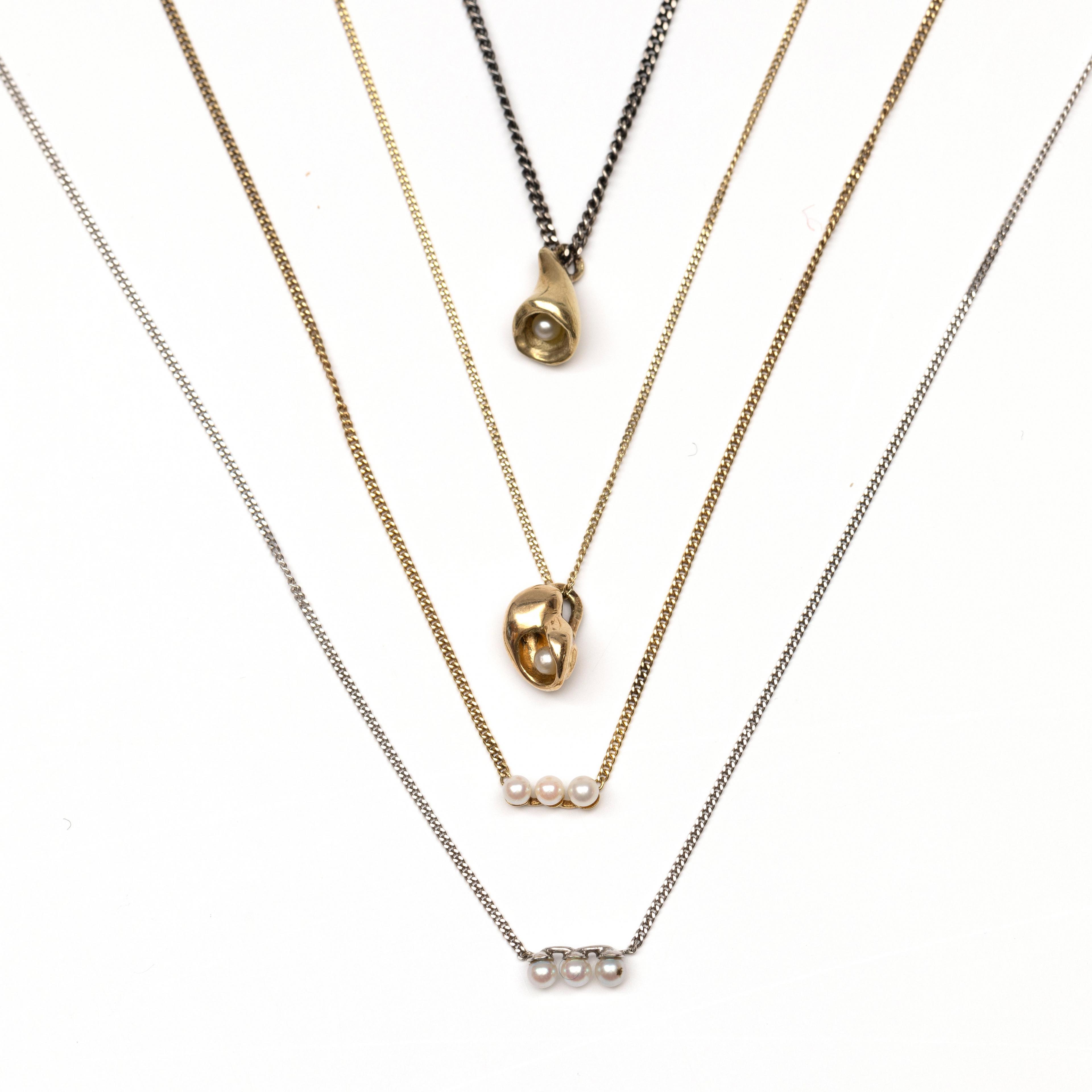 Four 14 k. gold pendants, all set with pearls. Three on a fine gold chain necklace, one on a silver one.