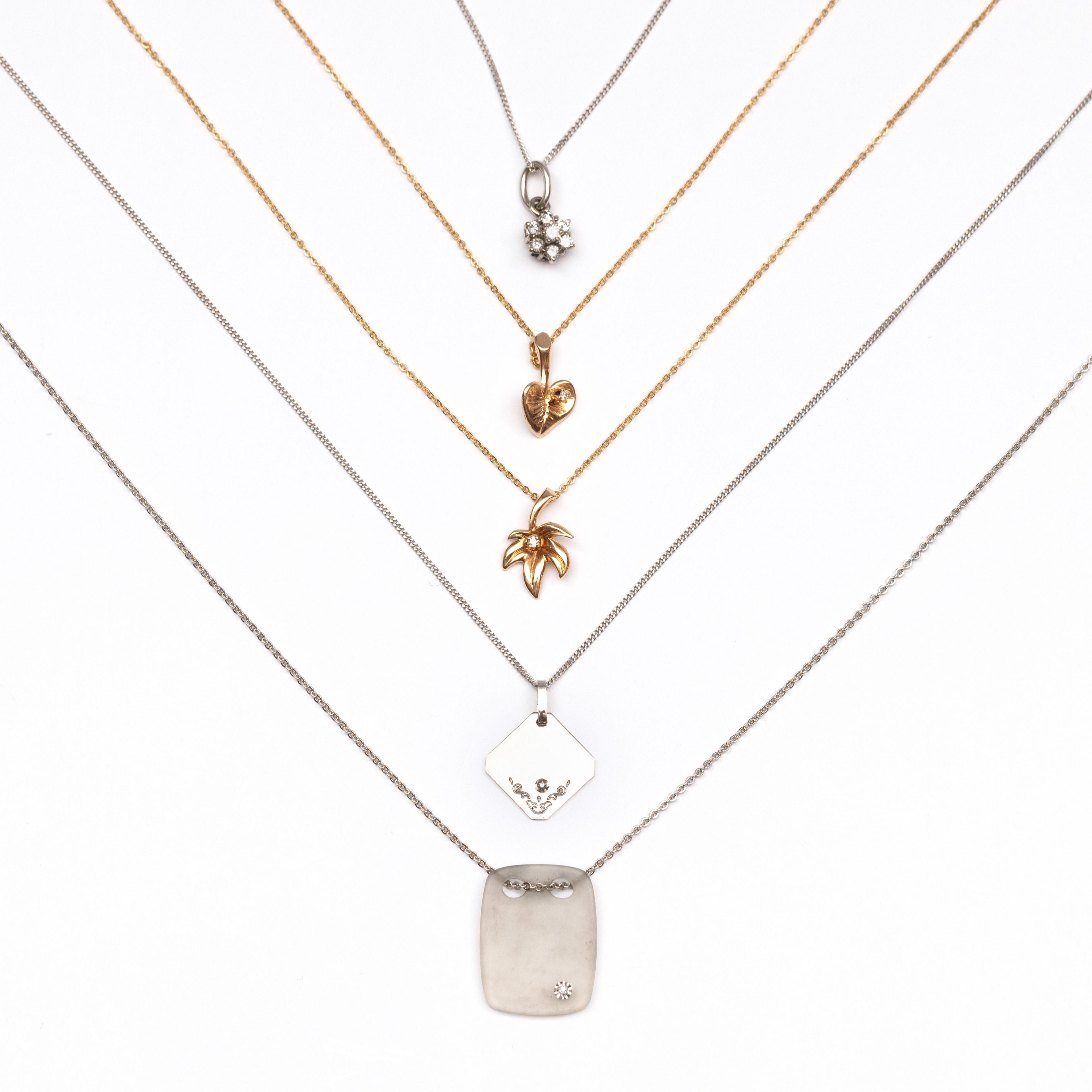 Five delicate gold necklaces. In 14k and 18k gold. Each with a pendant set with a small diamond.