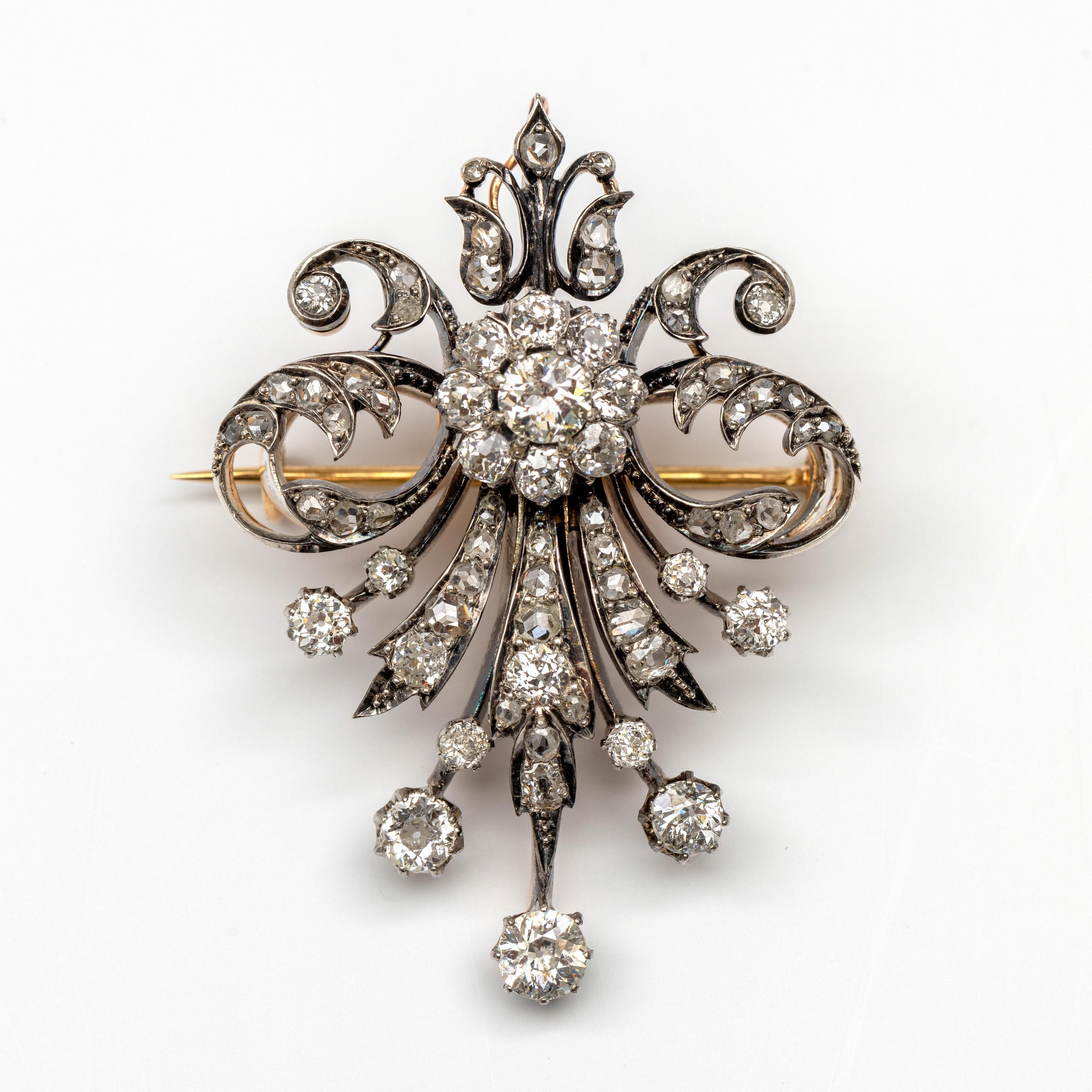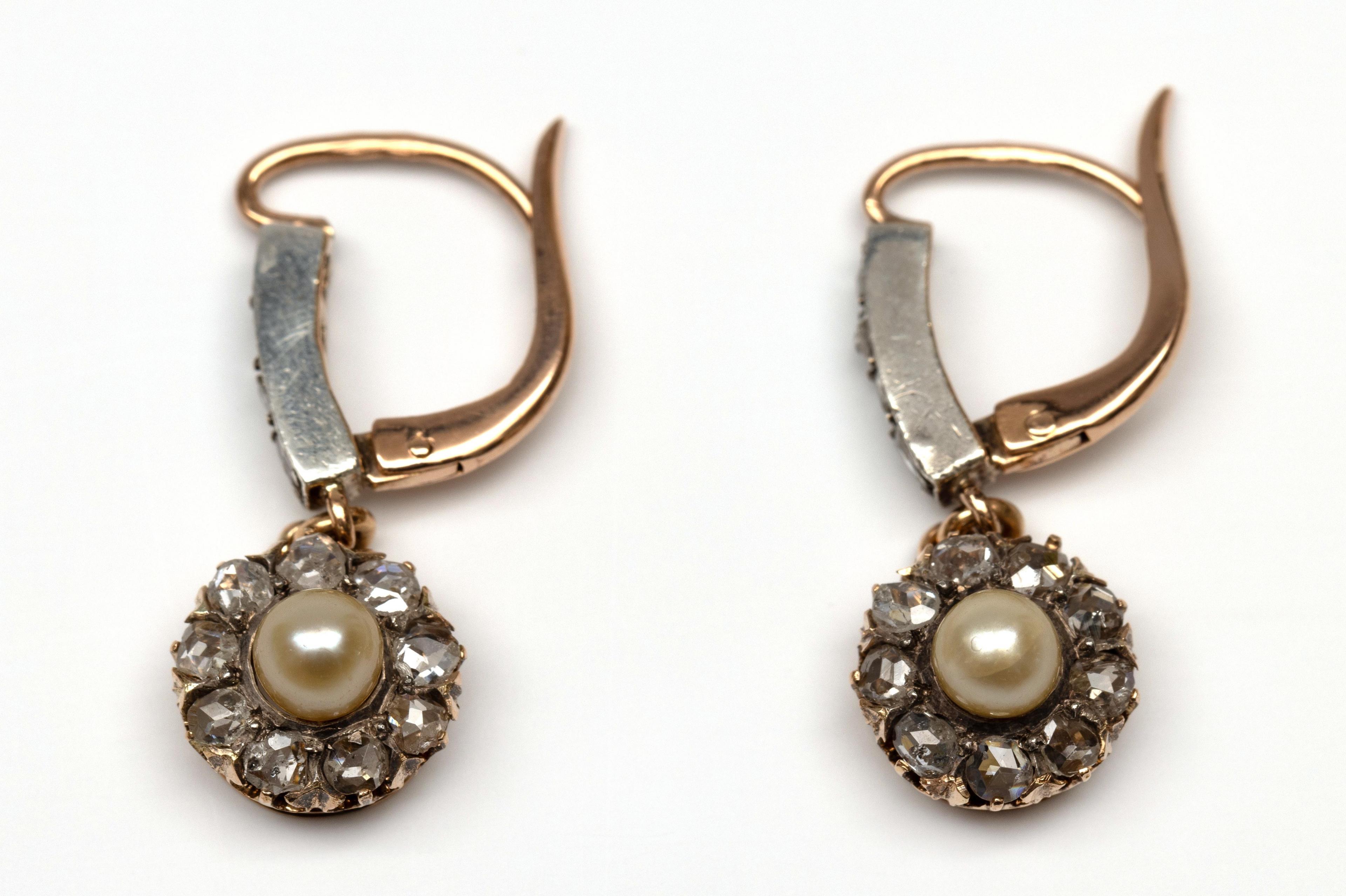 14 k. gold and silver brooch, also a pendant, and a pair of earrings, circa 1900. The brooch with a rosette in the centre, decorated with scrolls and leaf motifs. Set with old brilliant and rose-cut diamonds with a total weight of approximately 4.00 ct. The brooching removable. The earrings set with a yellow-white pearl surrounded by rose-cut diamonds, above which is a vertical row of smaller rose-cut diamonds. Presented in a box of L. Jourdain, Namur.