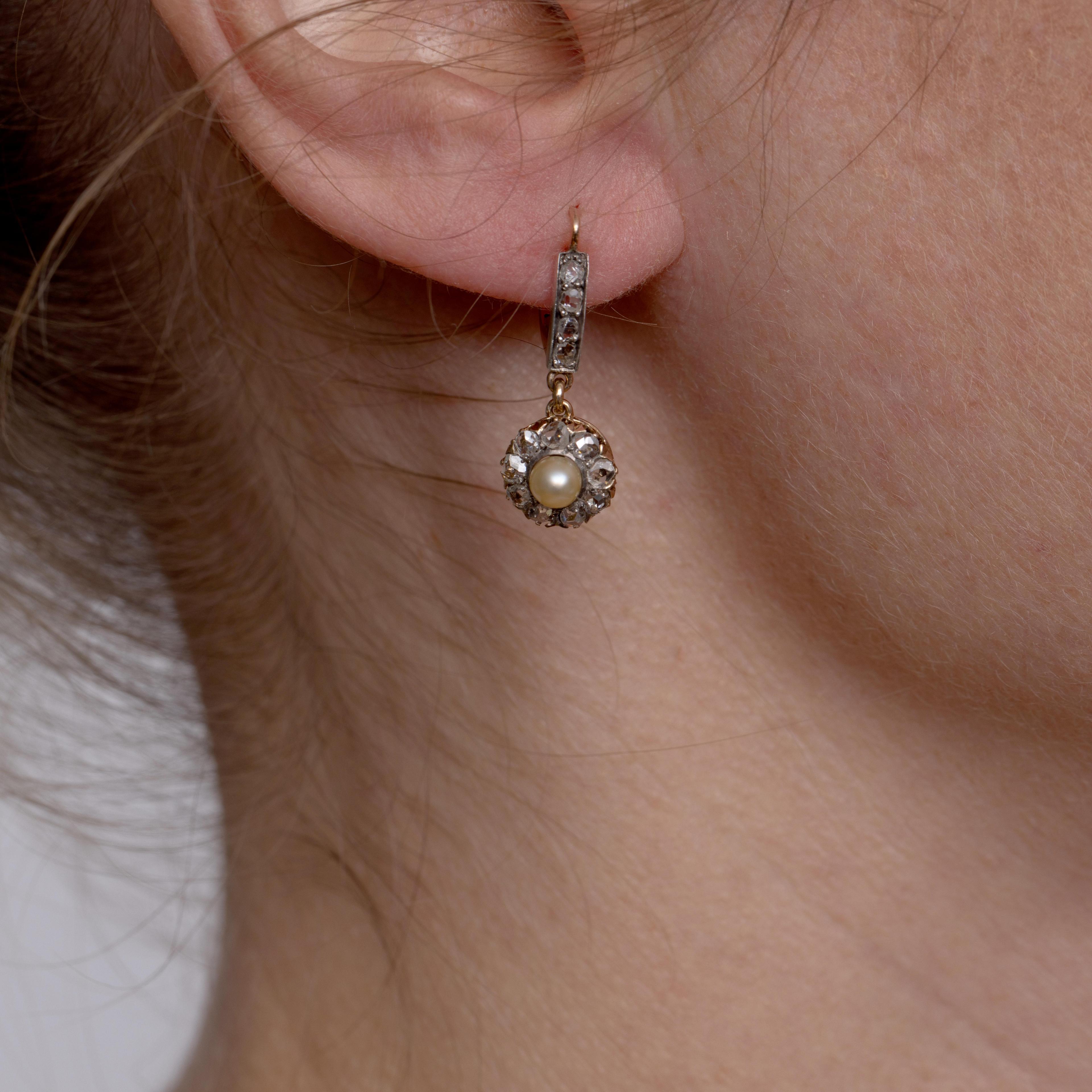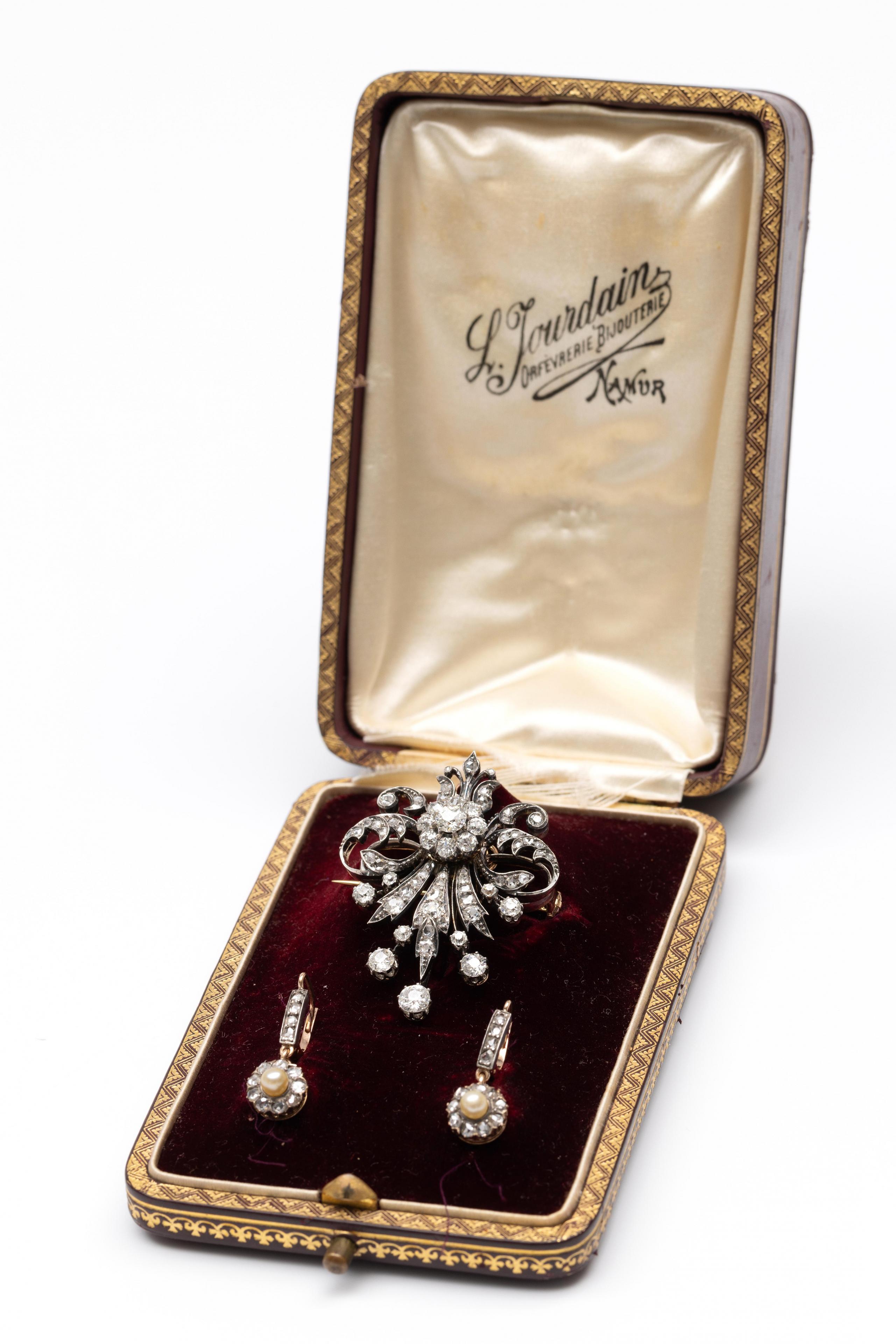 De broche met een rozet in het midden en gedecoreerd met krullen en bladmotieven. Bezet met oud briljant en roosgeslepen diamanten met een totaalgewicht van ca. 4.00 ct. De brochering demontabel. De oorbellen bezet met een geel-witte parel in een entourage van roosgeslepen diamant, waarboven een verticale rij van eveneens kleine roosgeslepen diamanten. In een doosje van L. Jourdain, Namur