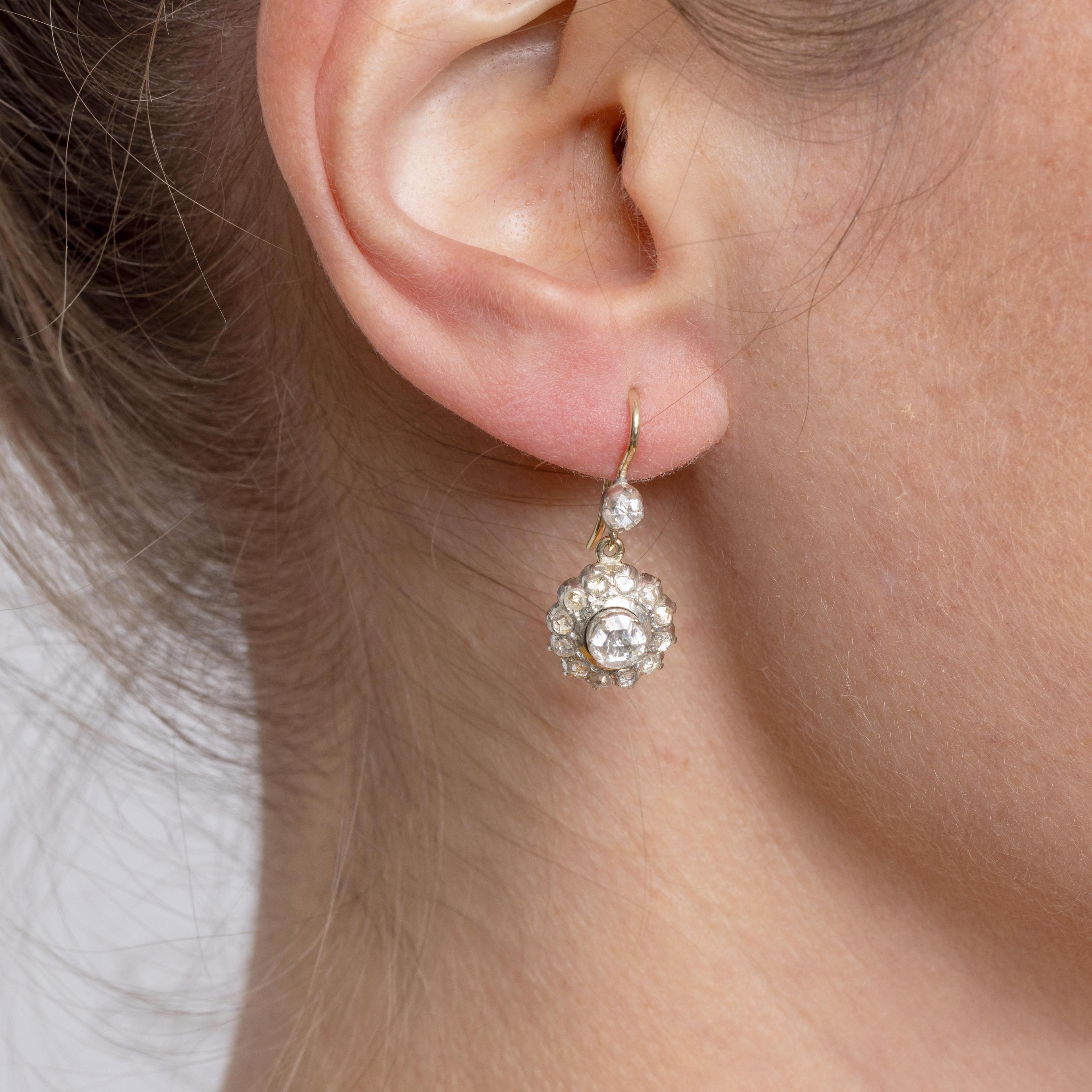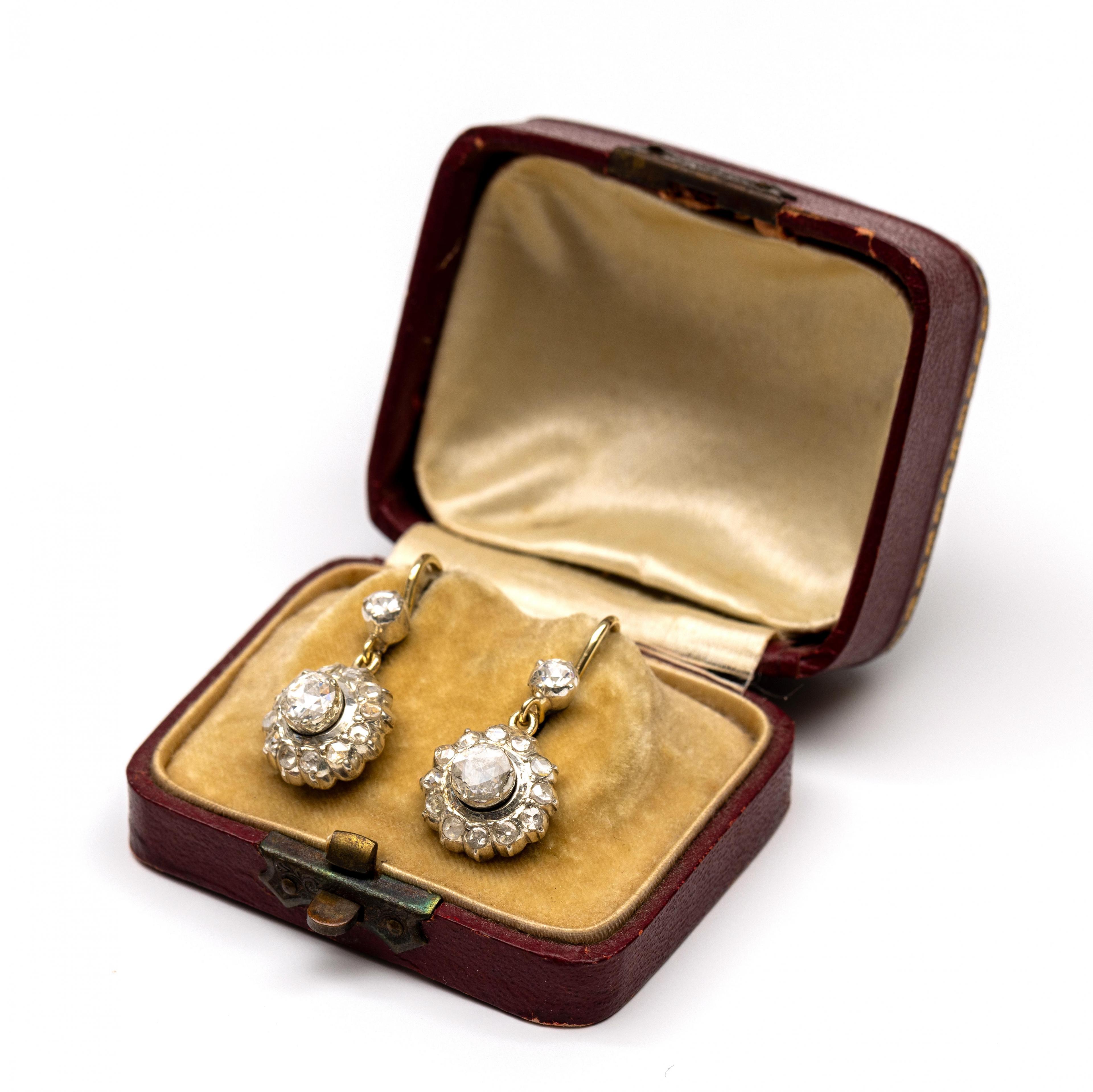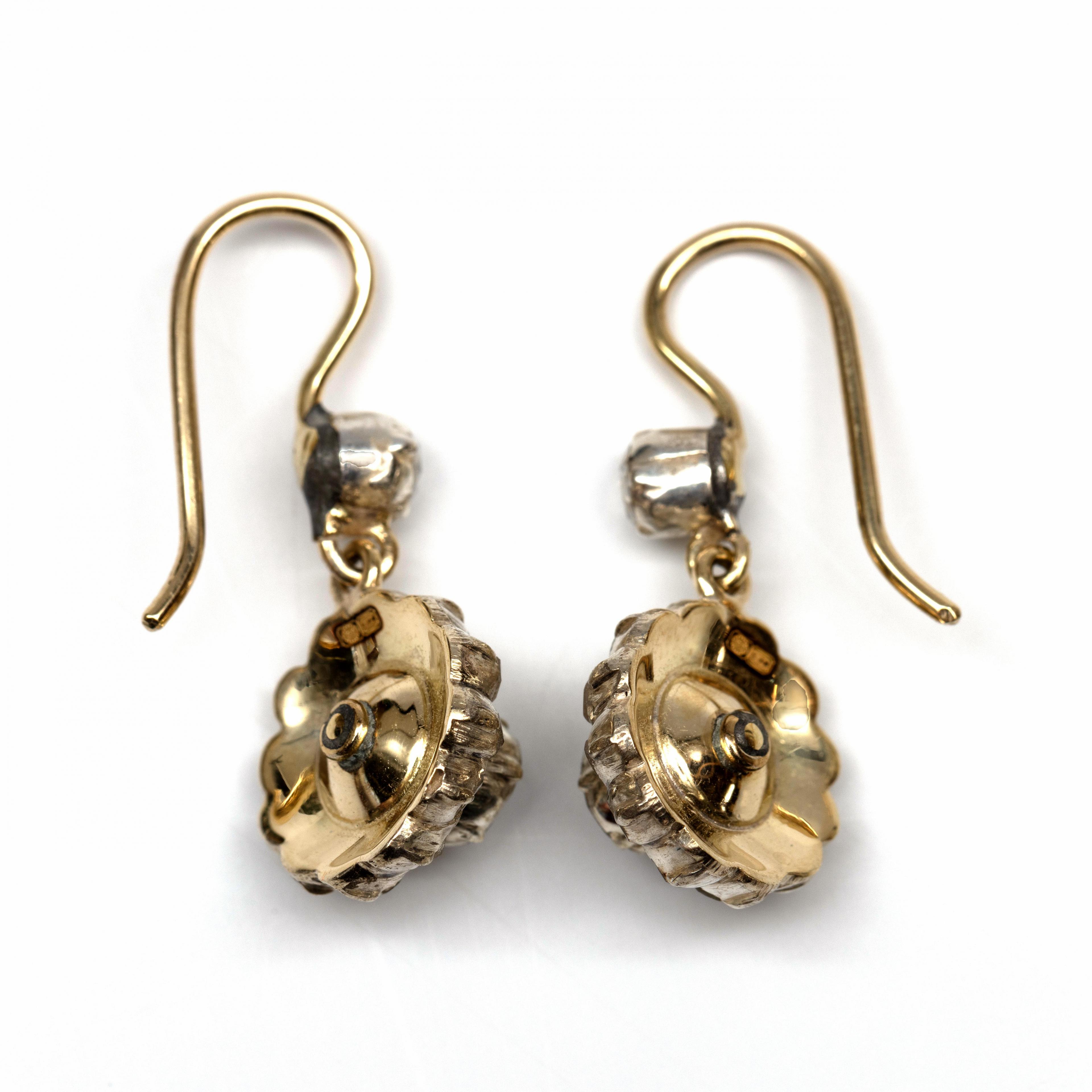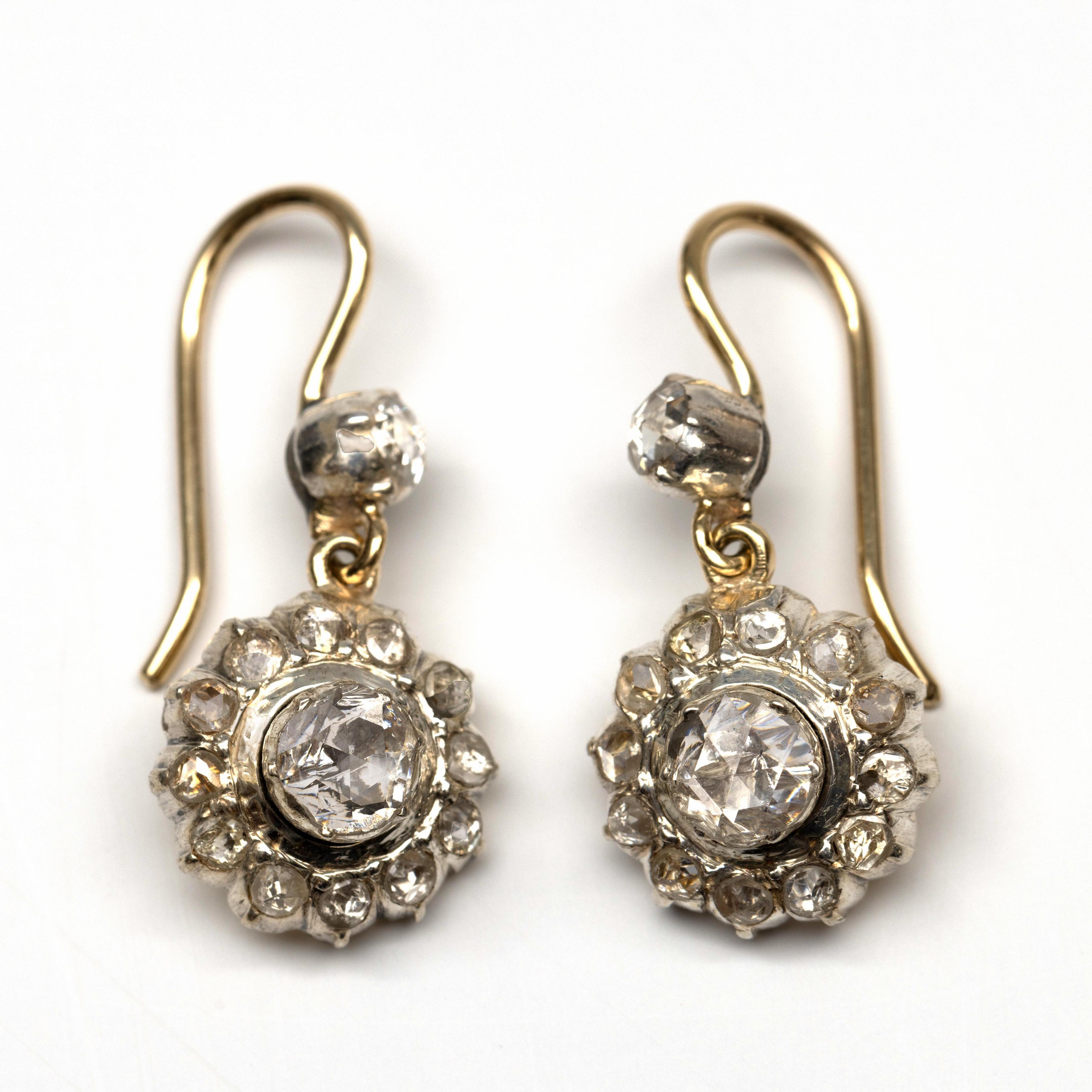 14 k. gold and silver earrings. Rosette-shaped, set with rose-cut diamonds. The center stone is approximately 5 mm in diameter. Presented in a reddish-brown leather box.