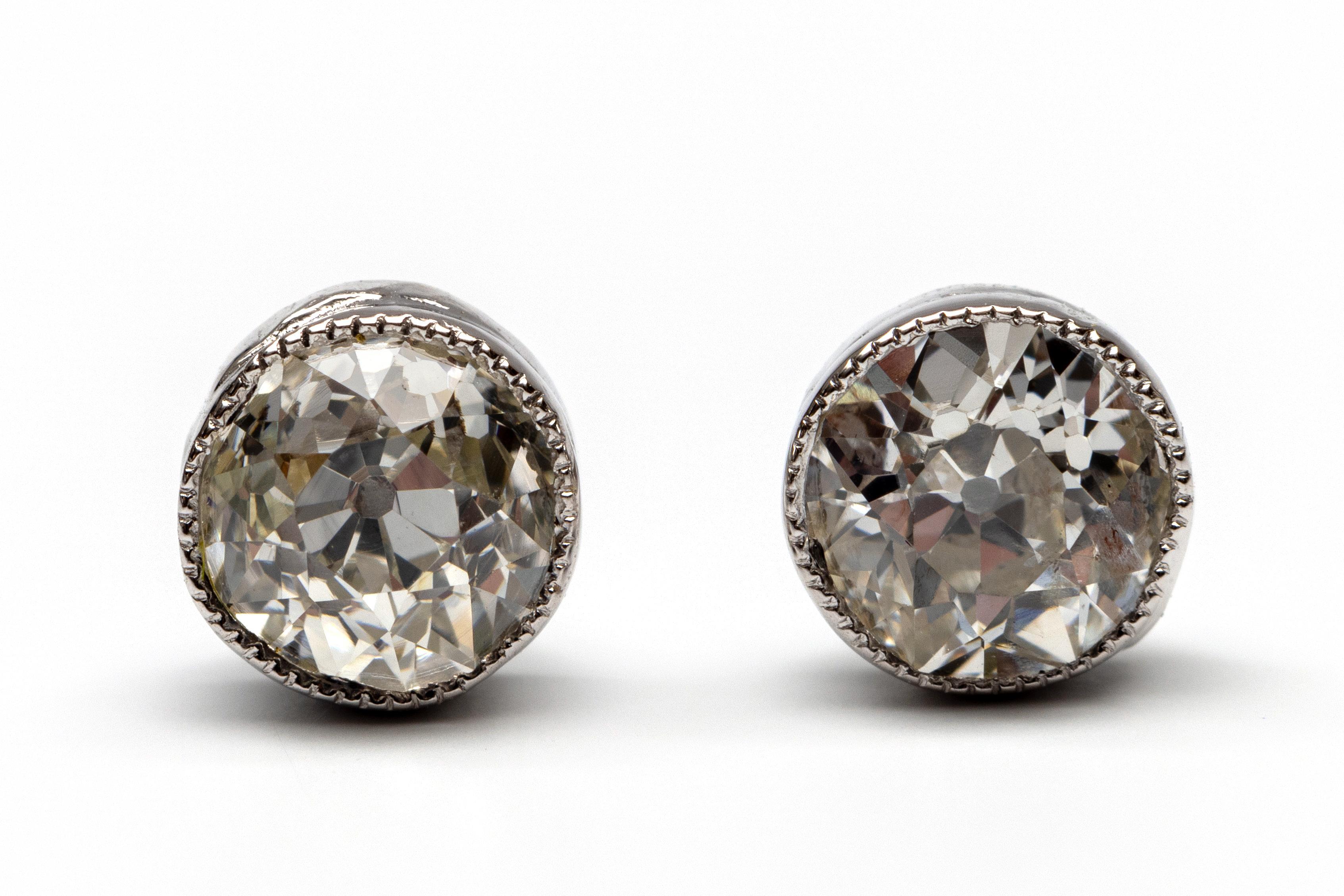 Elk bezet met een oud briljant geslepen diamant met een totaalgewicht van ca. 0.80 ct. In een bruin lederen doosje