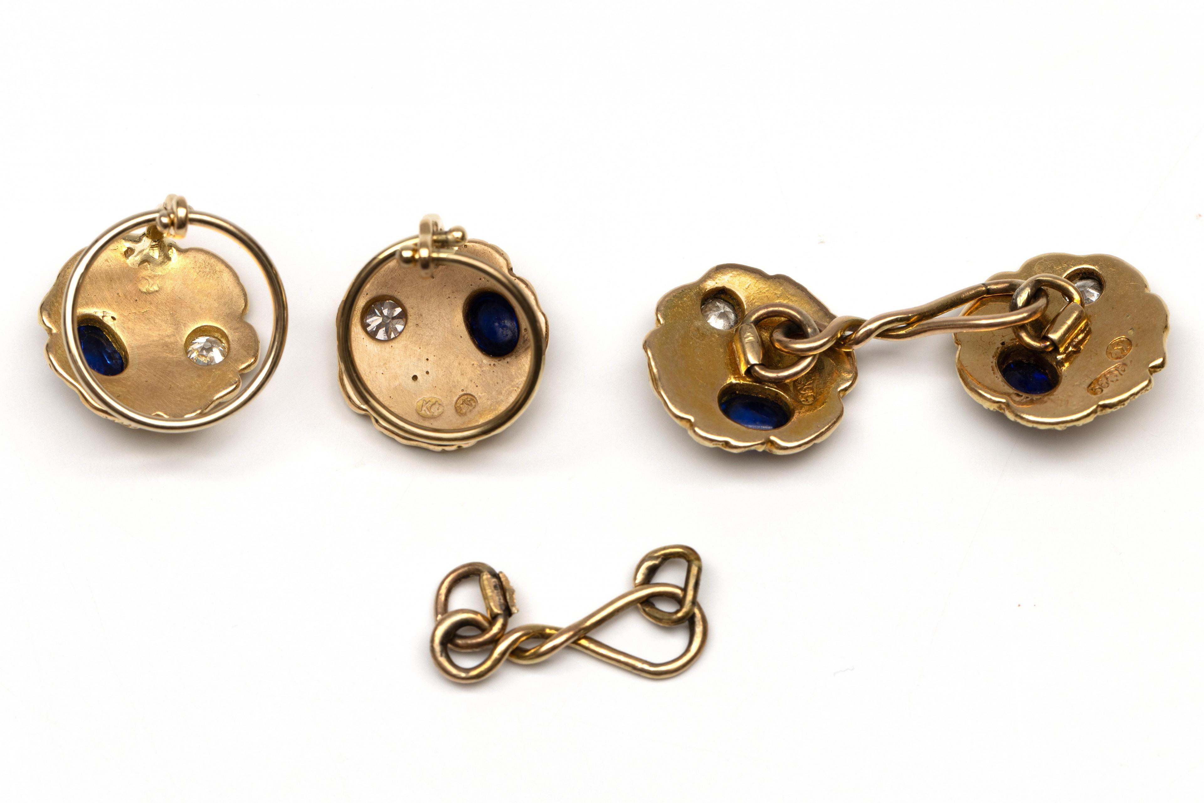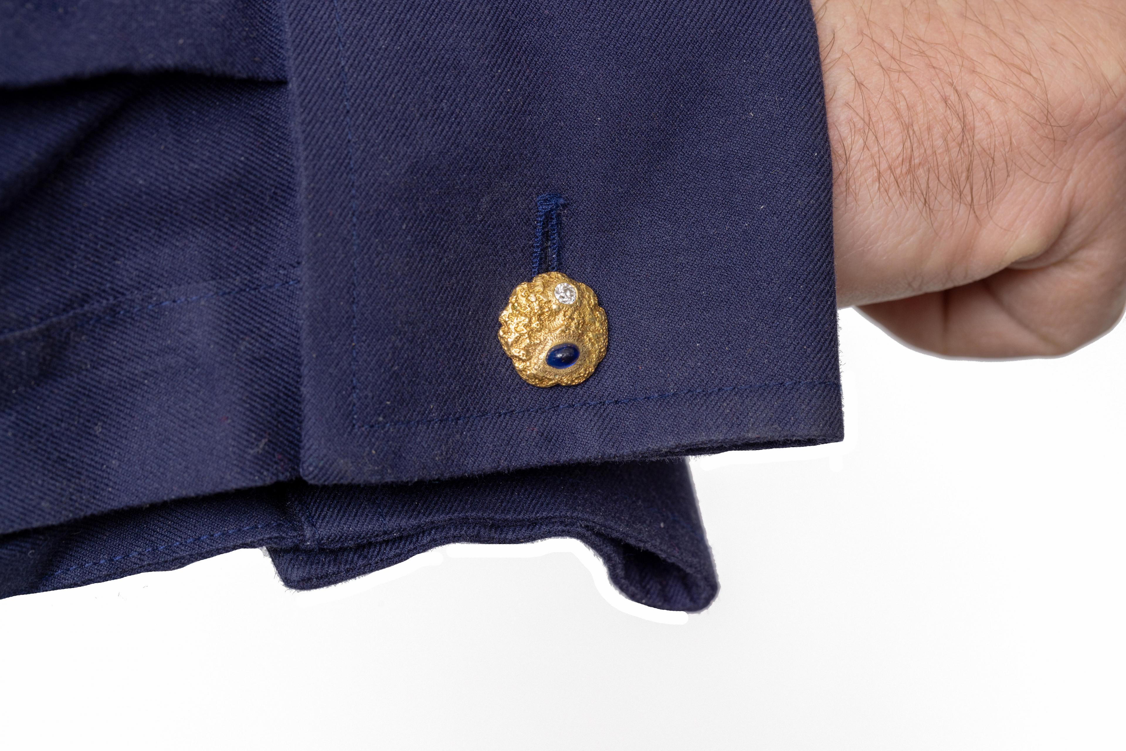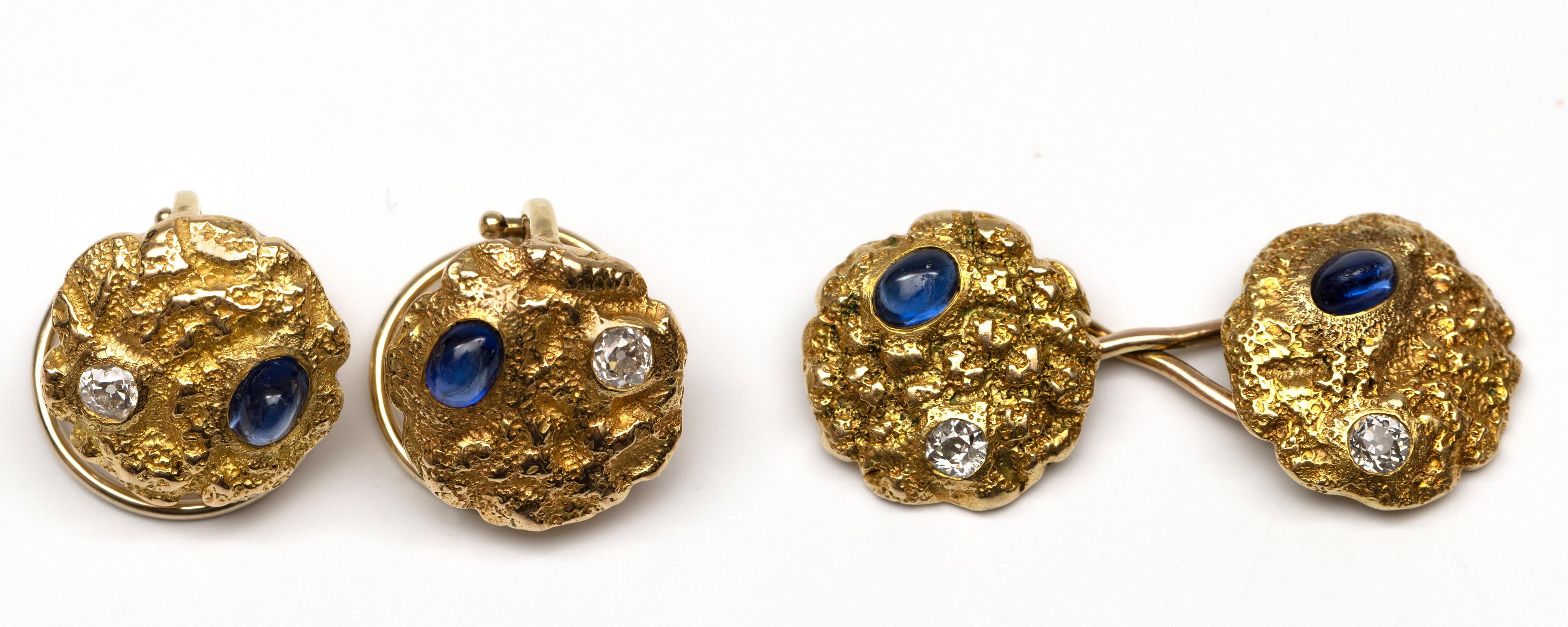 Oorspronkelijk een paar manchetknopen. Bestaande uit een ronde schijf met grillig oppervlak, elk bezet met een cabochon geslepen saffier en een oud briljant geslepen diamant. Hierbij de originele manchetknoop en de oorspronkelijke verbinding. Totaal diamant gewicht ca. 0.20 ct.