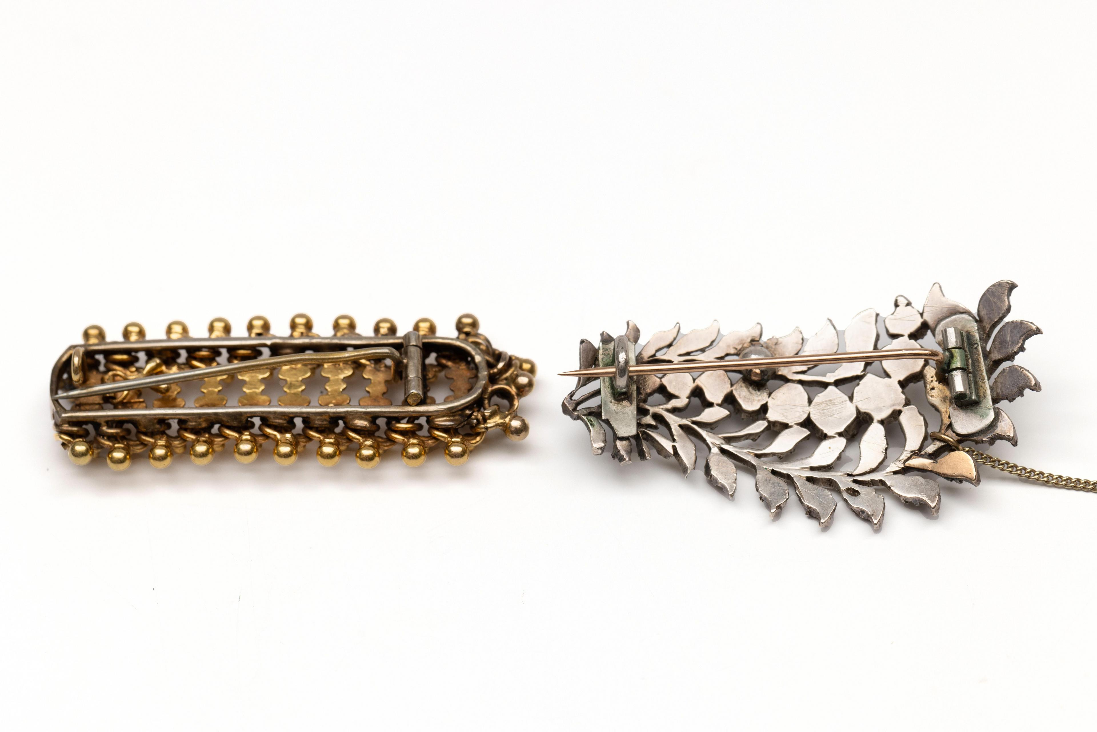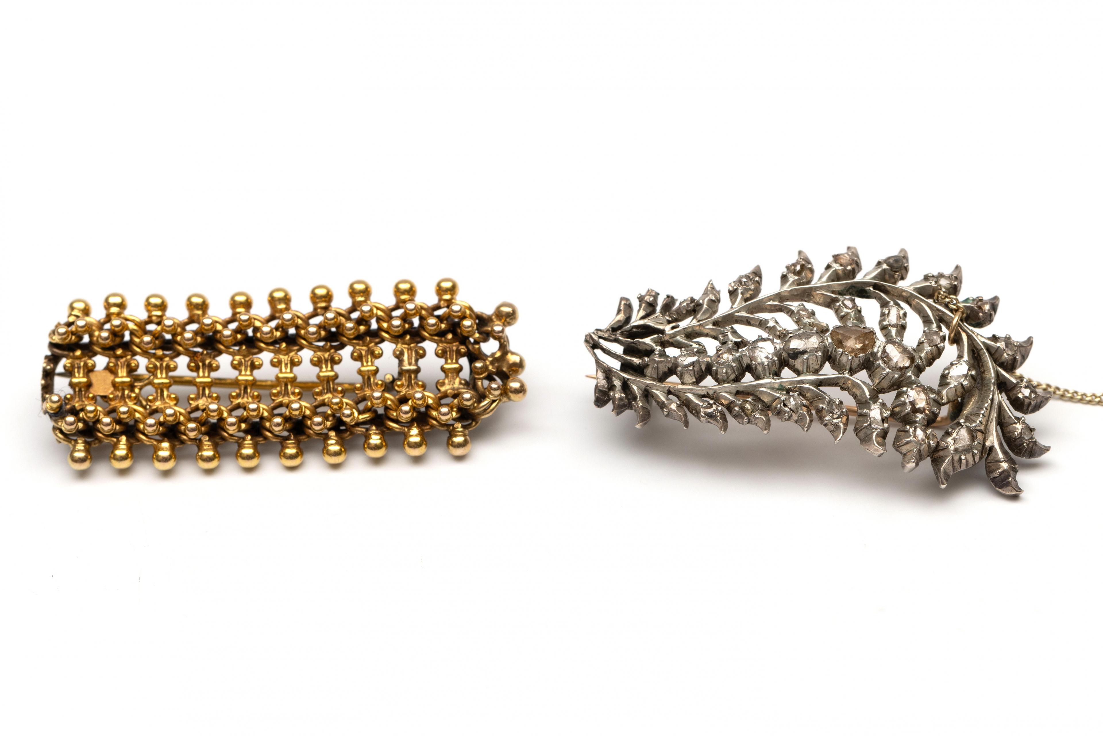 Eén zilveren Friese veer, bezet met roosgeslepen diamant, de speld van 14 kt. goud en één 14 kt. gouden broche, gedecoreerd met bolletjes