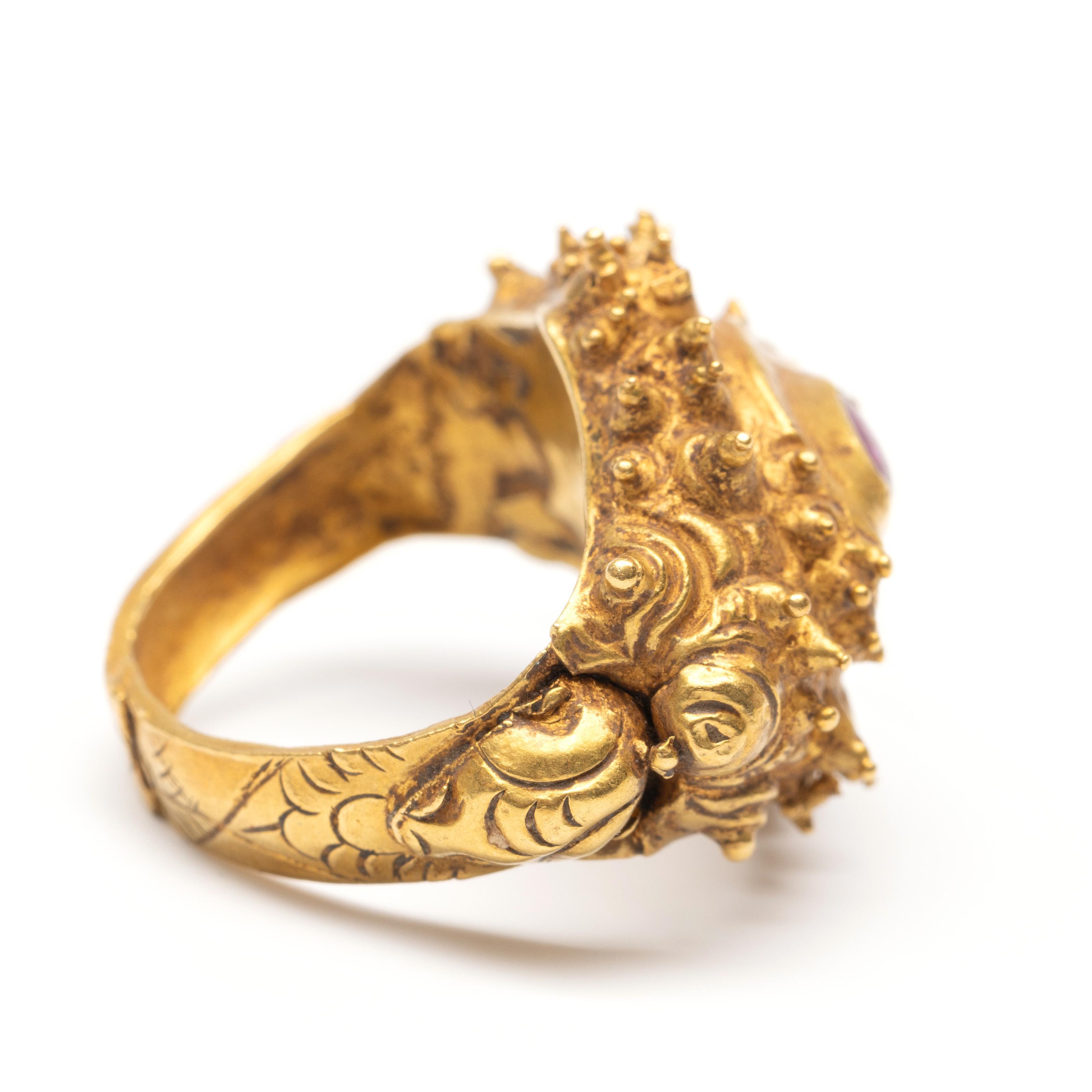 Bali, gold ring. Set with a cabochon-cut ruby, the top decorated with points, the shoulders with a repoussé with curls, and a flower at the bottom.