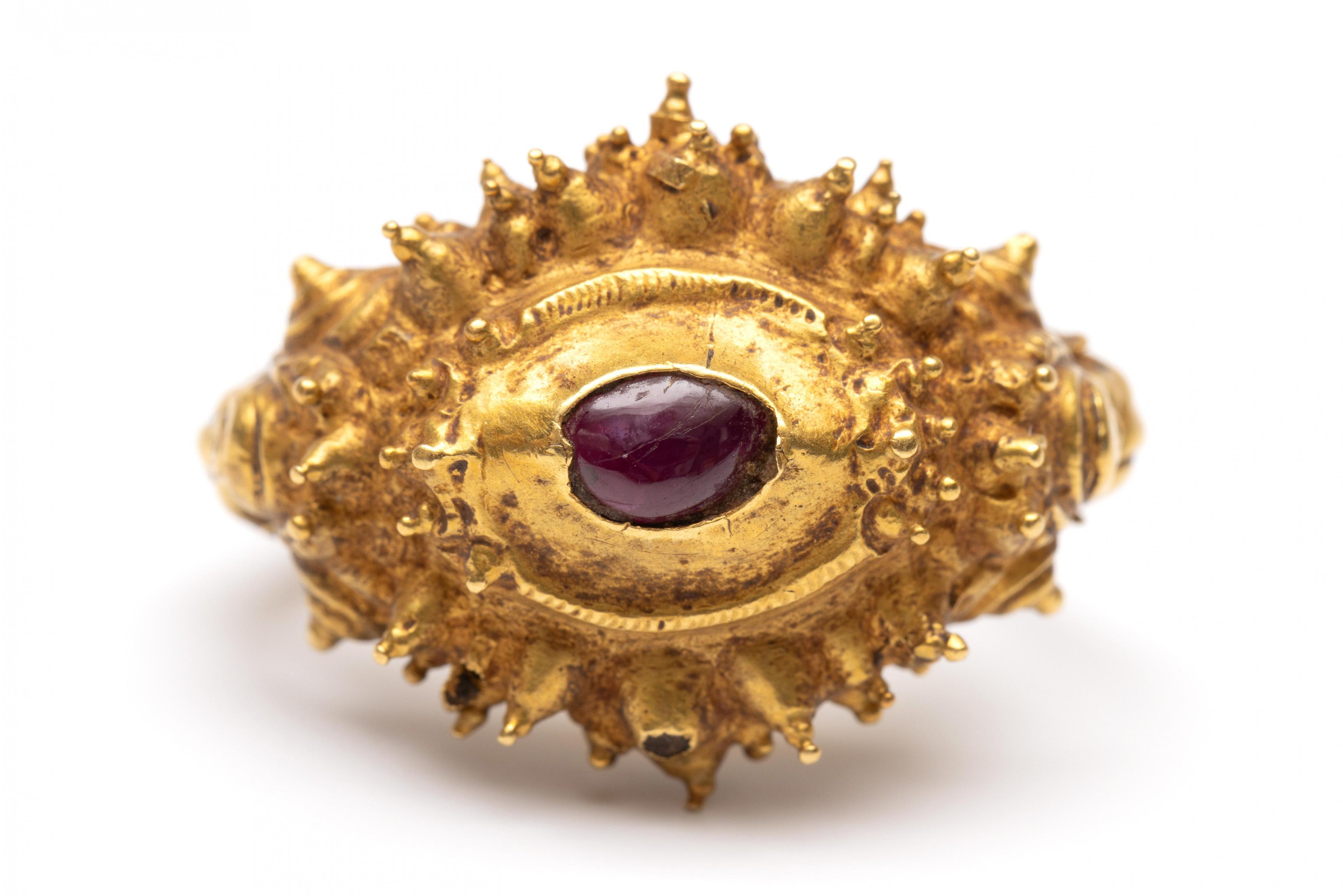Bezet met een cabochon geslepen robijn, de bovenzijde gedecoreerd met punten, de schouders met repoussé met krullen, aan de onderzijde een bloem