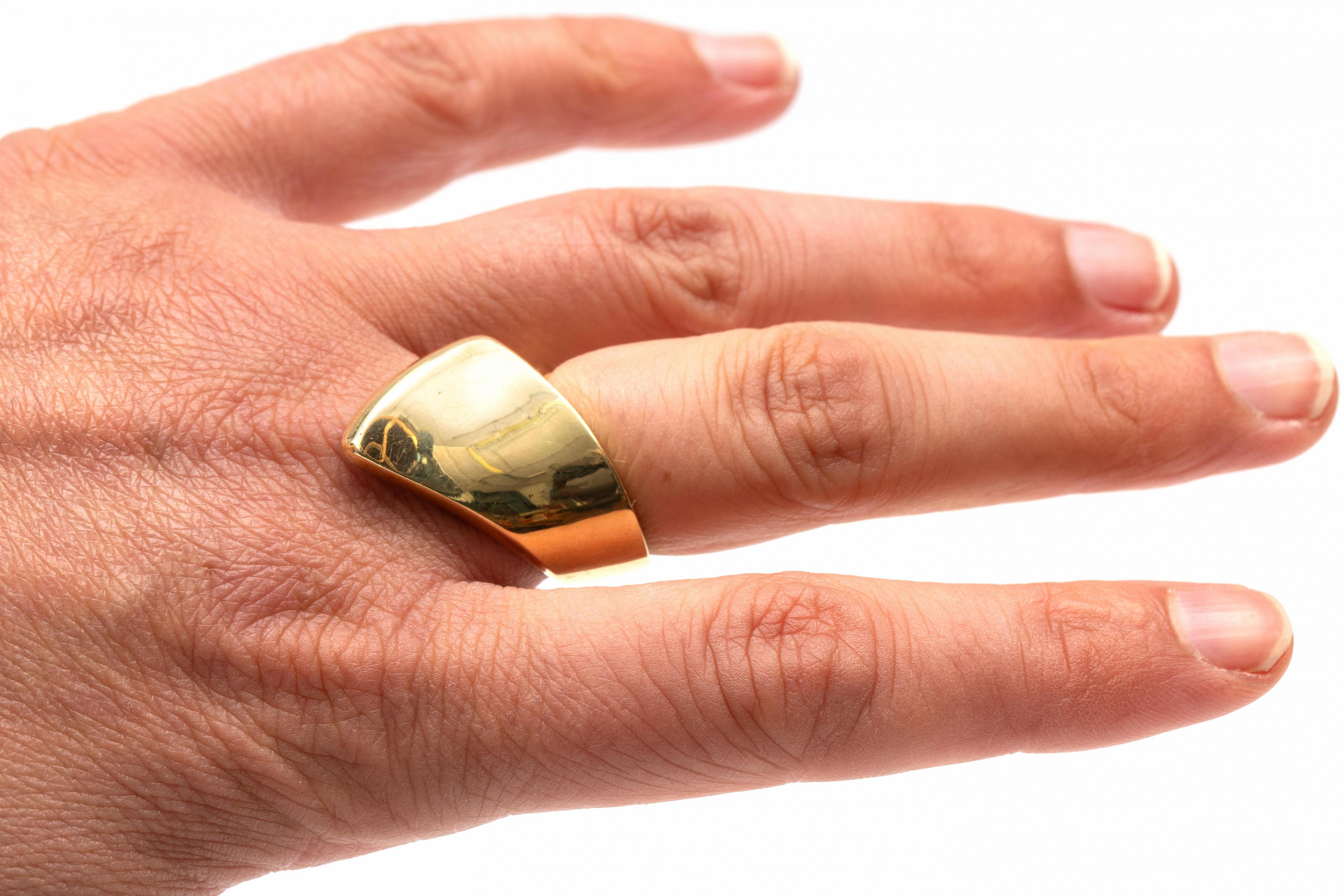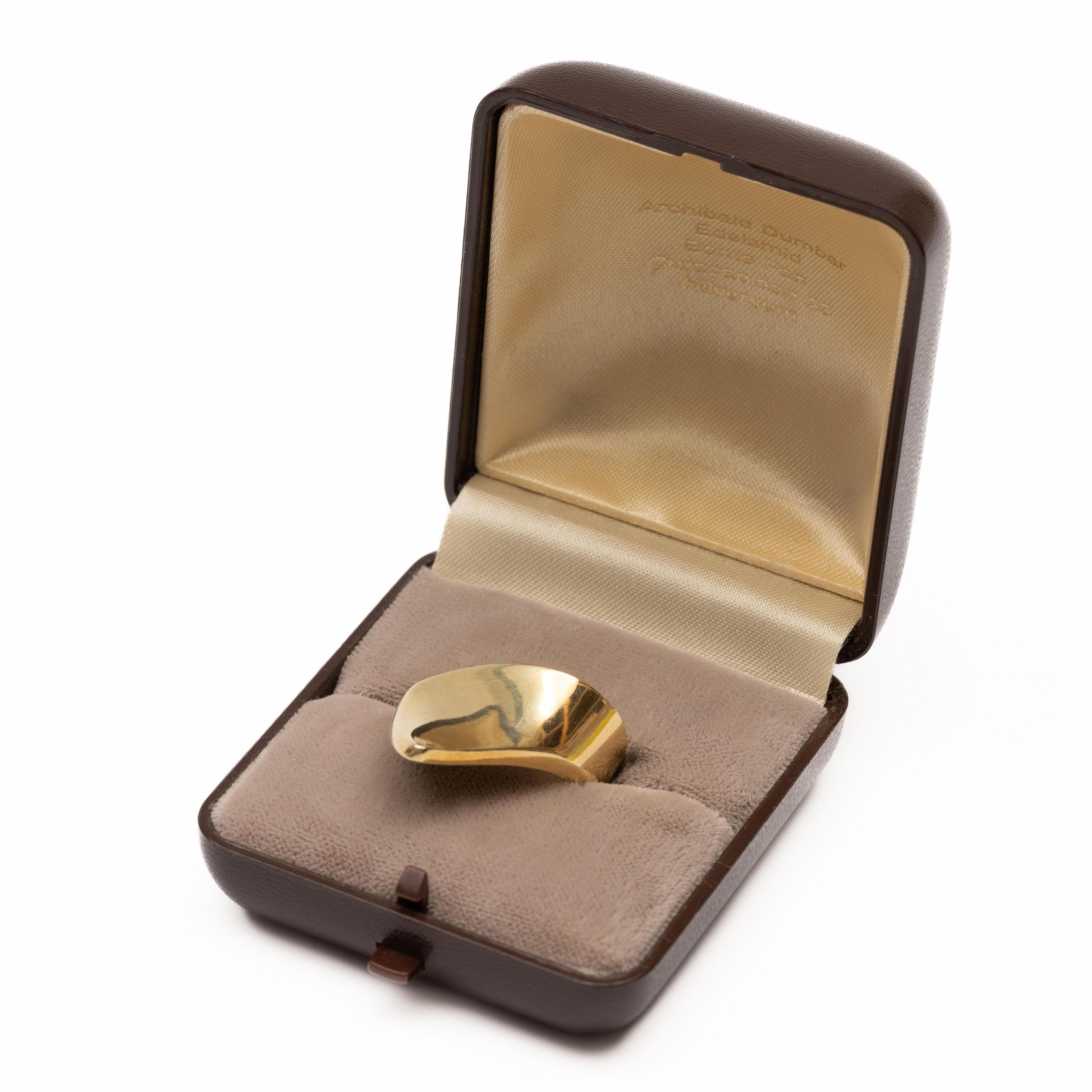 Archibald Dumbar, 14 k. gold ring, asymmetrical design, widening to a stylized fan. In a box.