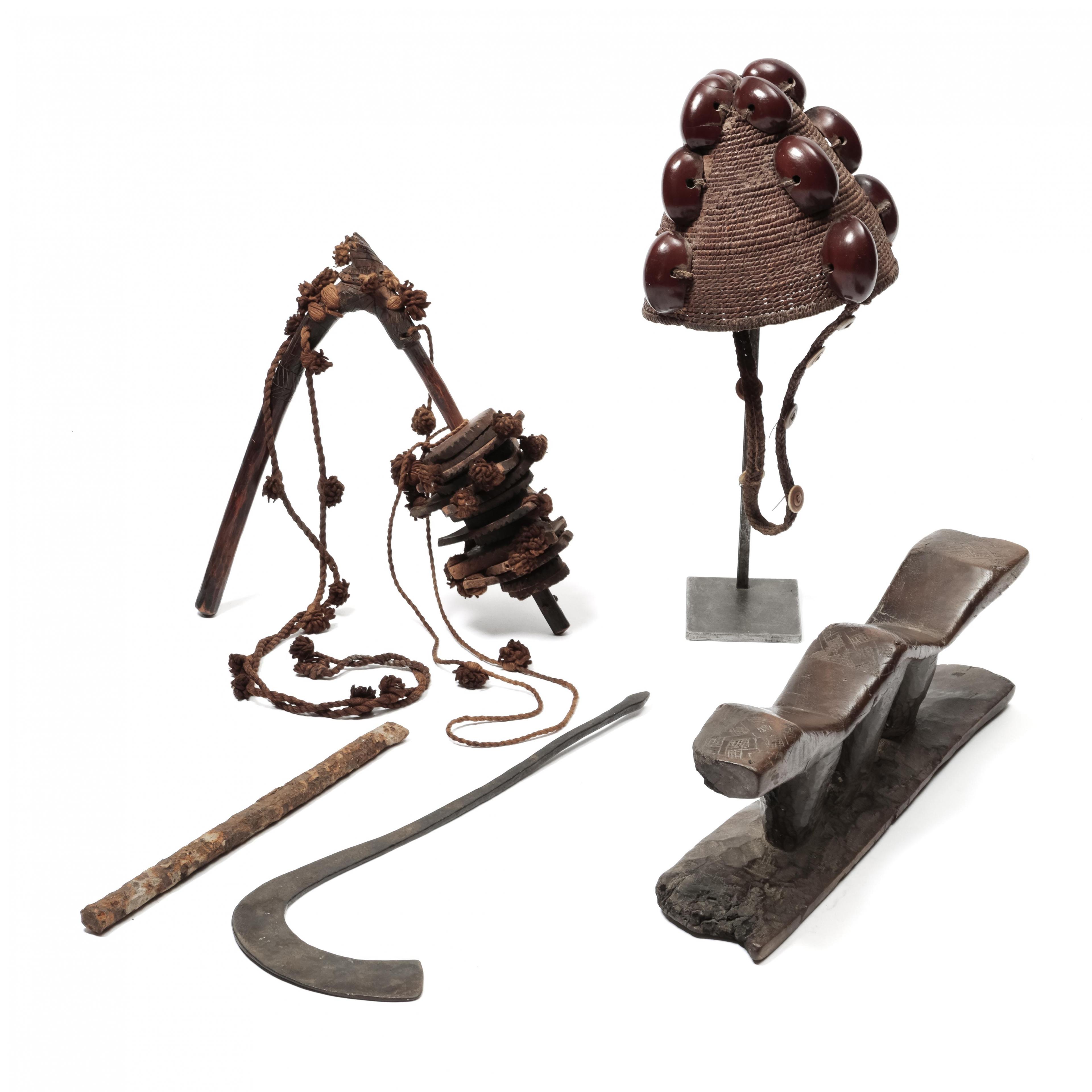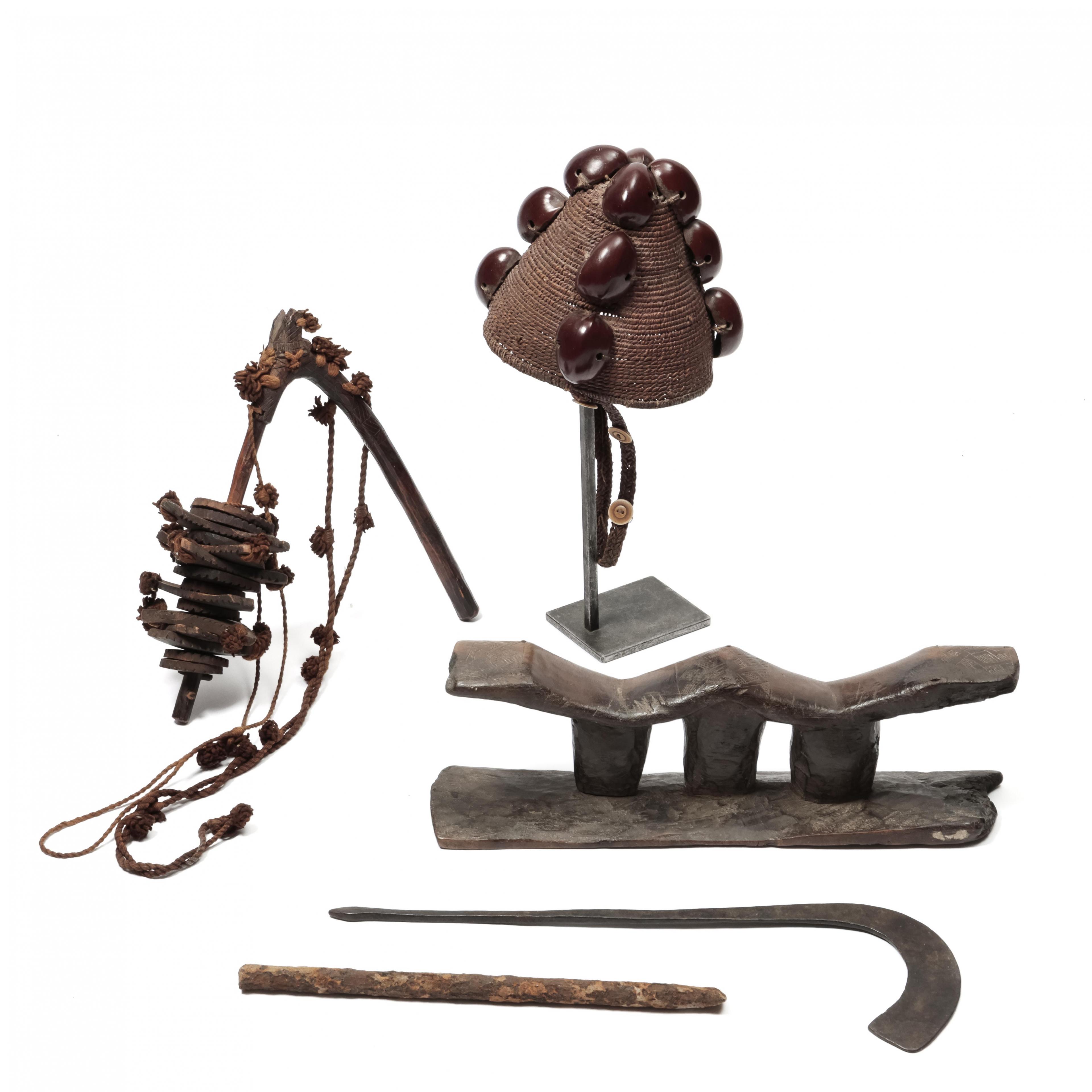 D.R. Congo, Kuba, a double neckrest, a Lega headdress, a Dogon dans ornaments and two metal implements.