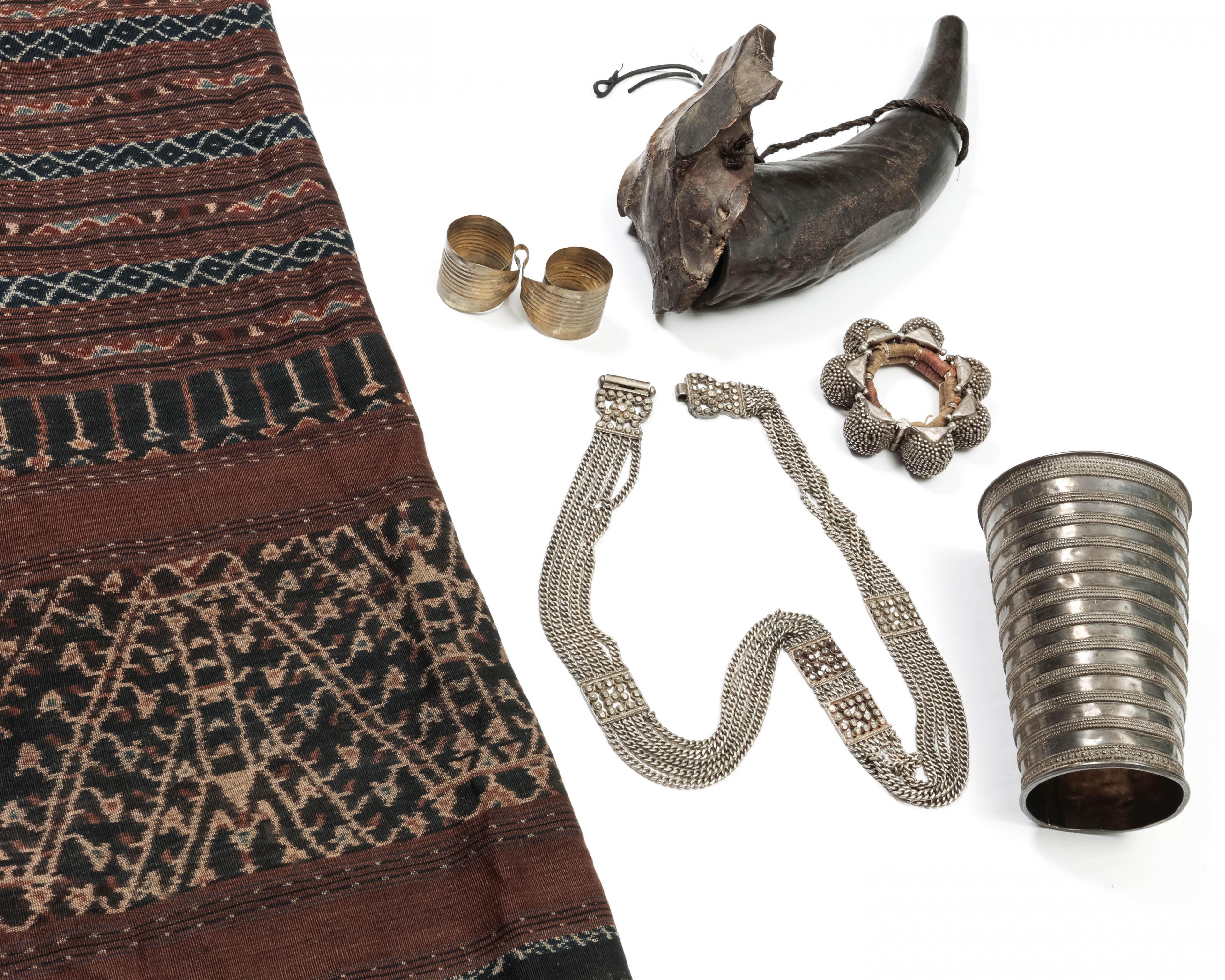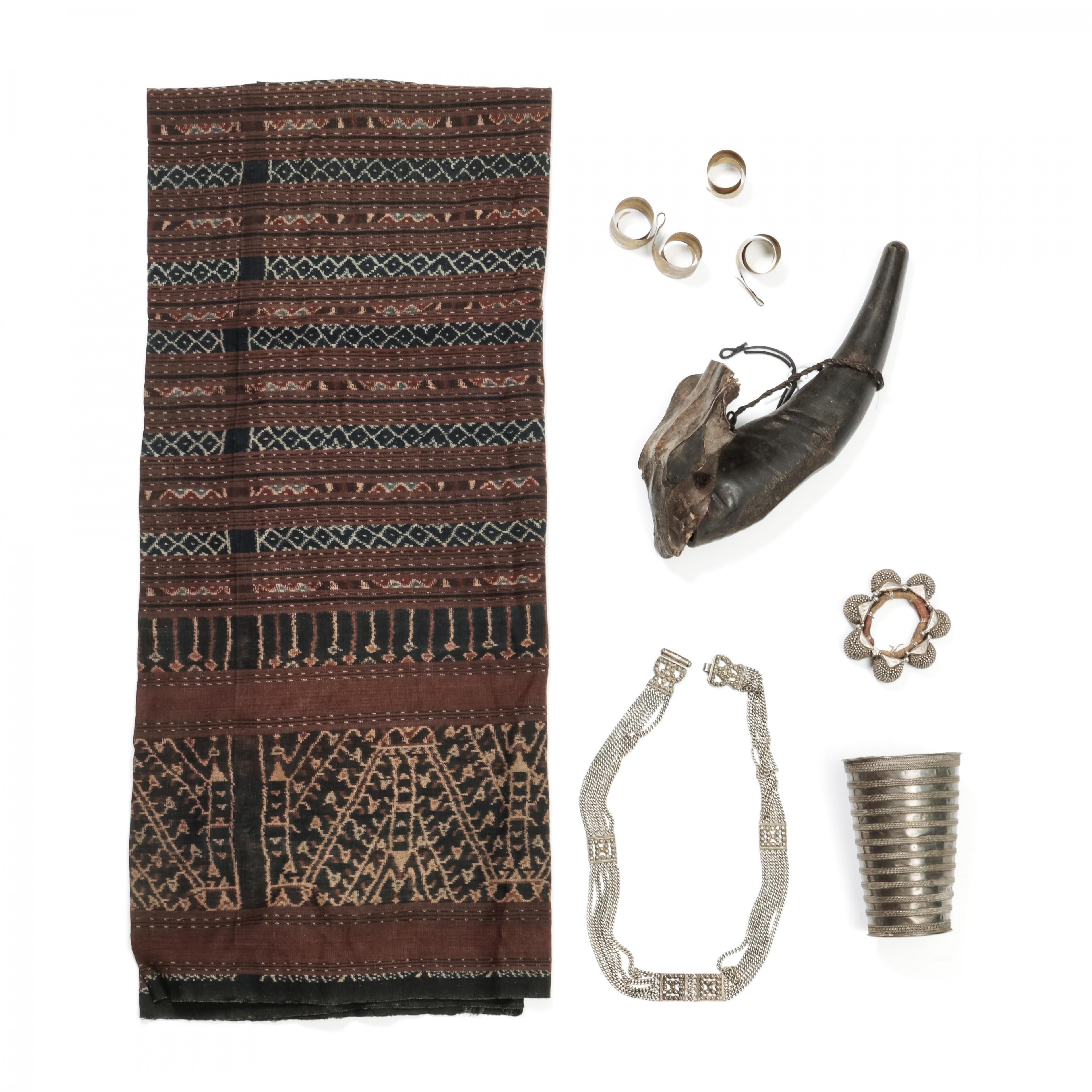 constisting of an Afghan silver alloy bangle, India silver belt and silver armlet, a pair of copper alloy Nias ear ornaments and a Batak horn and a viscose Indonesian sarong.