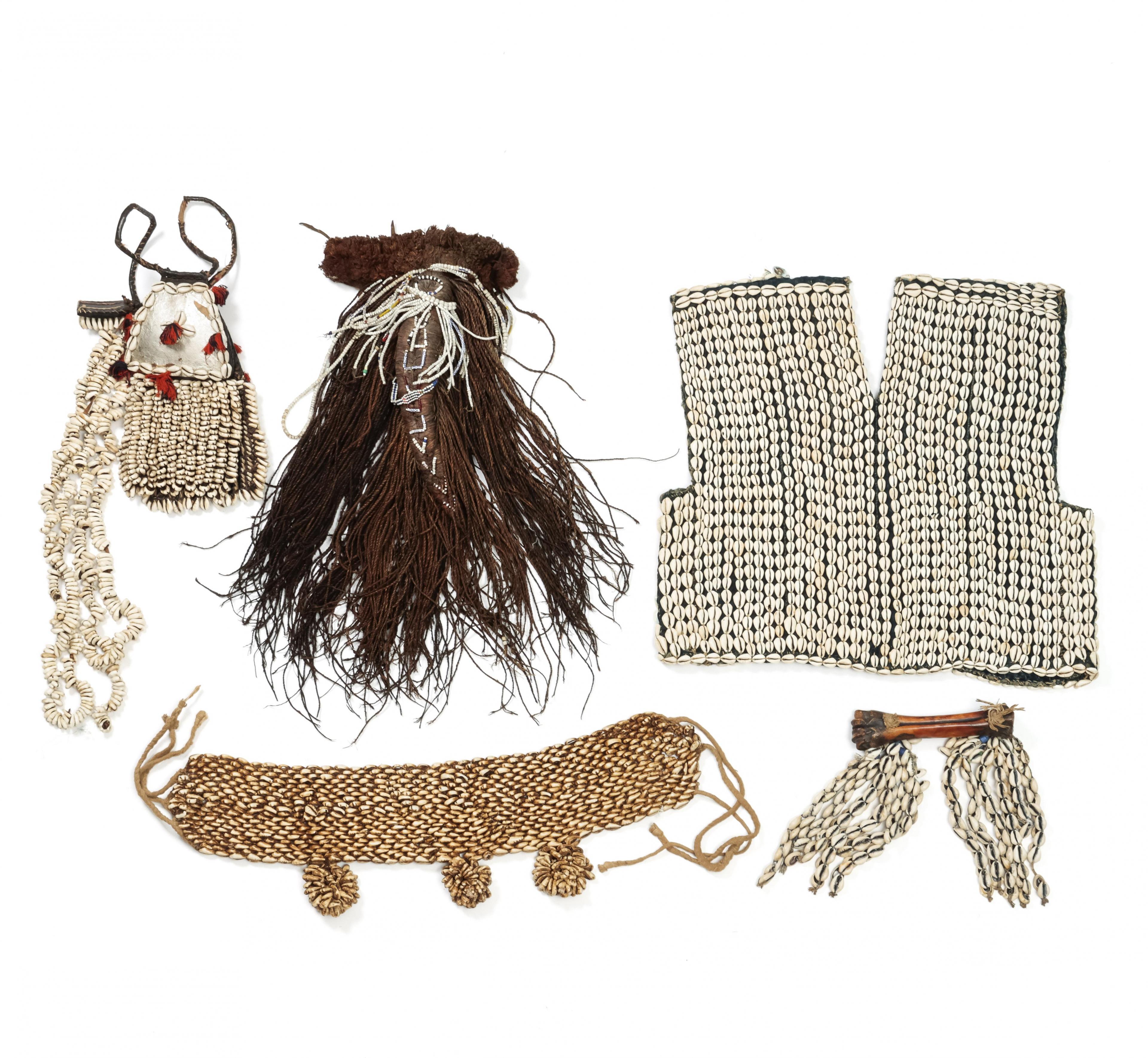 Mali, Tunica with cowry shells; a cowry shell belt; West African ornament consisting of cowry and a bone ornament with cowry shell strains and a headdress.