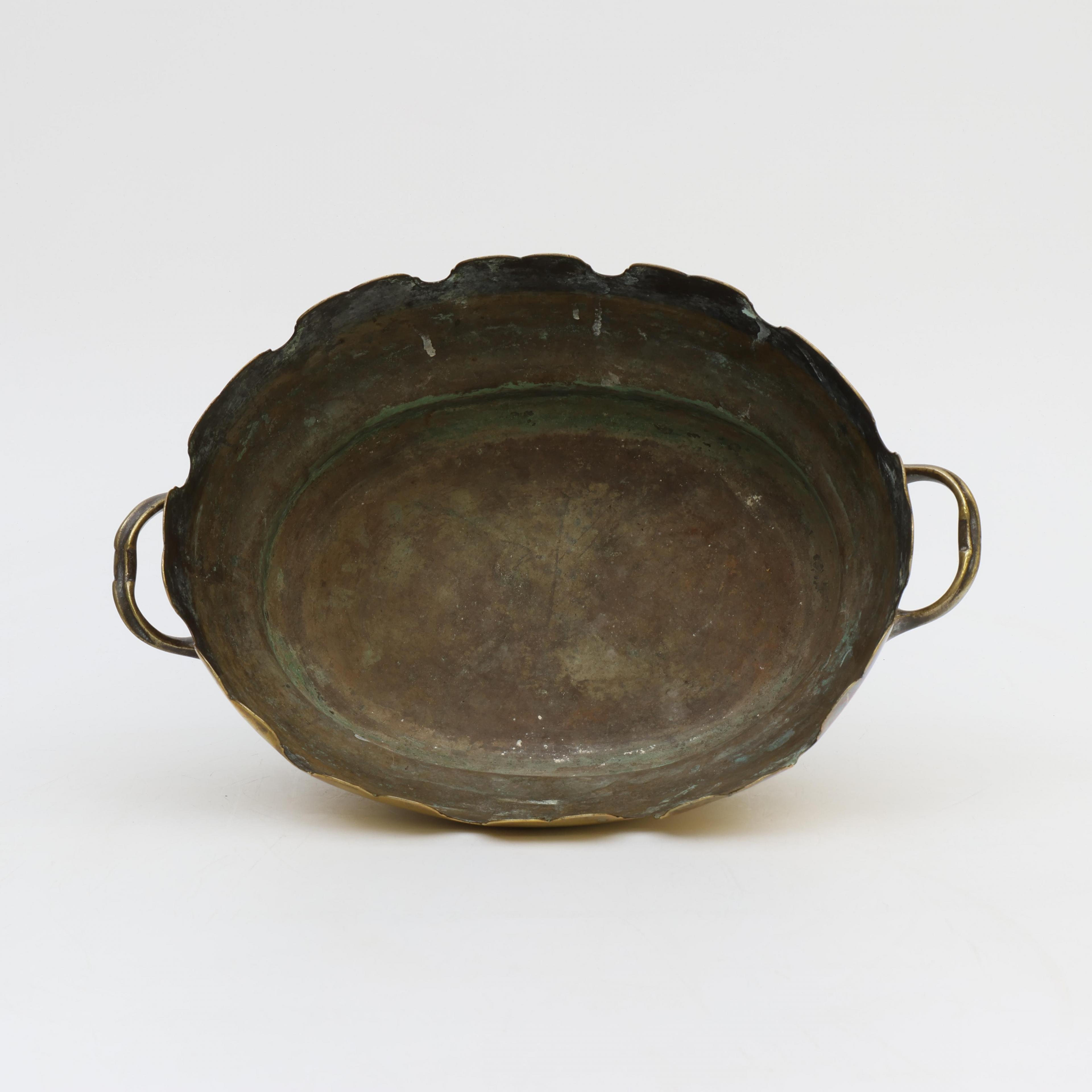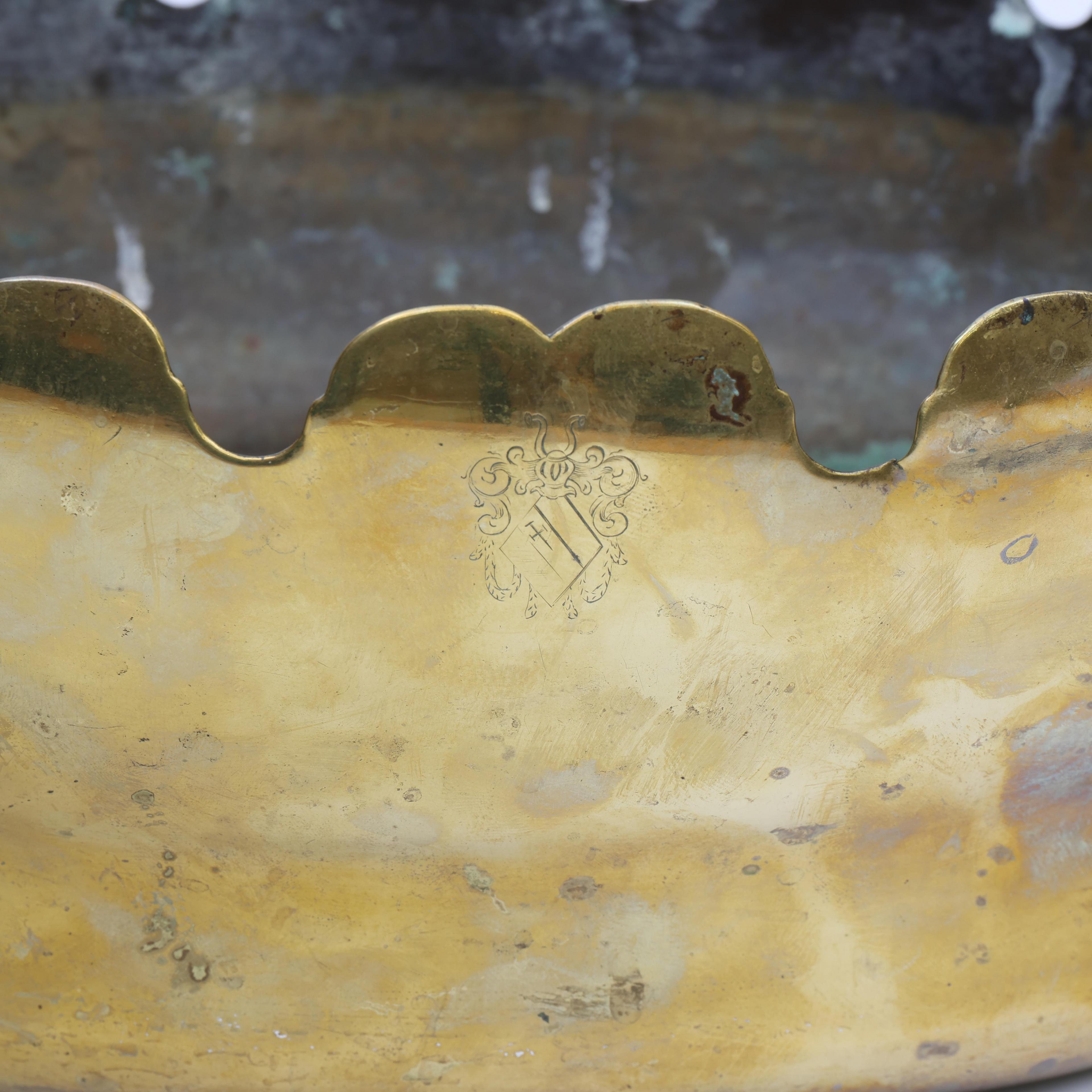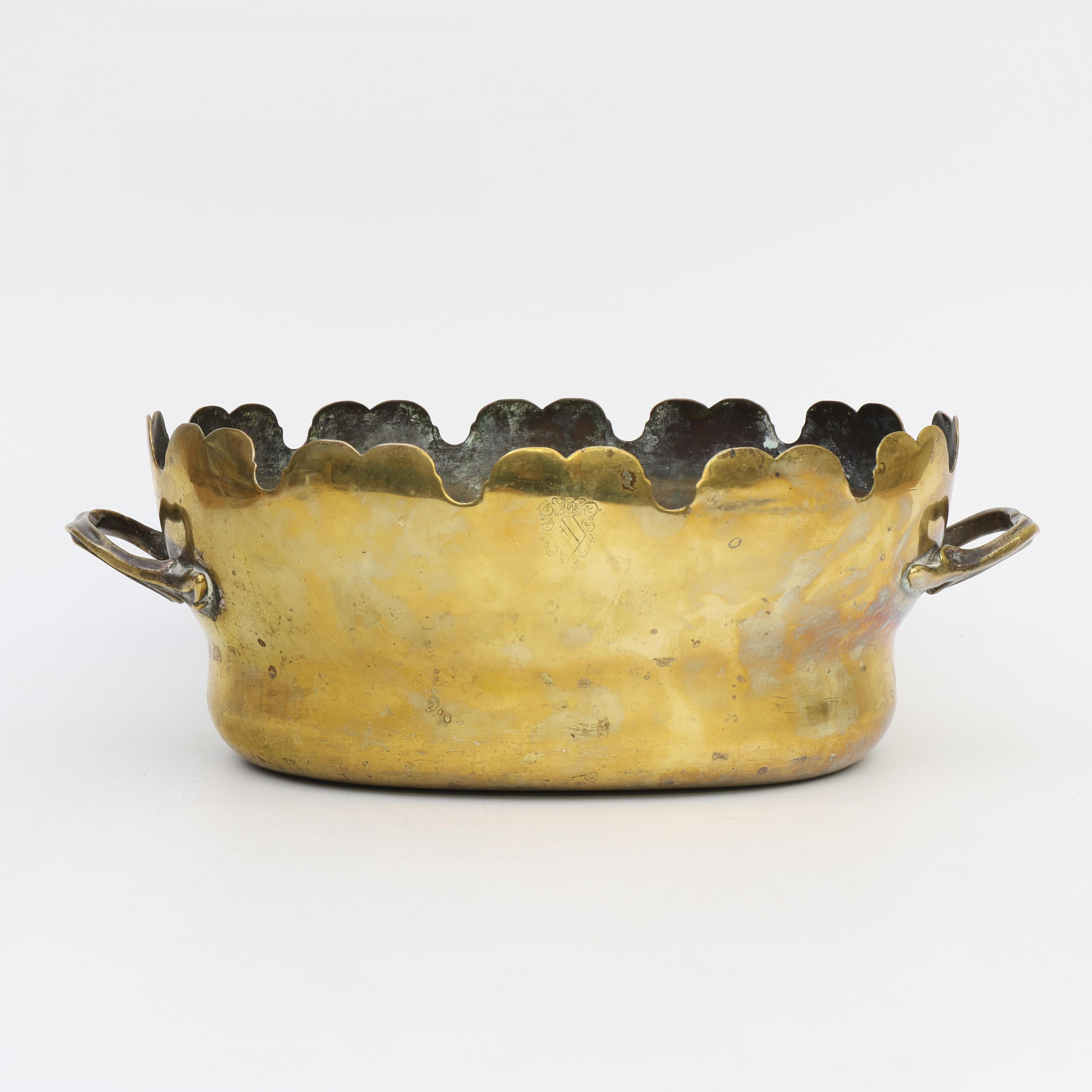 Uitgevoerd met geschulpte rand en twee handgrepen. Aan de voorzijde gravure met wapenschild.