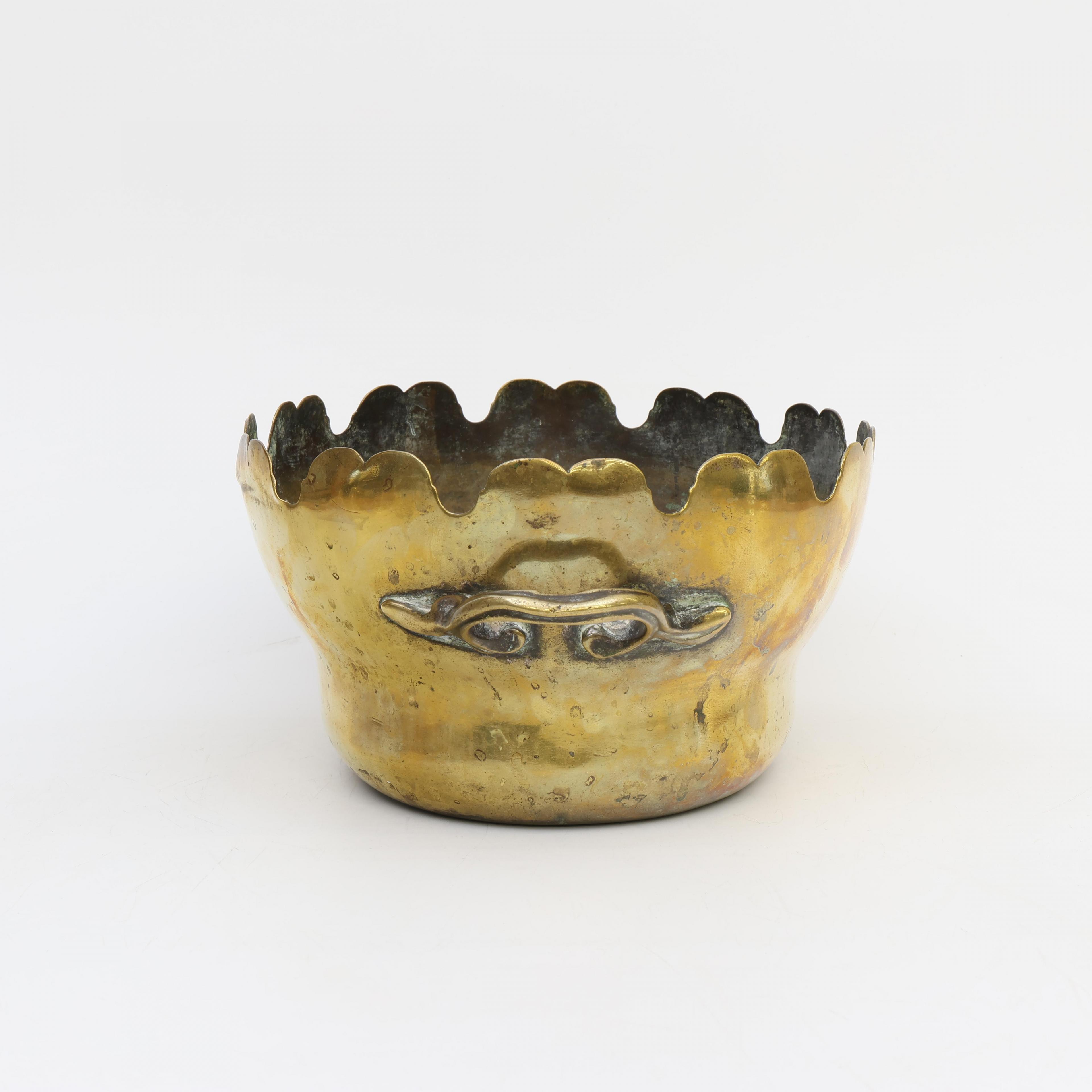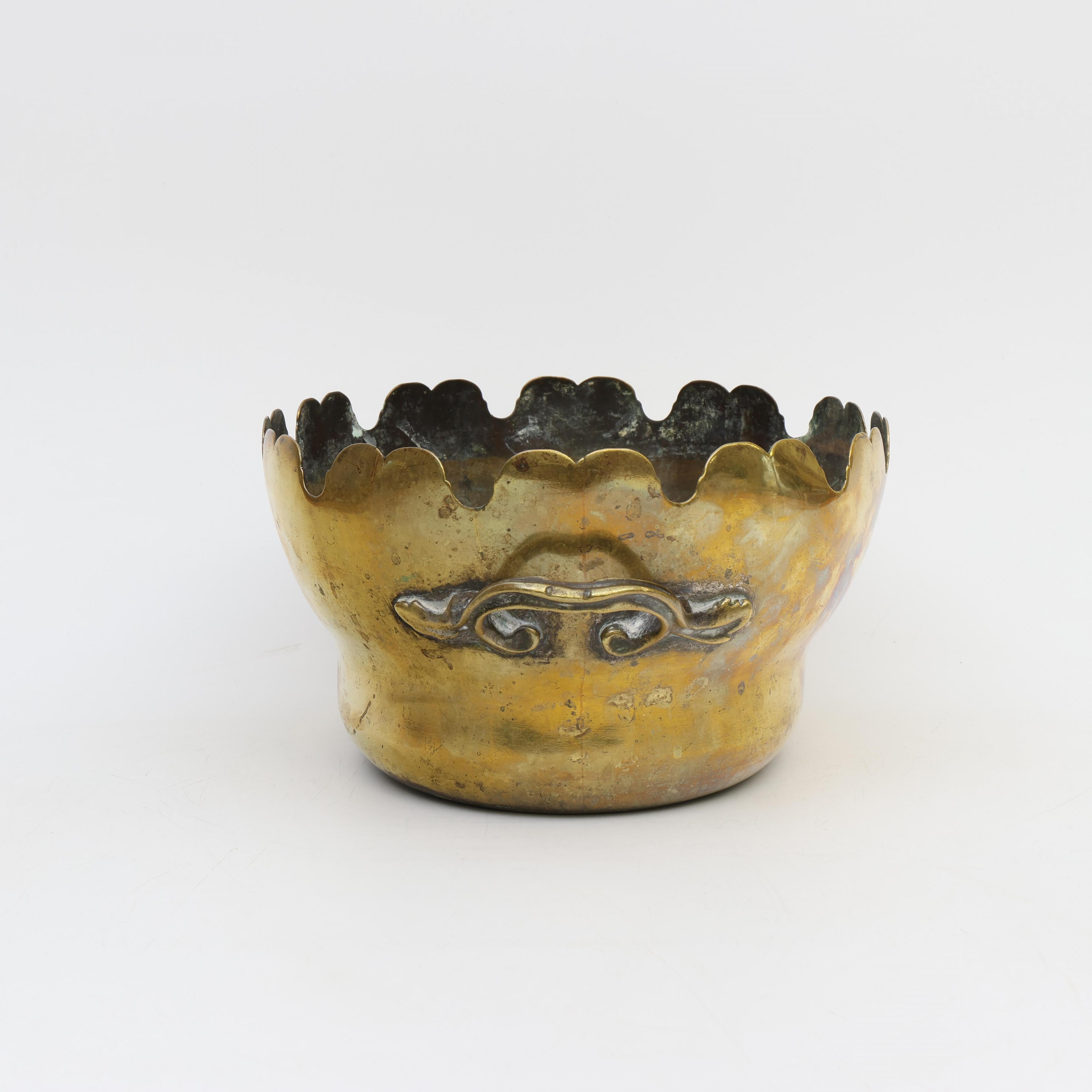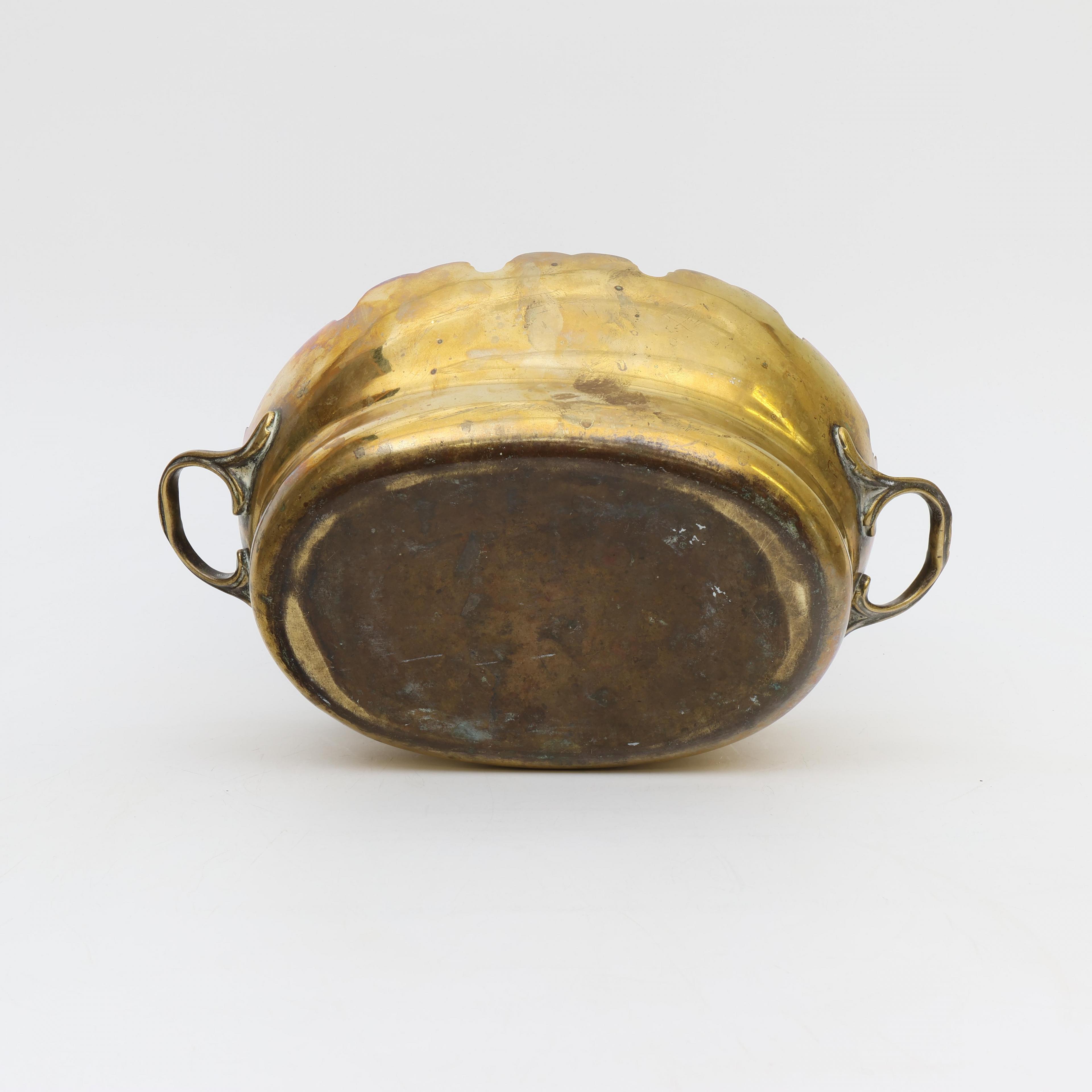Uitgevoerd met geschulpte rand en twee handgrepen. Aan de voorzijde gravure met wapenschild.