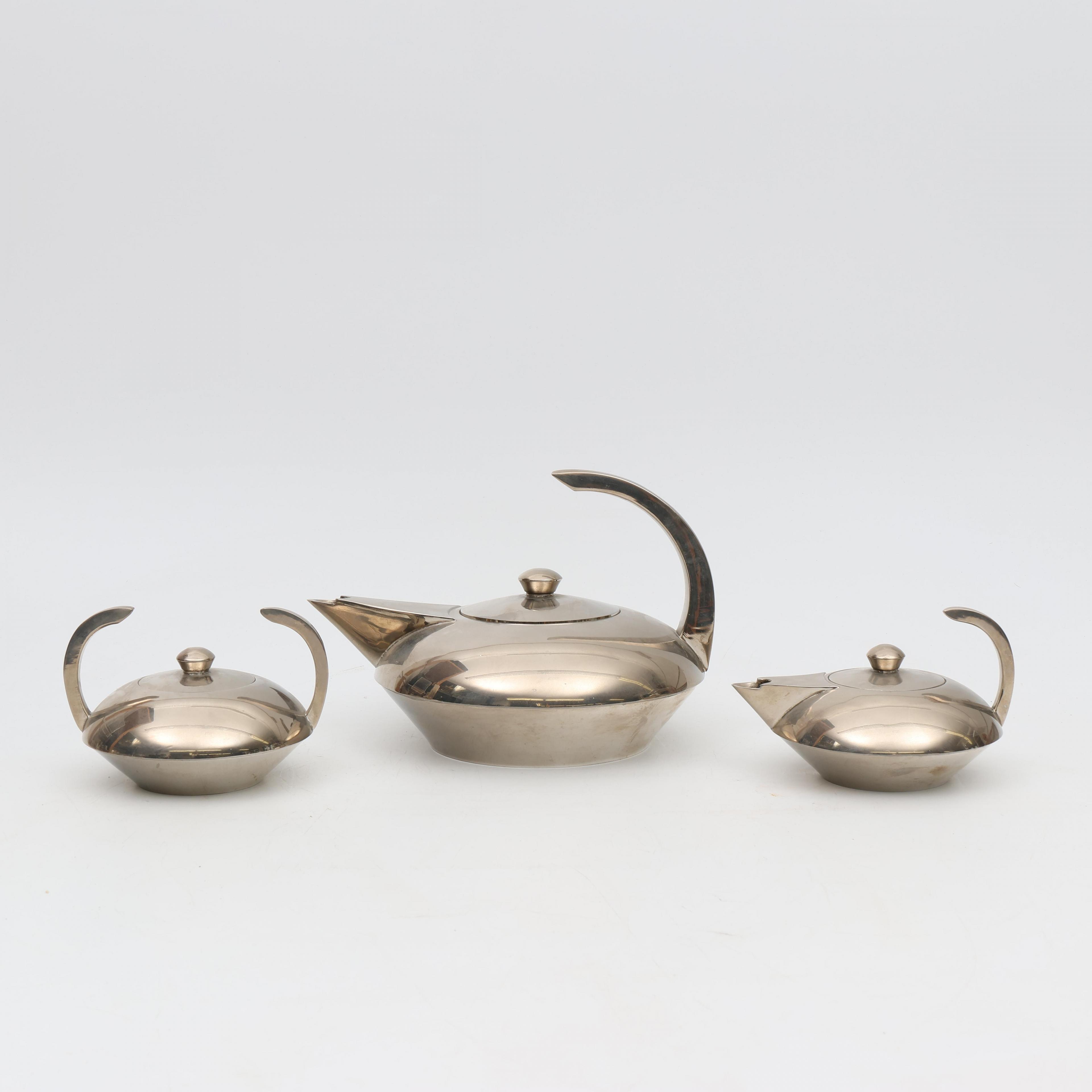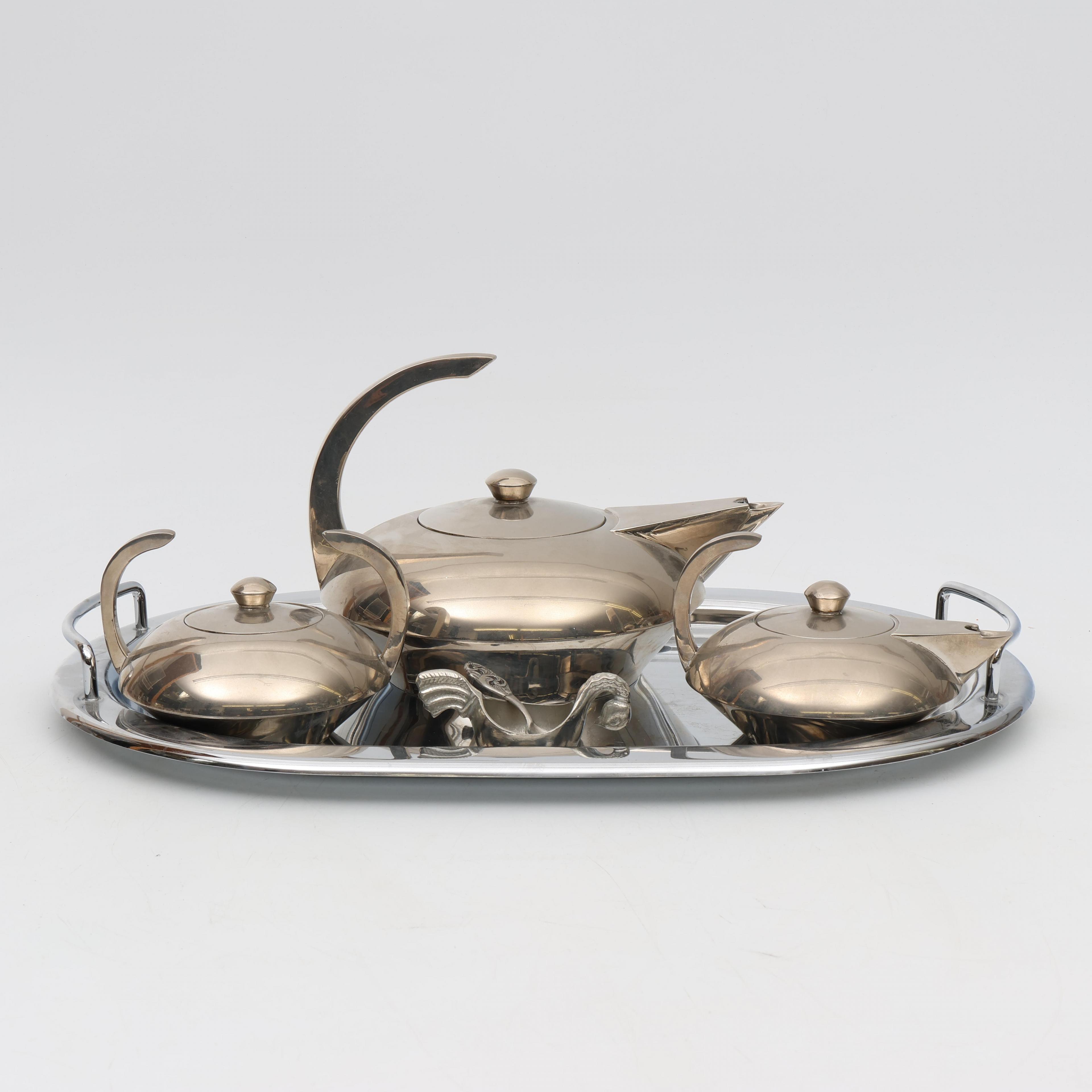 Bestaande uit theepot, melkkan en suikerpot. Hierbij dienblad en zoutvat met lepel.