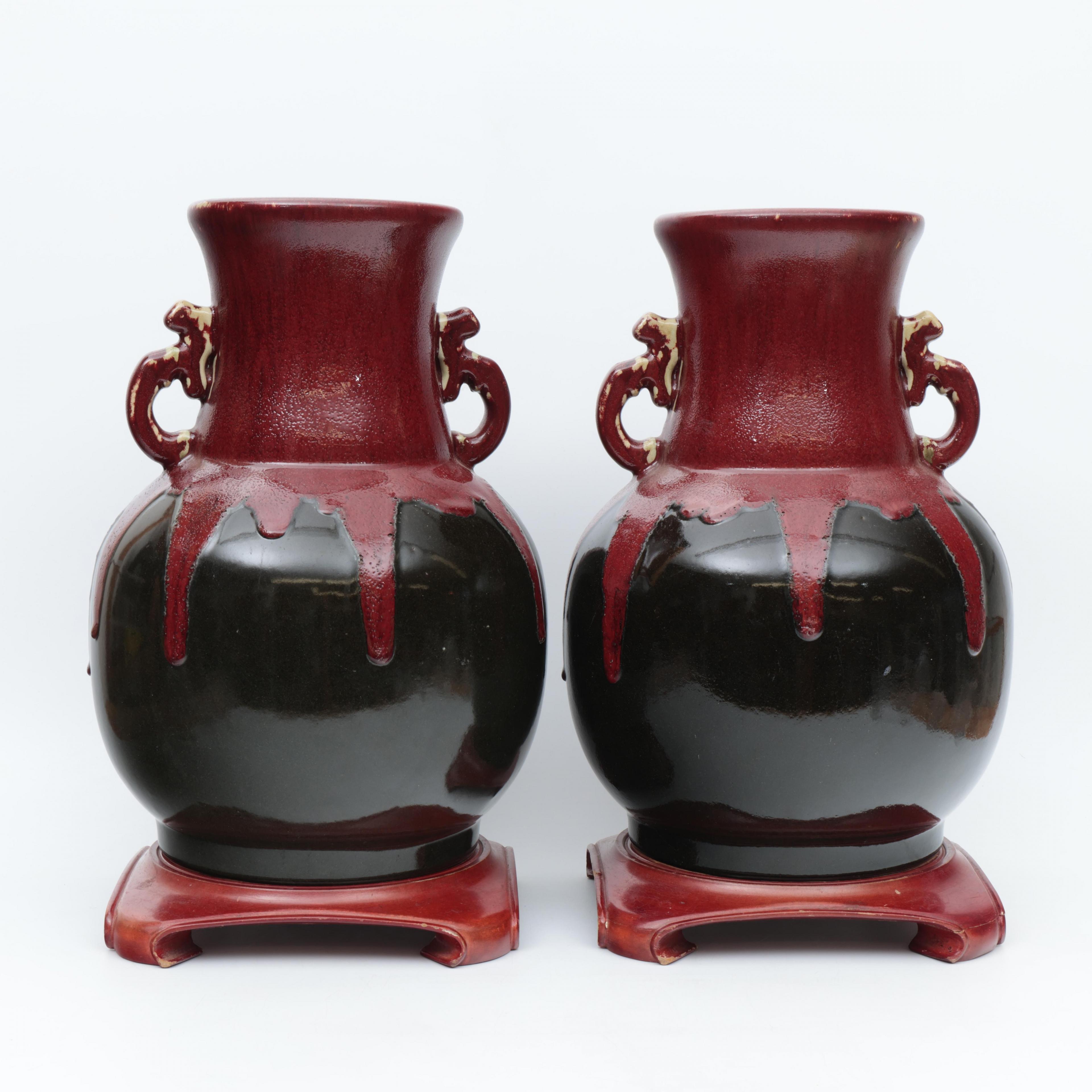China, paar porseleinen vazen met rood druipglazuur op zwart fond, 20e eeuw;