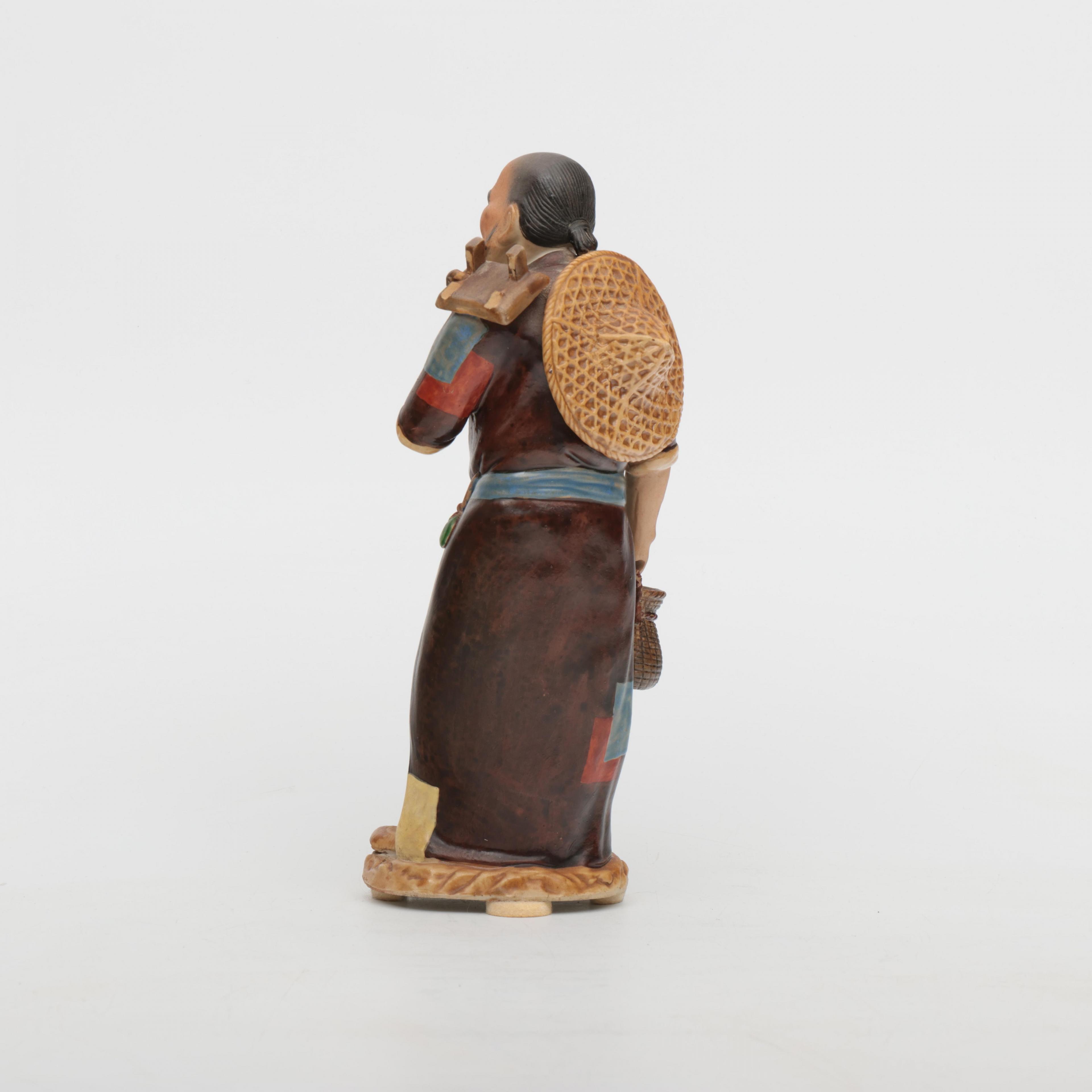 gekleed in eenvoudig gewaad, met strooien hoed over zijn schouder, gesigneerd (enkele chipjes)