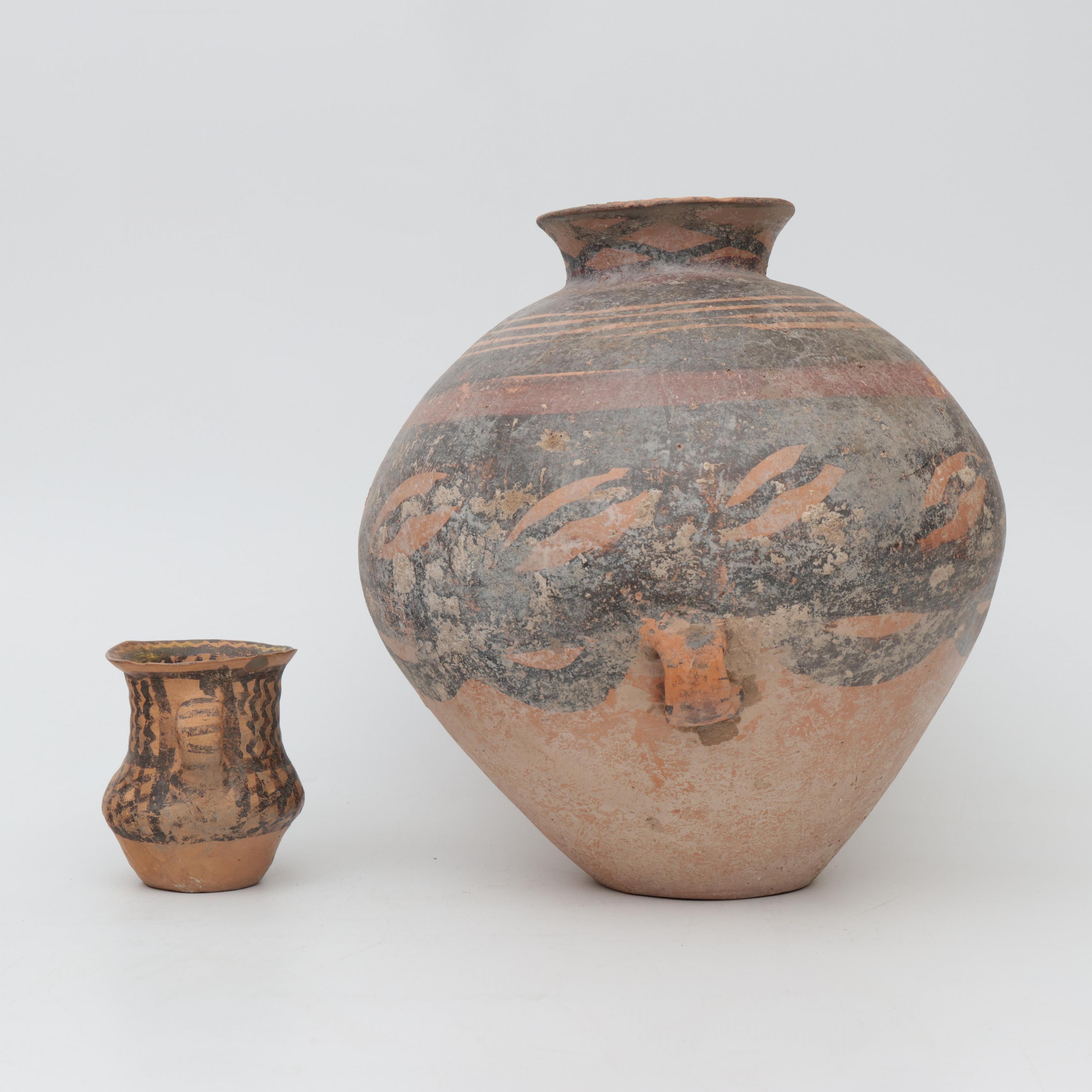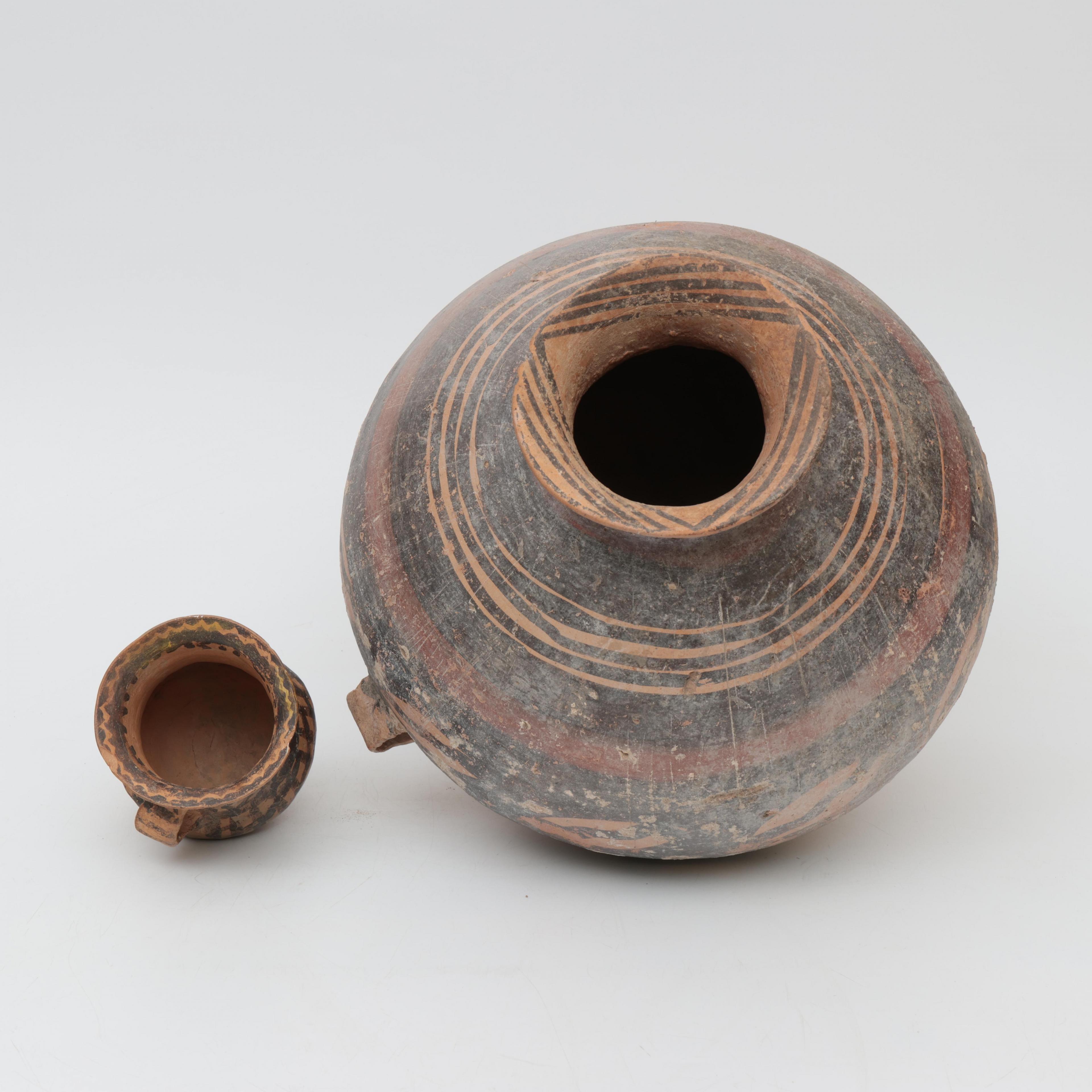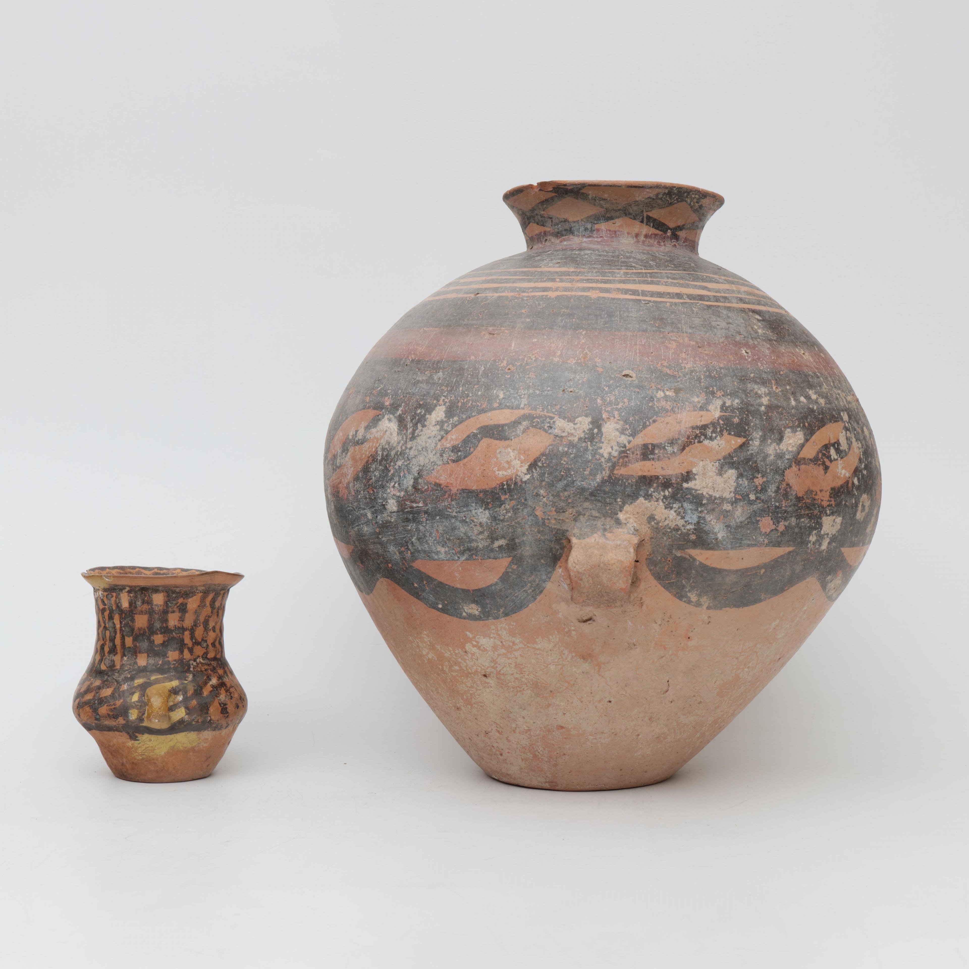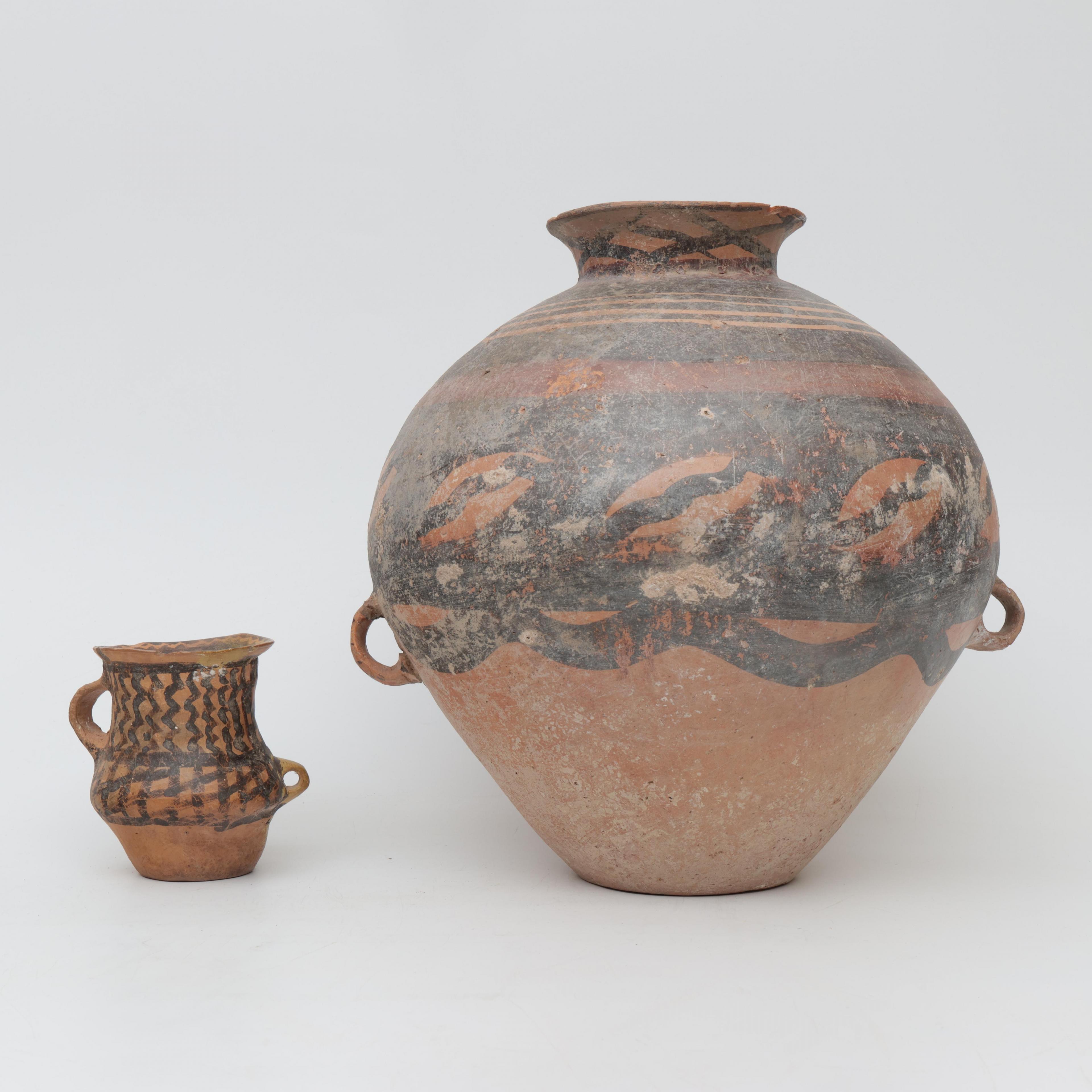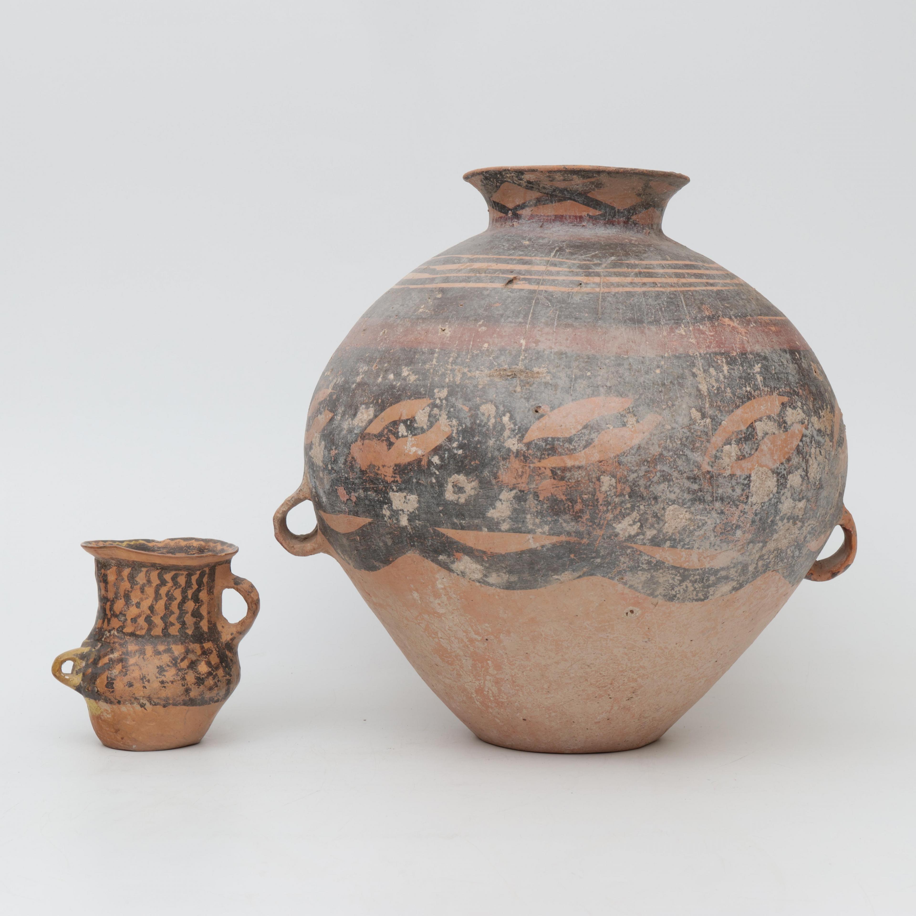 moulded with two lug handles and painted with swirling patterns in red and black pigments (damage and wear as may be expected), together with a smaller restored two-handled pot from the same period