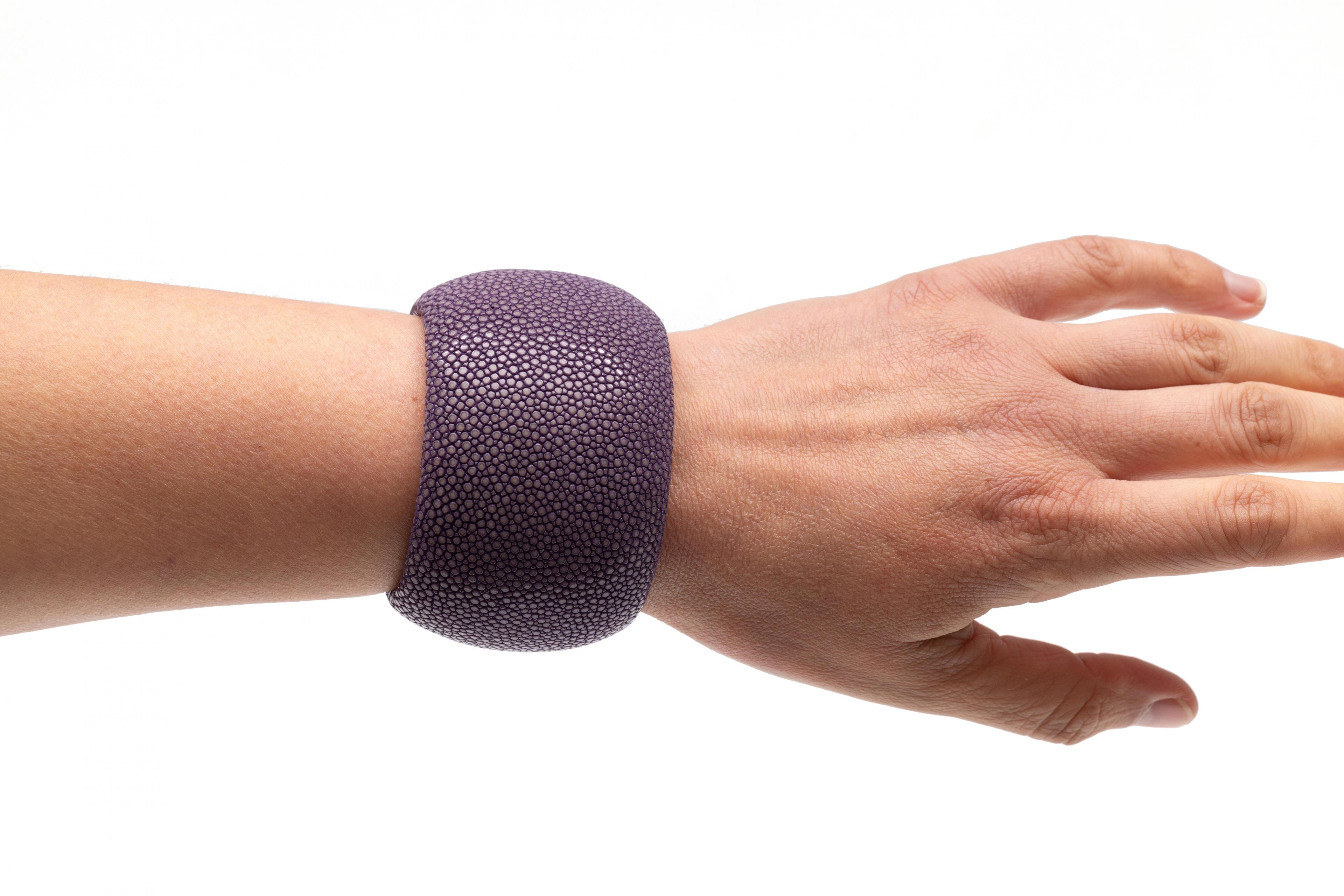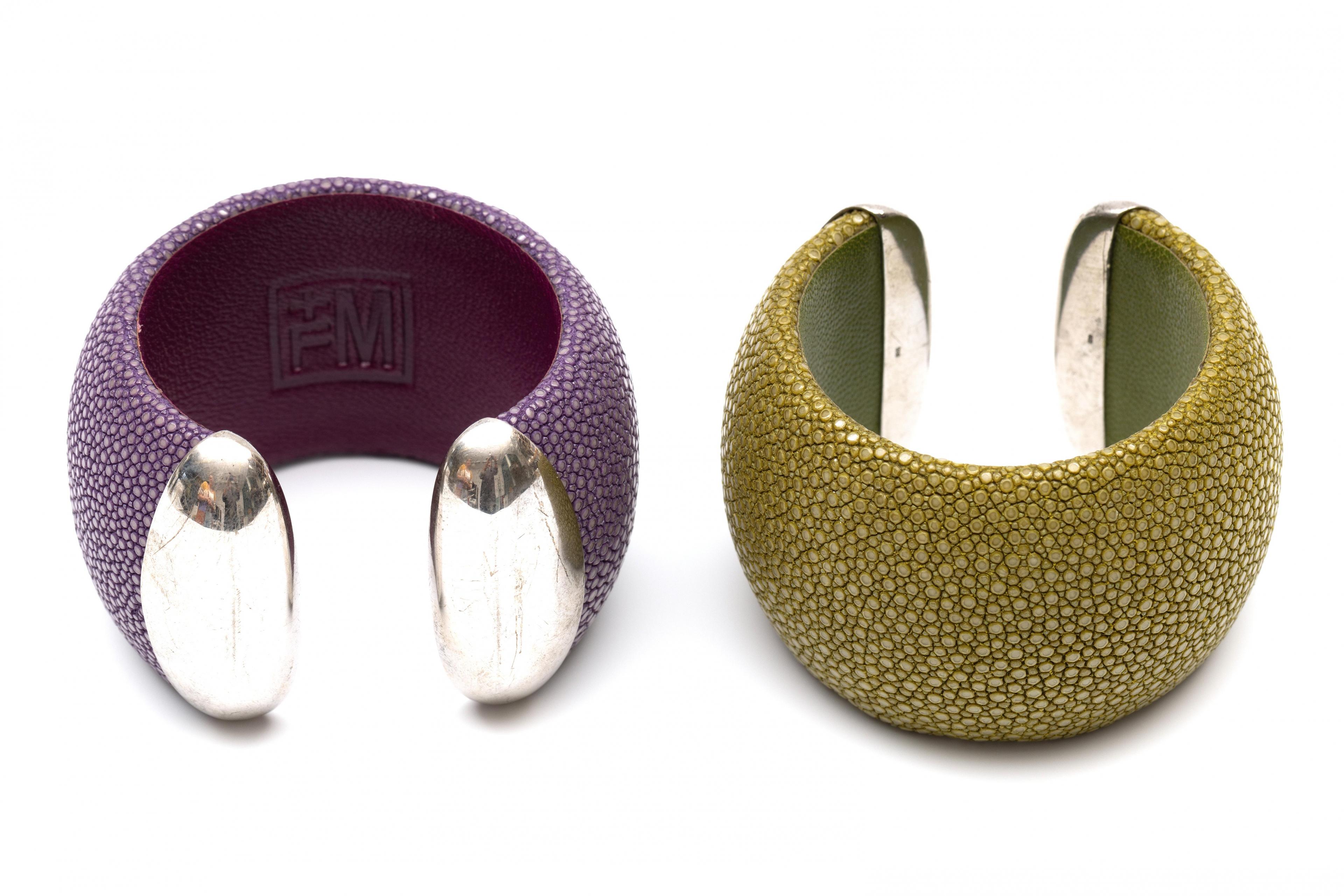 Fred Moes, two ray skin bracelets. In green and purple, both with silver mountings.