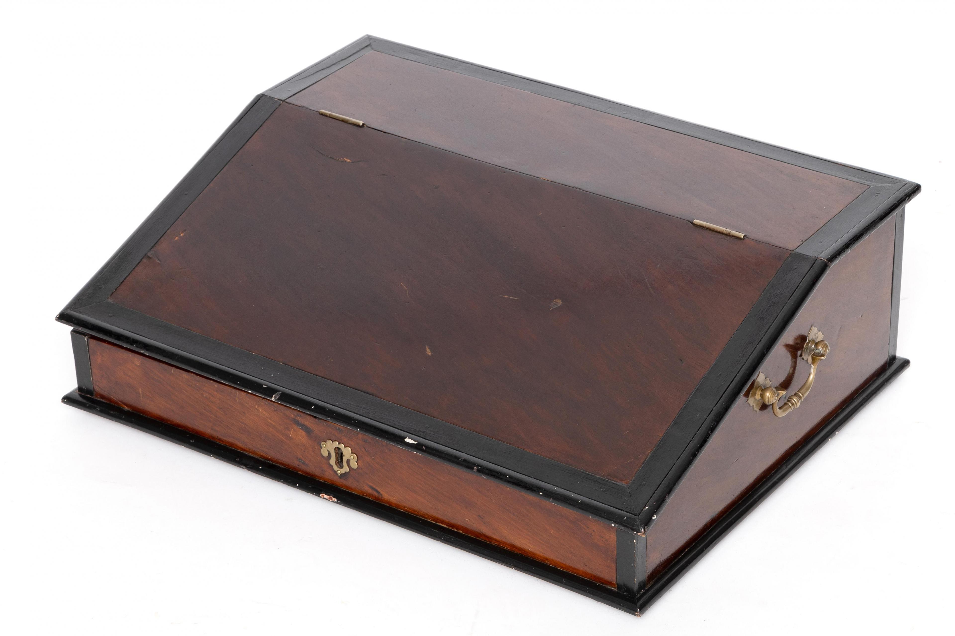Schuin klep waarachter interieur met zes laden. De zijkanten met koperen beslag.