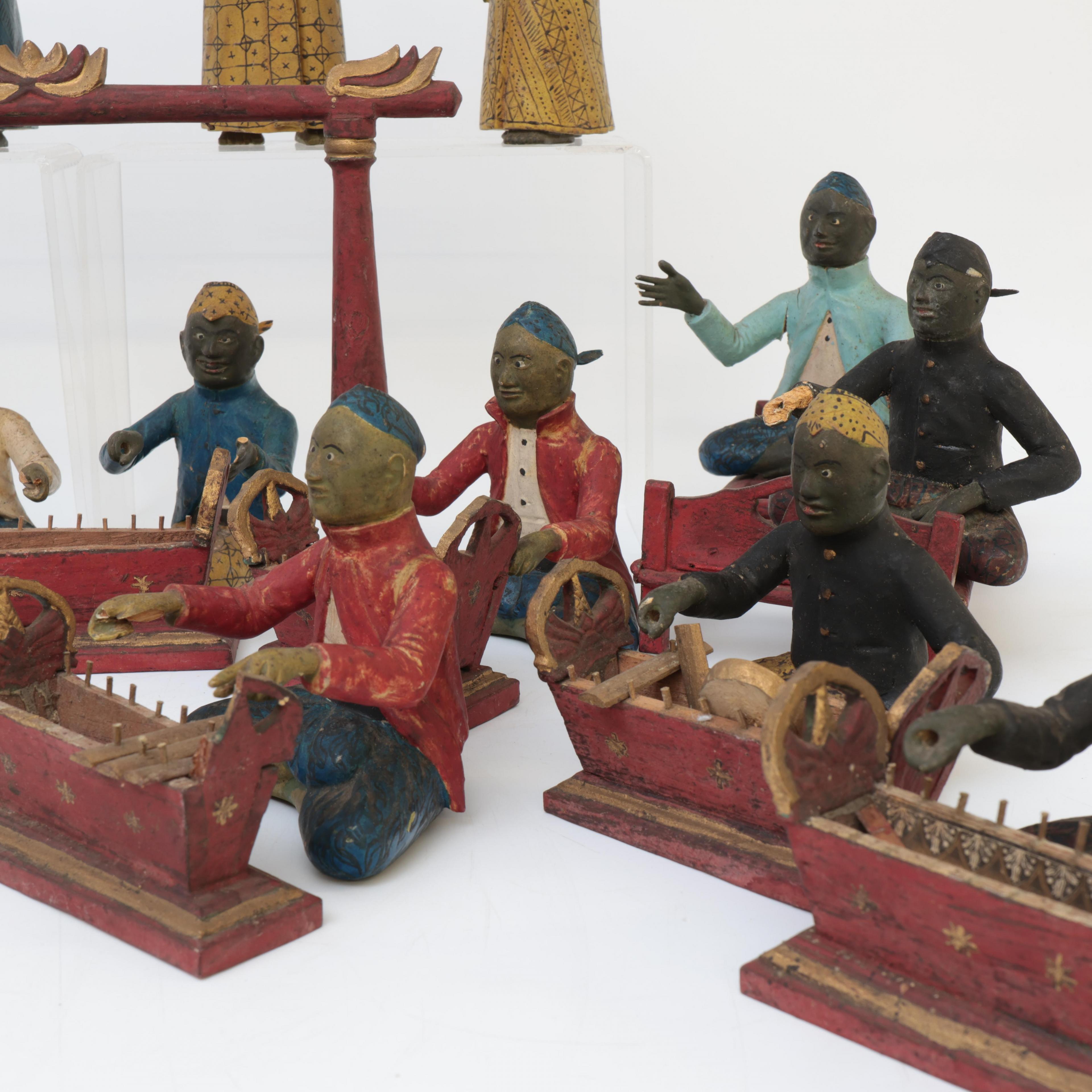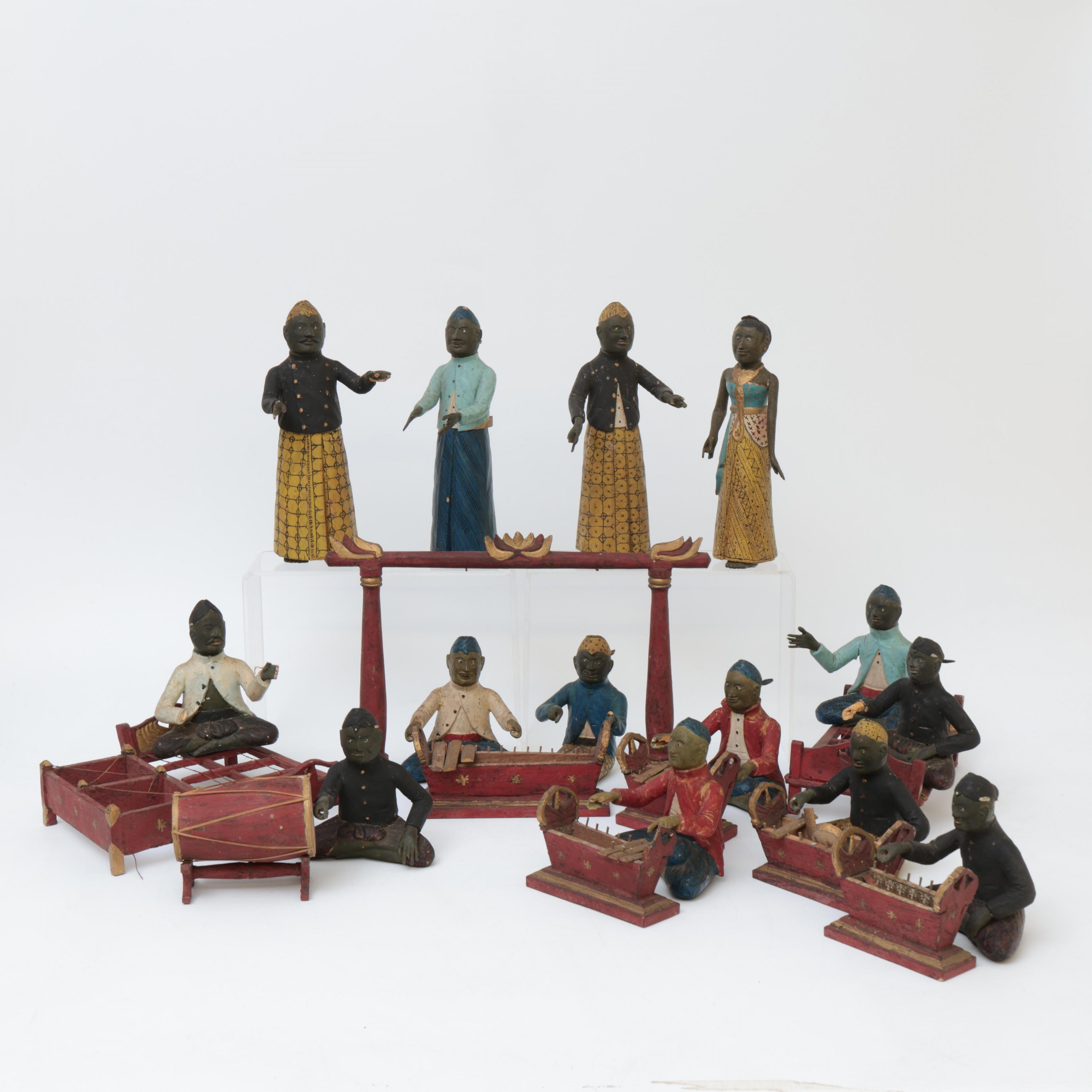 Consisting off ten seated players and four standing figures. Two gong beds, a drum bed, five xylophones, large gong holder a drum and various attributes. (incomplete)