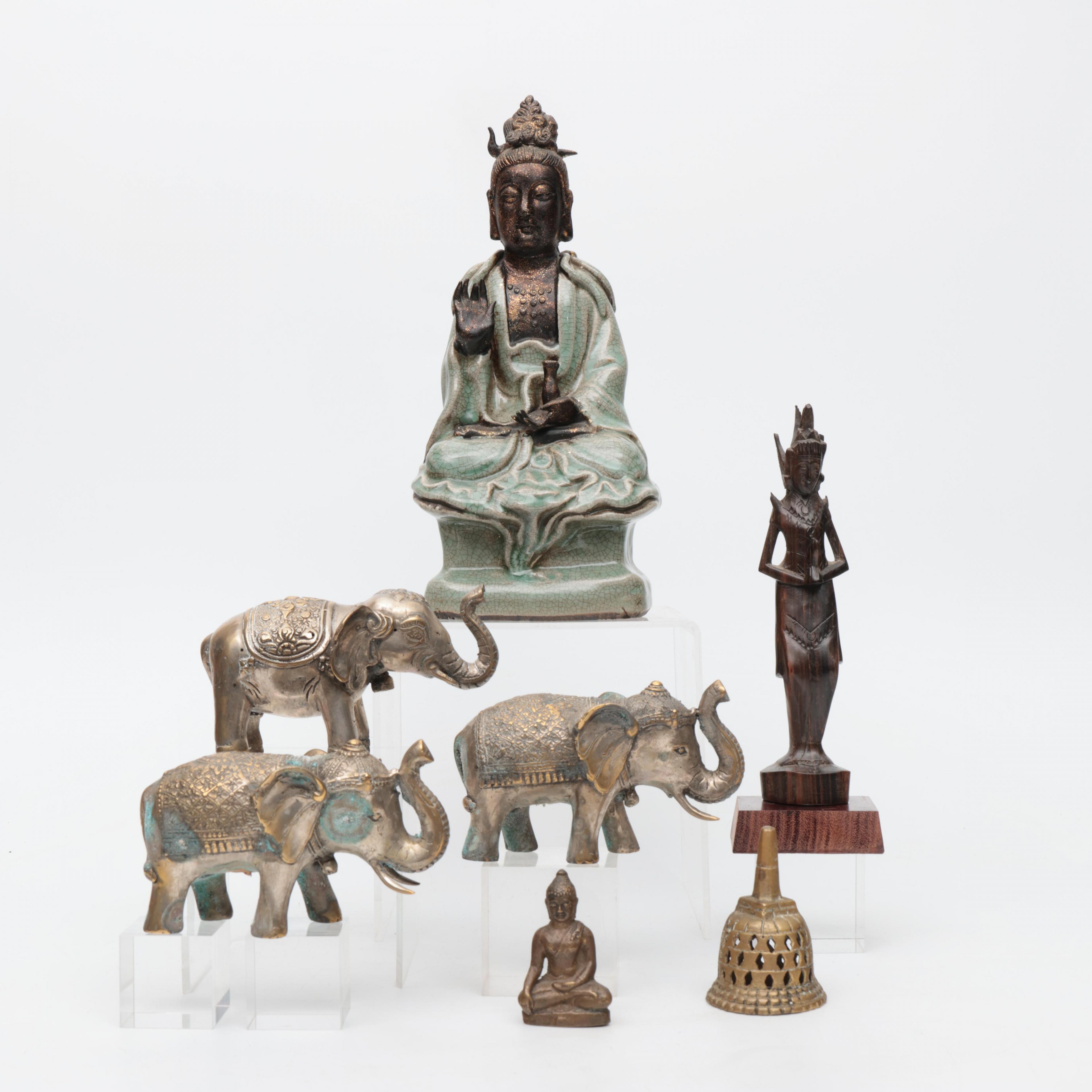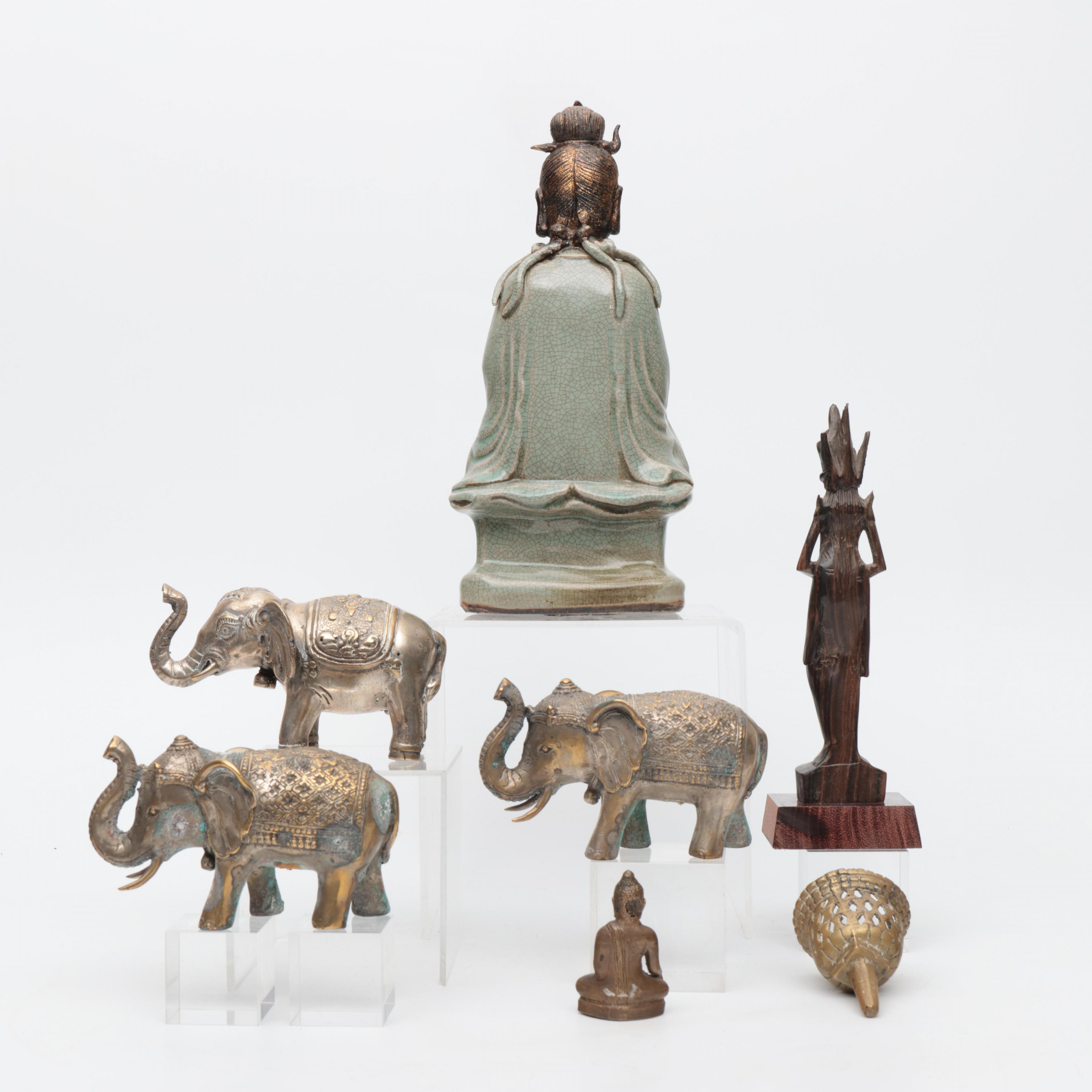w.o. drie Thaise koperen olifanten, celadon Guanyin en bronzen Boeddha.