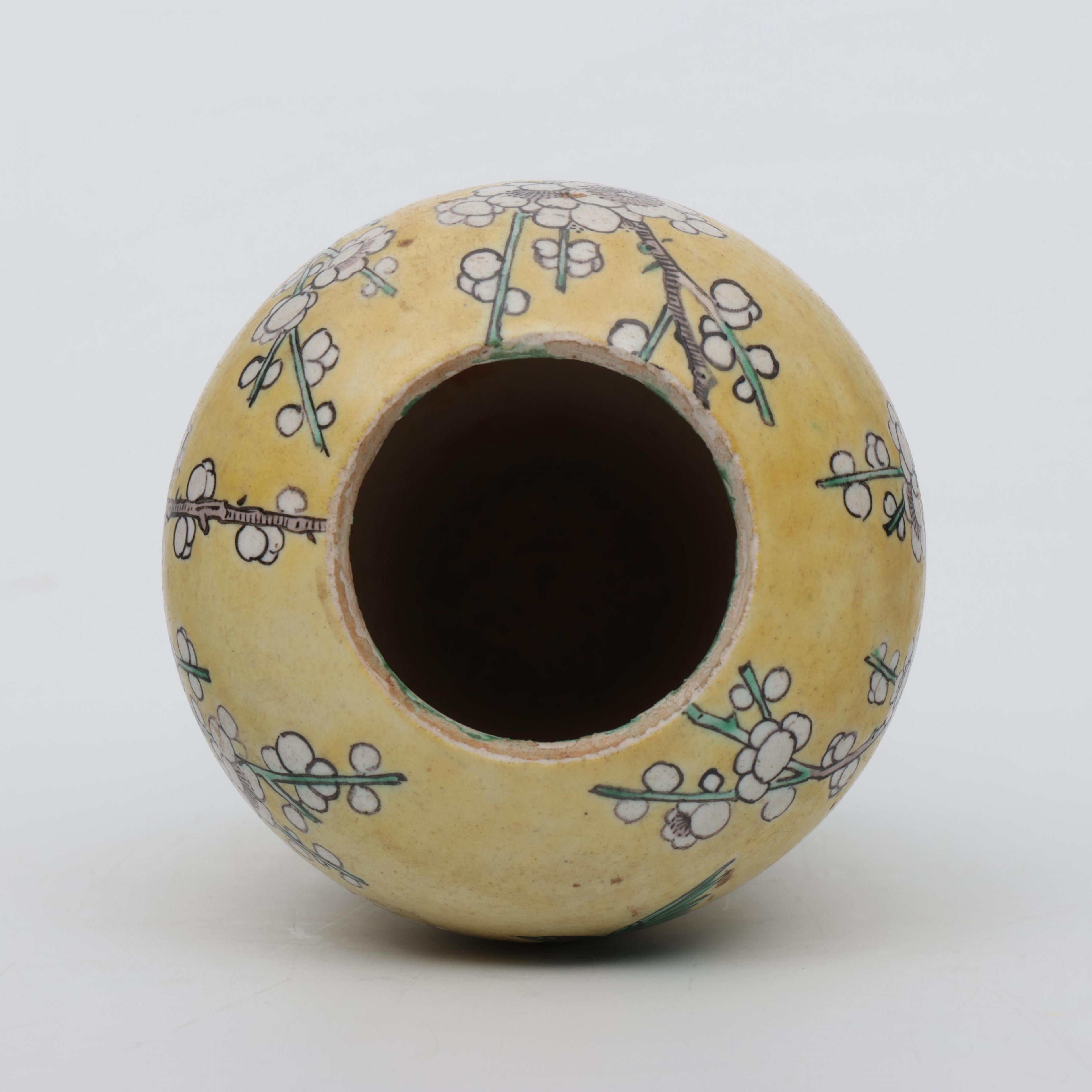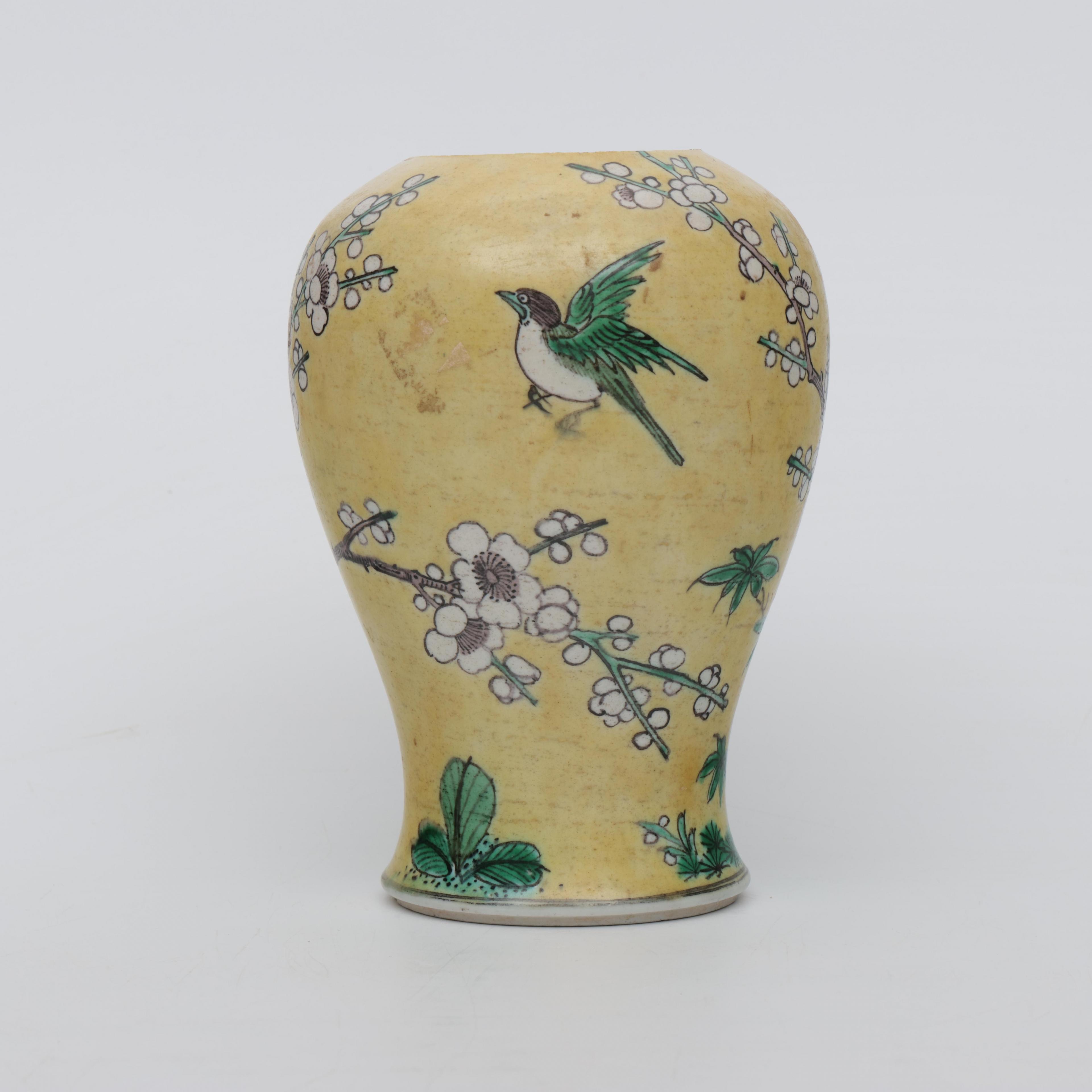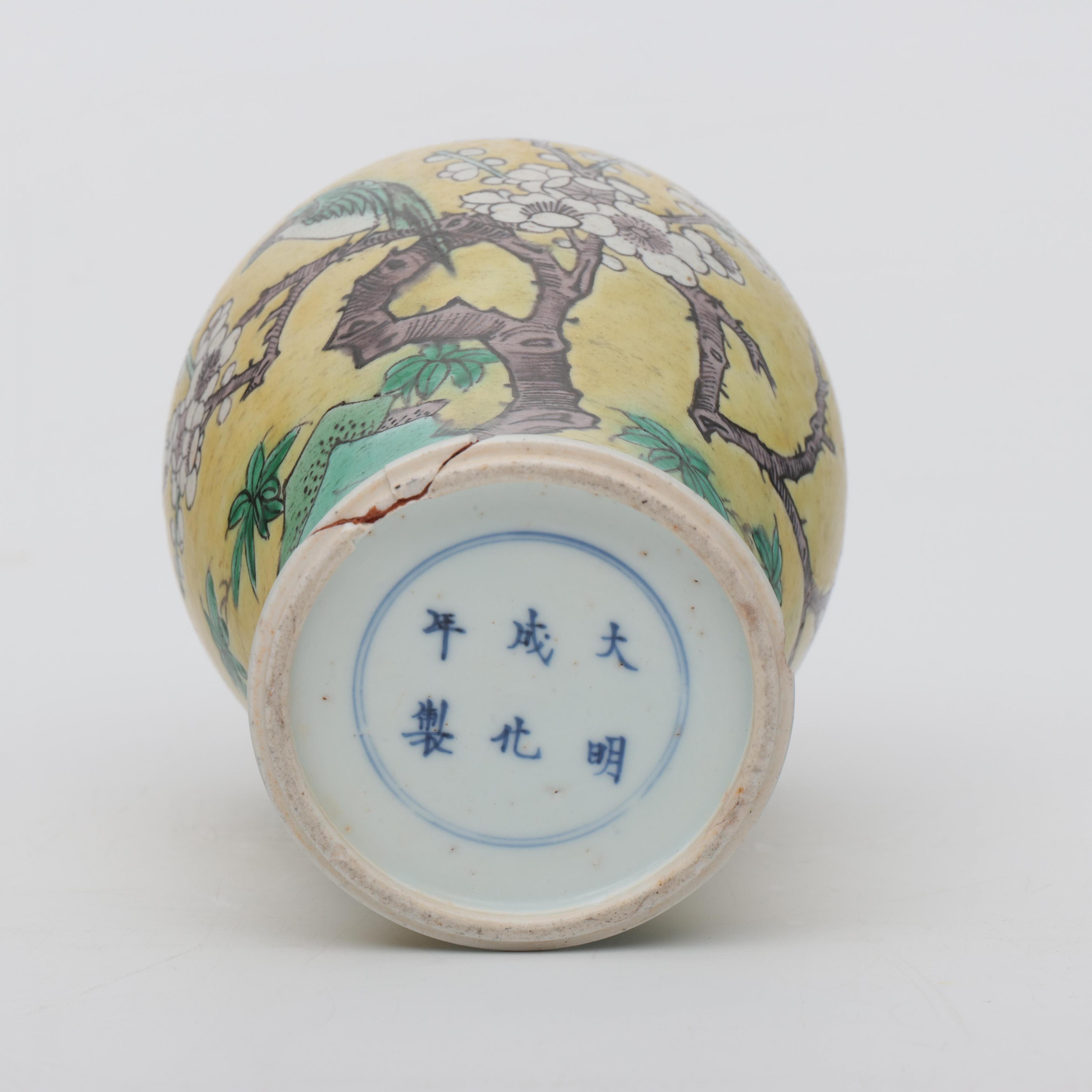 enamelled on the yellow ground with birds among flowering prunus branches, the base with an apocryphal Chenghua mark (neck reduced and reglued chip to the foot)