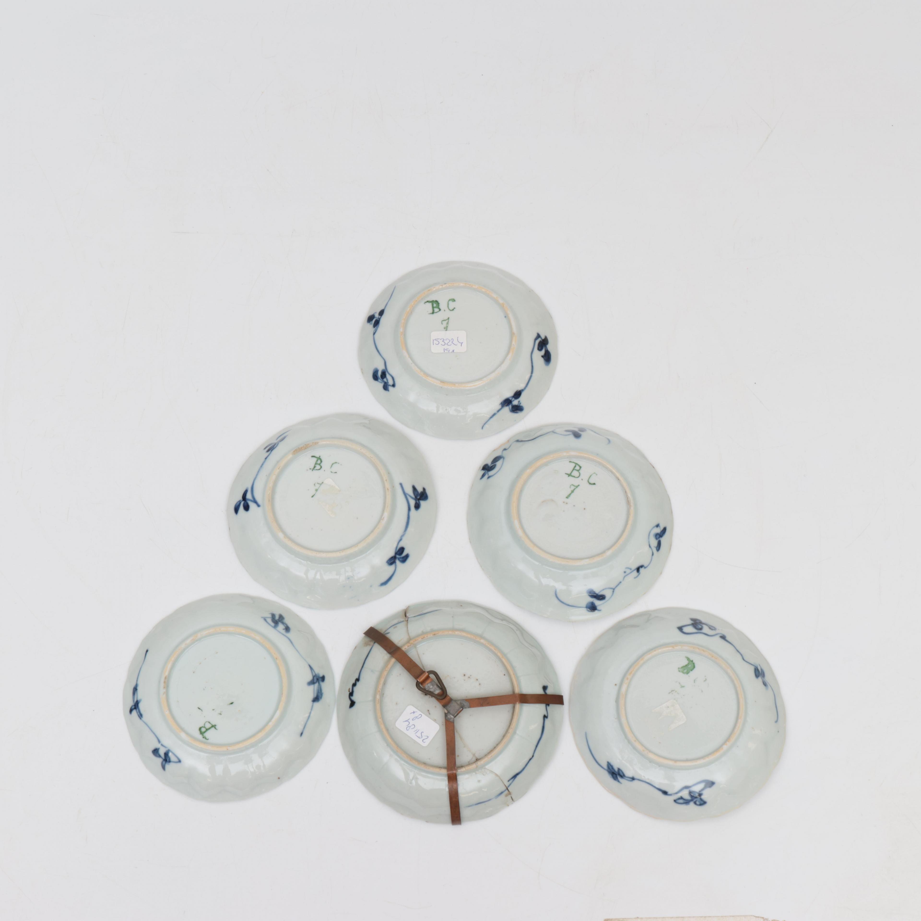 comprising a set of five floral saucers with ribbed sides, a set of four saucers with butterfly and flowers, a set of three floral saucers and two single saucers (various damages and repair)