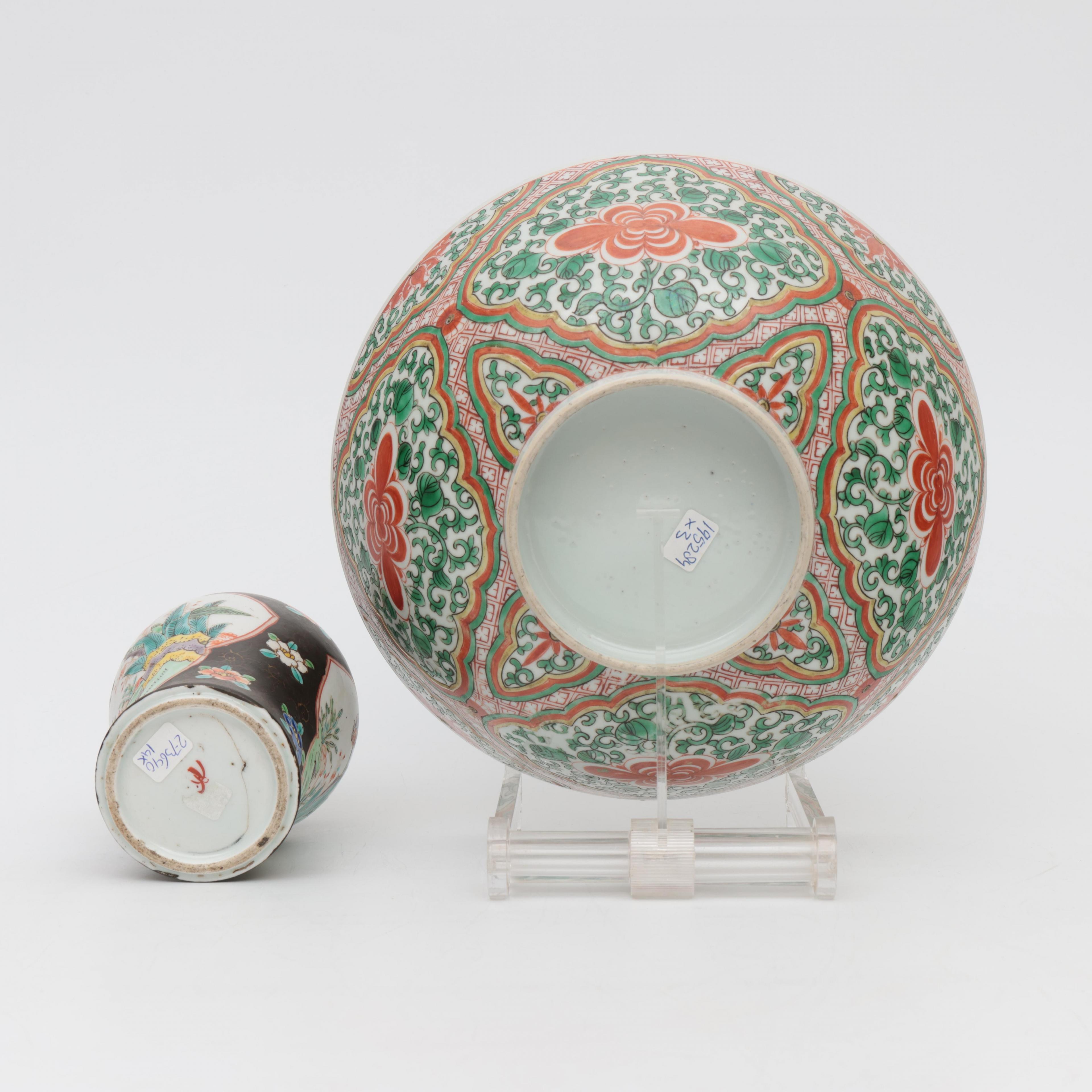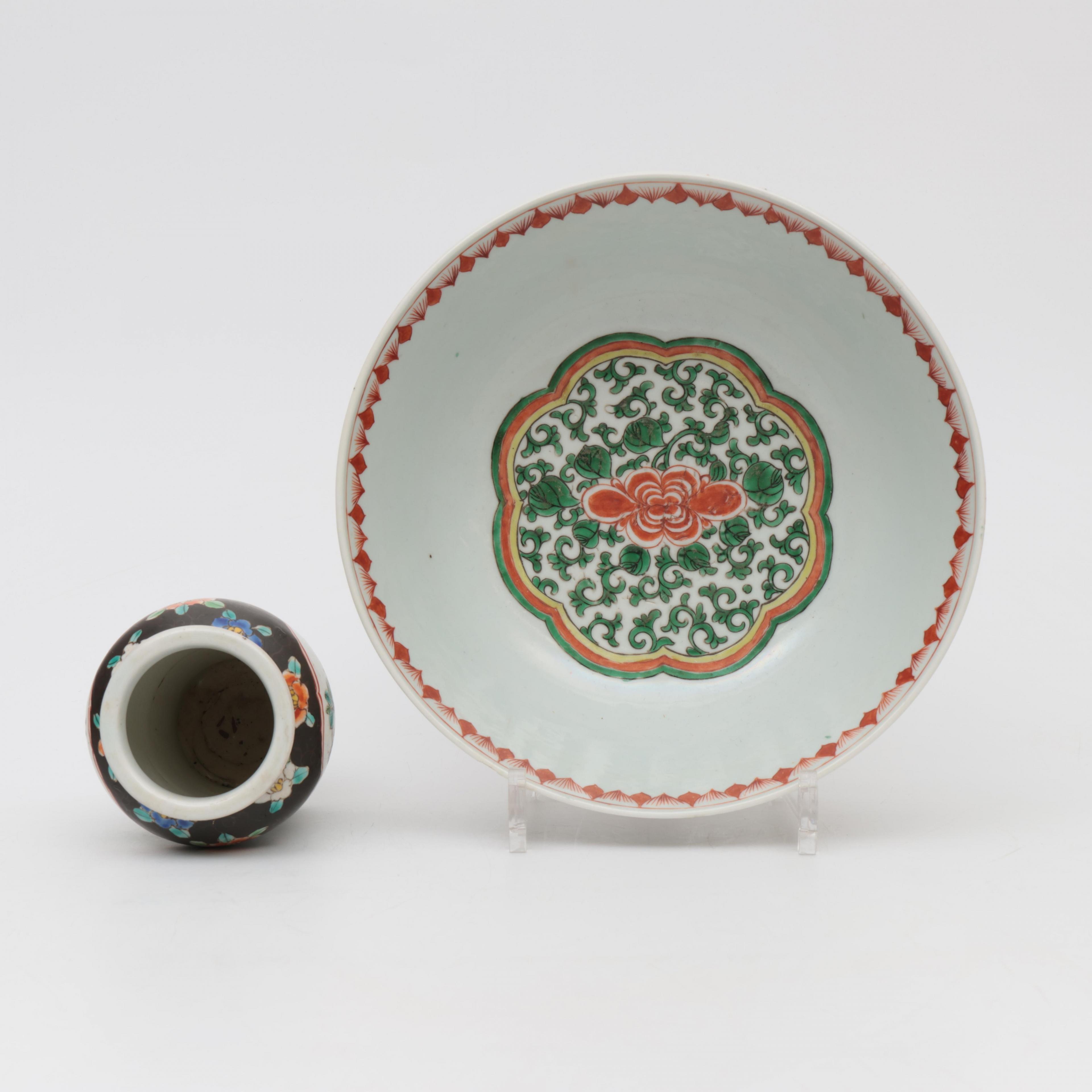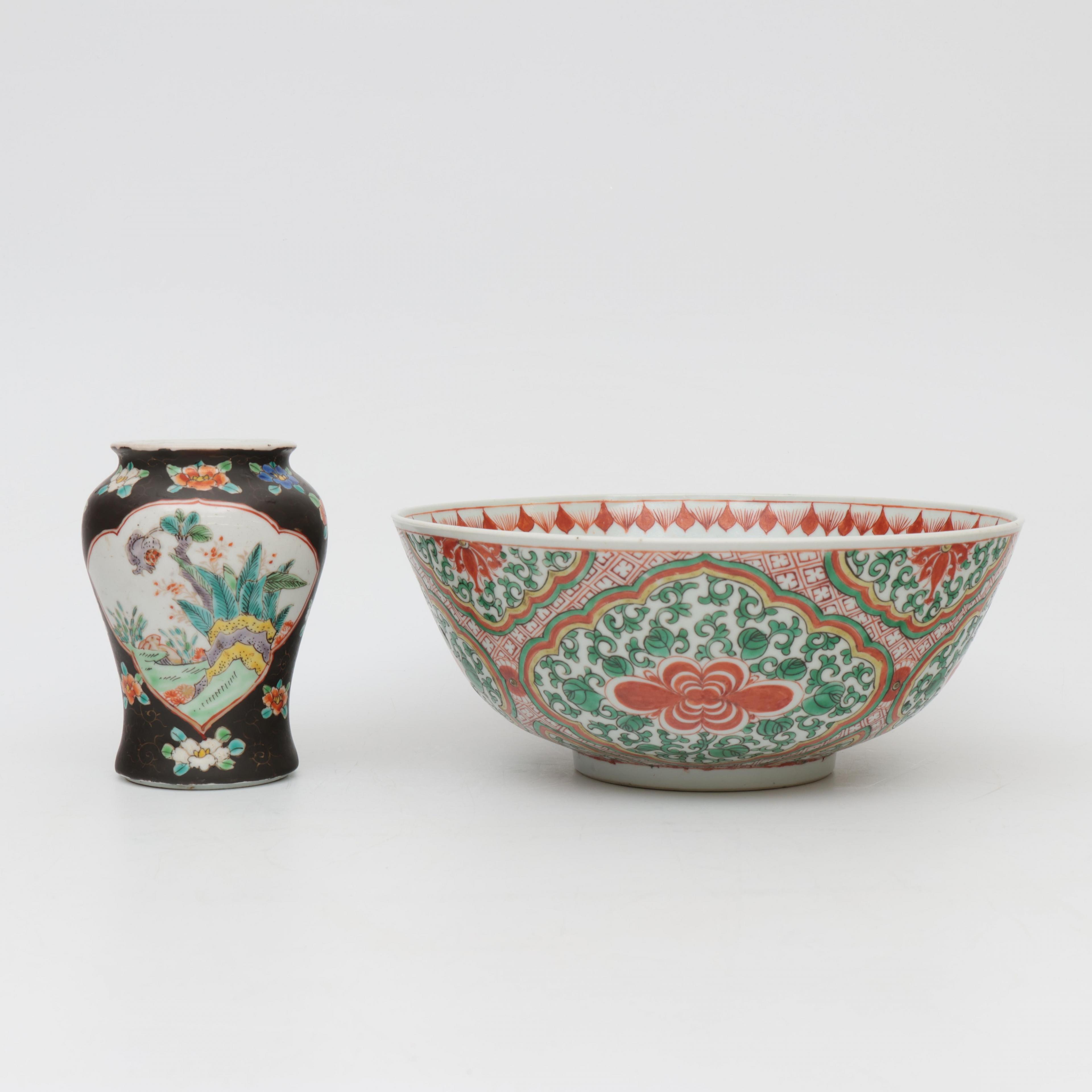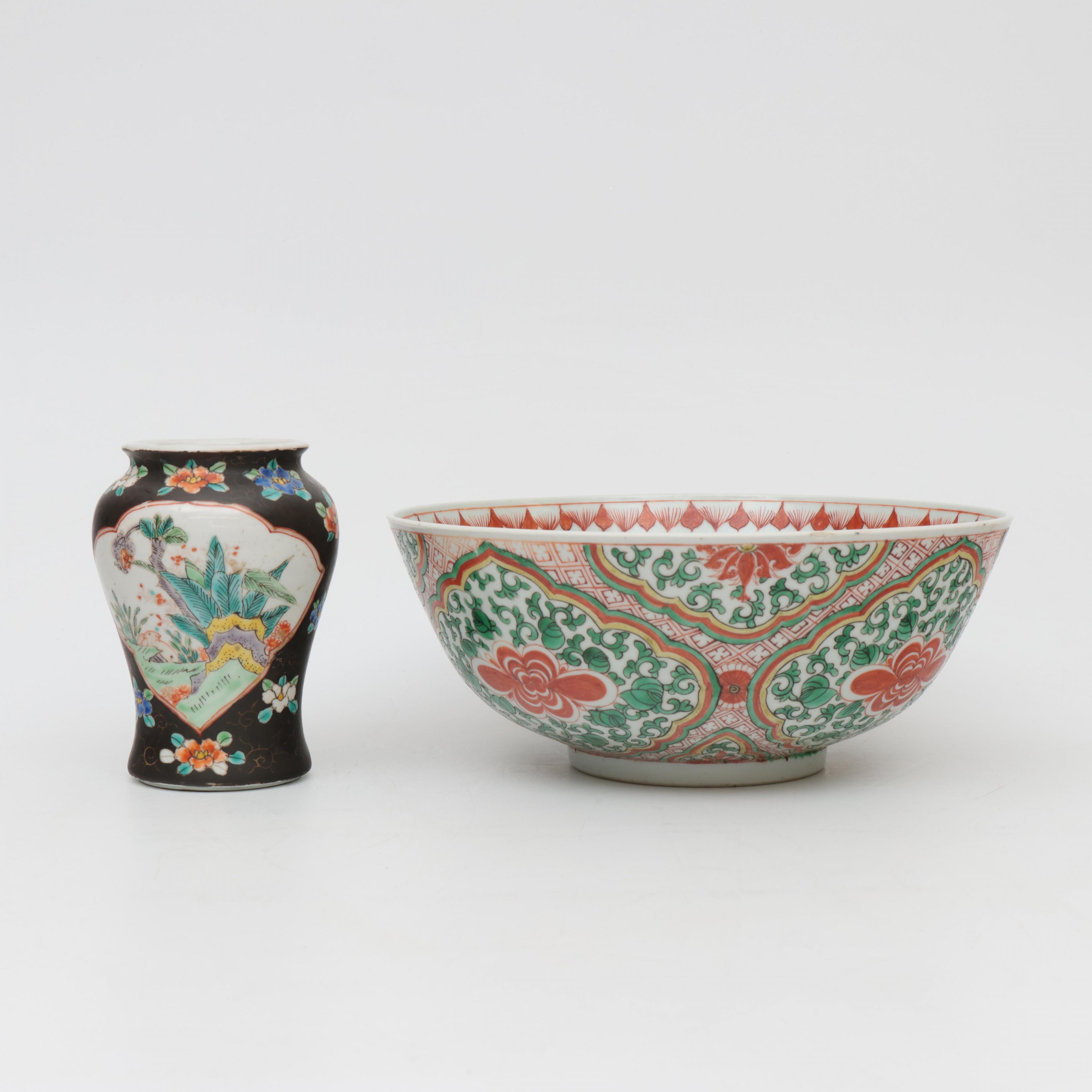China, a famille verte porcelain bowl and a small vase, 19th century,