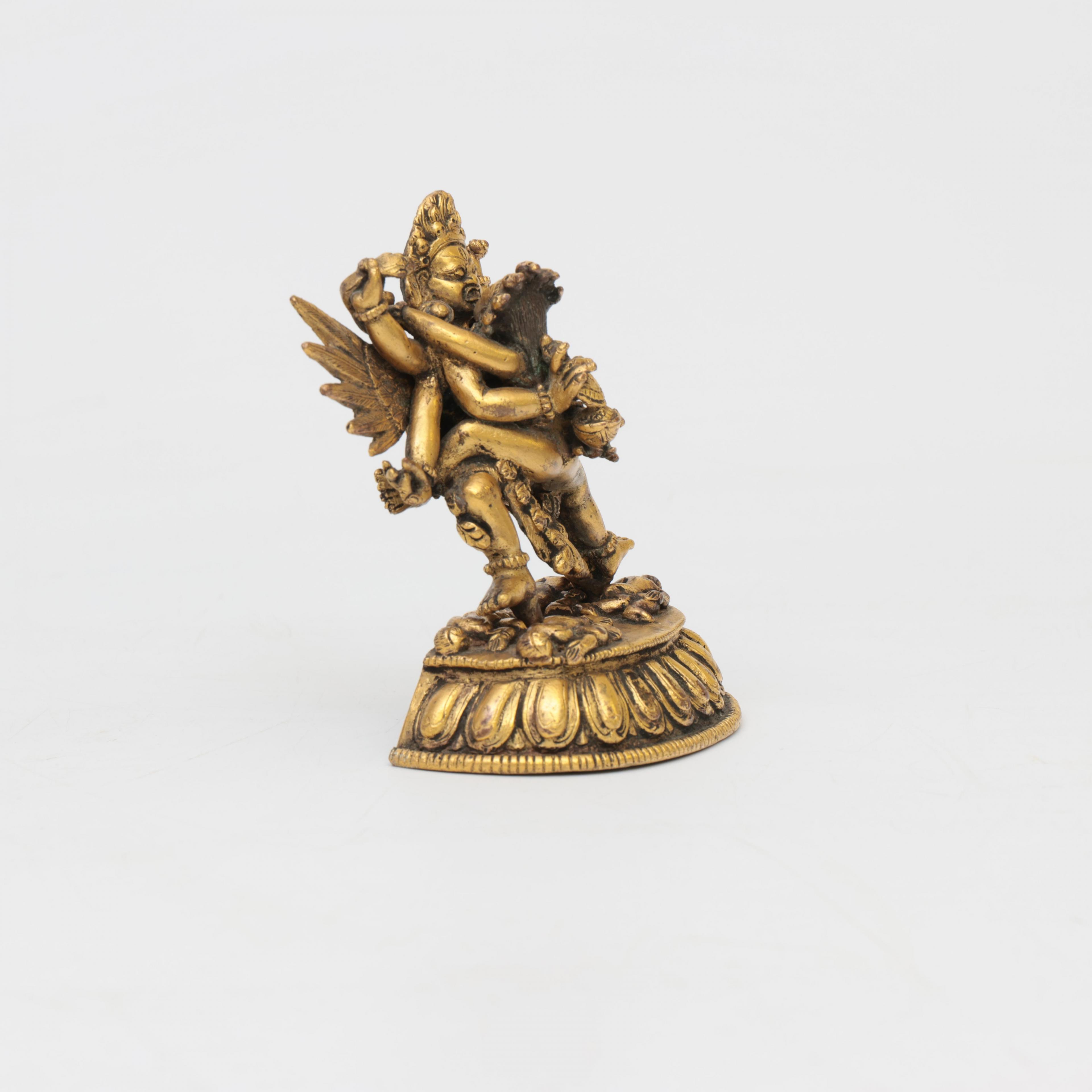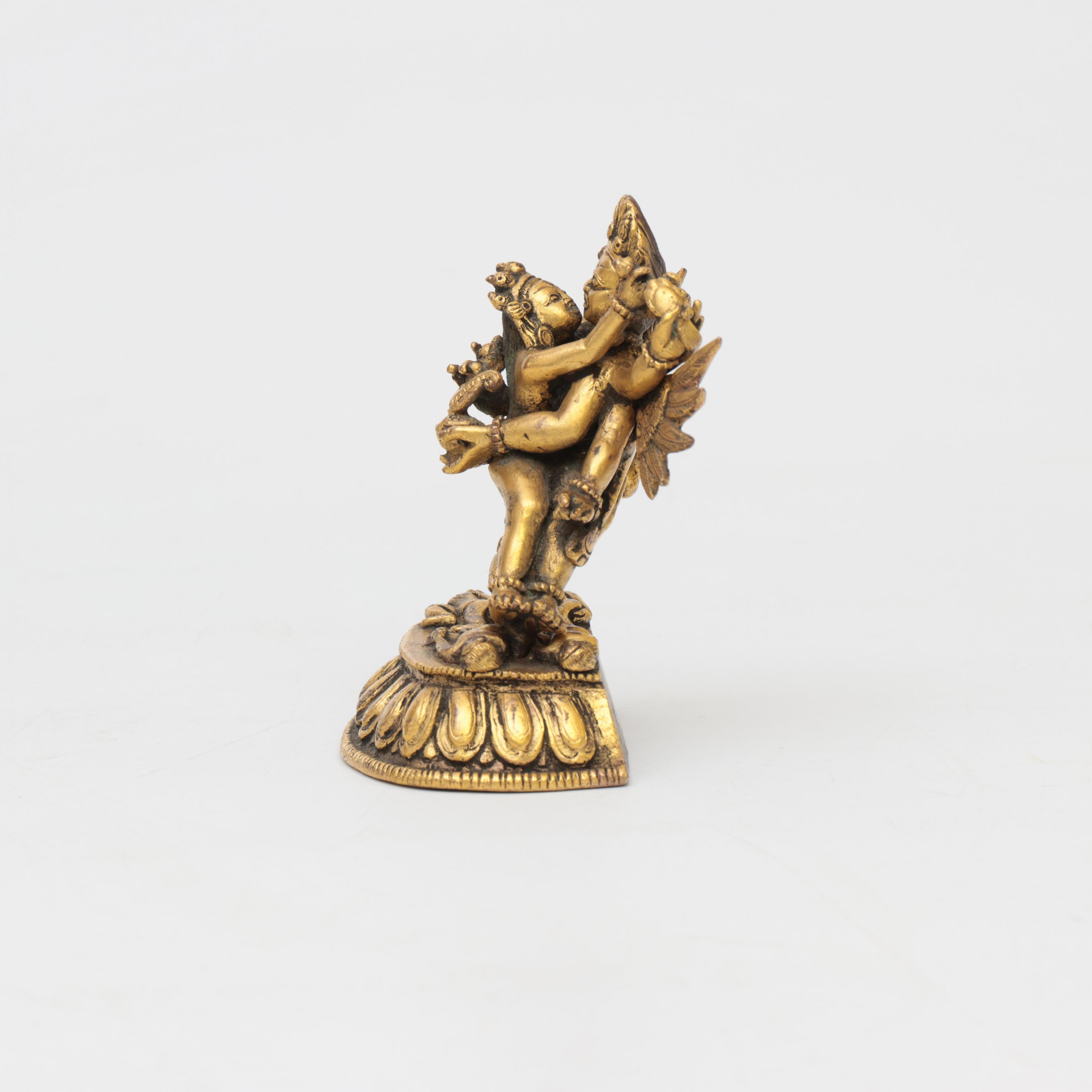 standing in pratyalidha on four demons, holding his consort Vajravarahini in yab-yum, his arms holding the skull-cup (kapala) and knife (kartika), base sealed