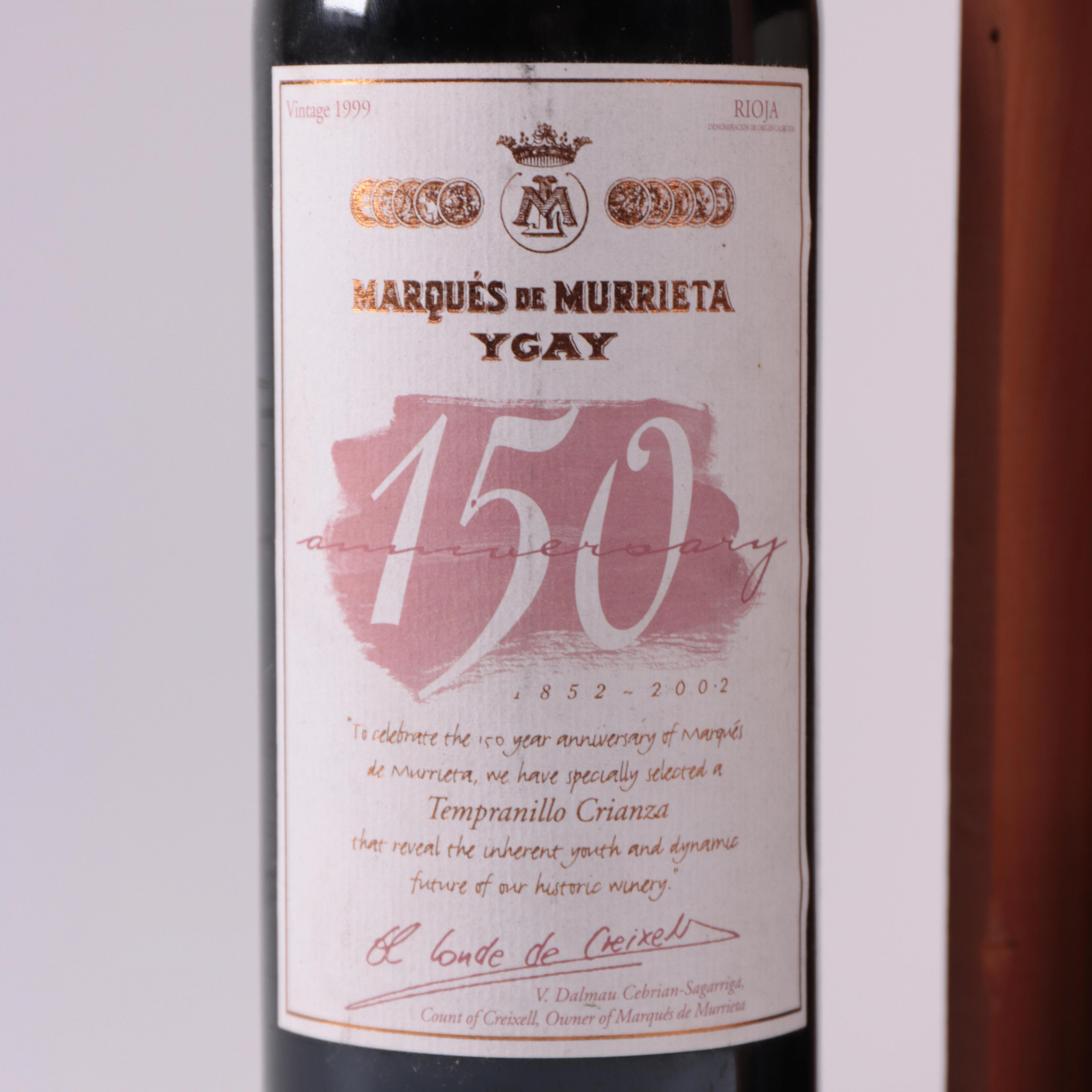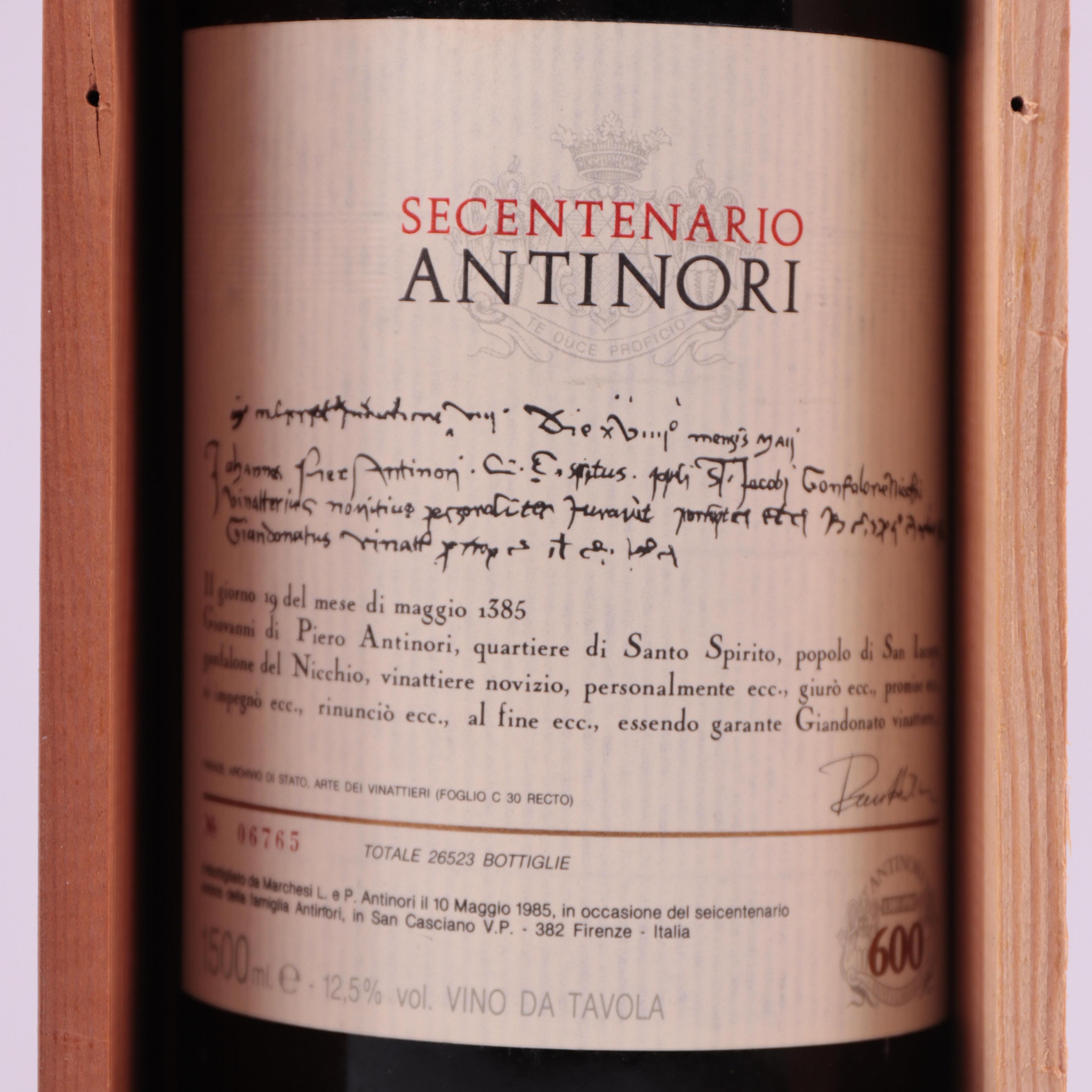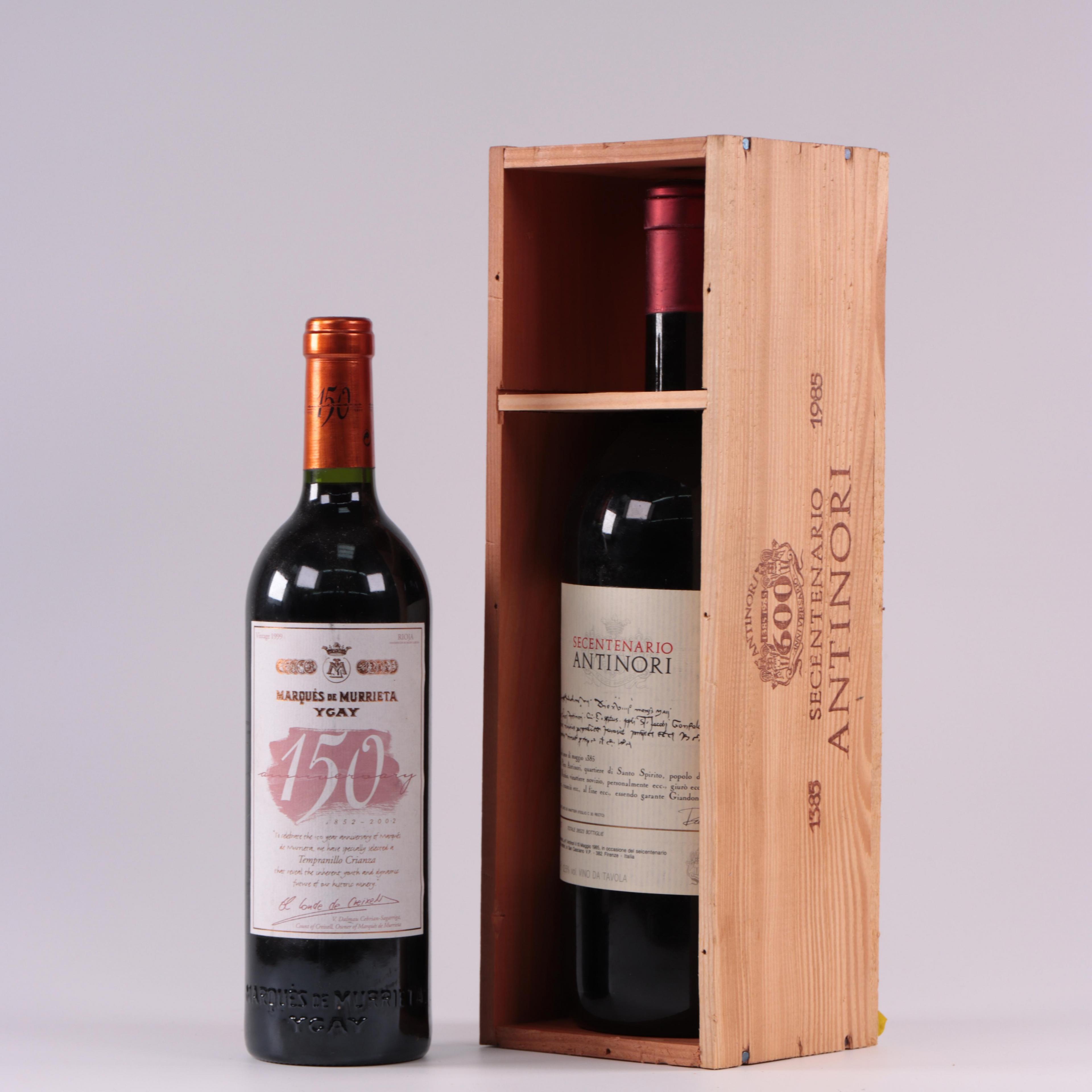 Twee jubileum flessen wijn, rood, Italië/Spanje; Magnum Sentenario Antinori 1385-1985, nr. 06765, in kist; Marques di Murrieta Ygay, 1852-2002.
