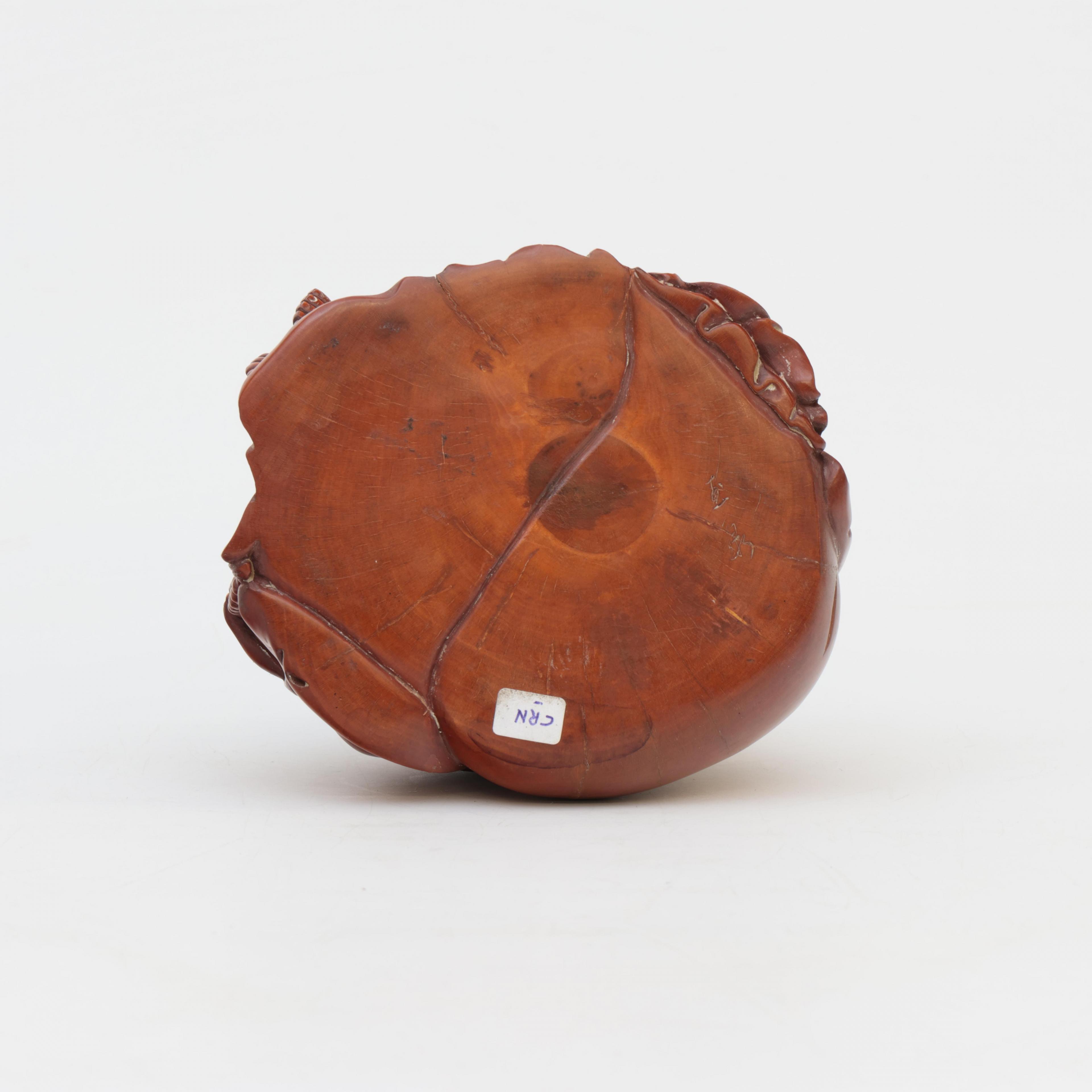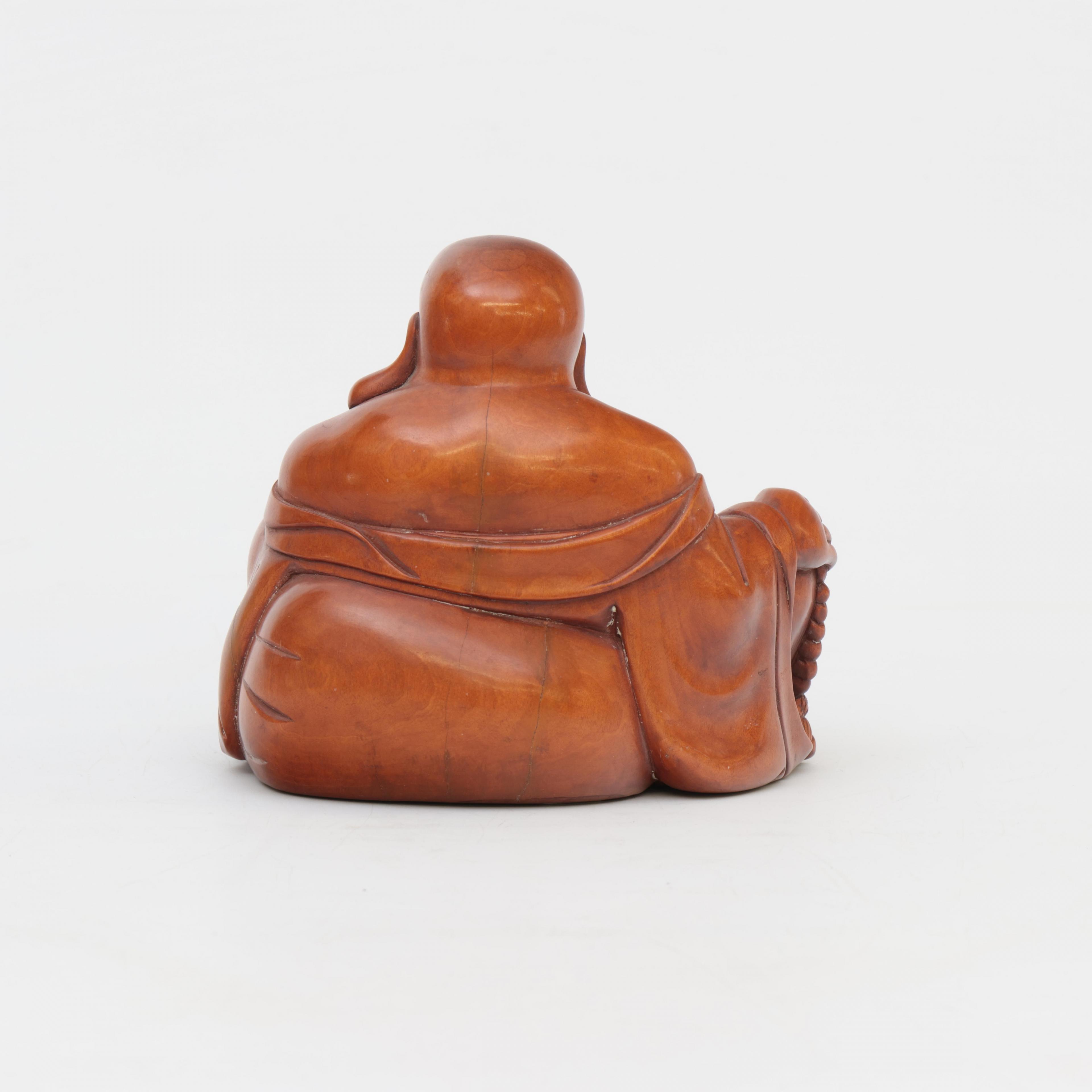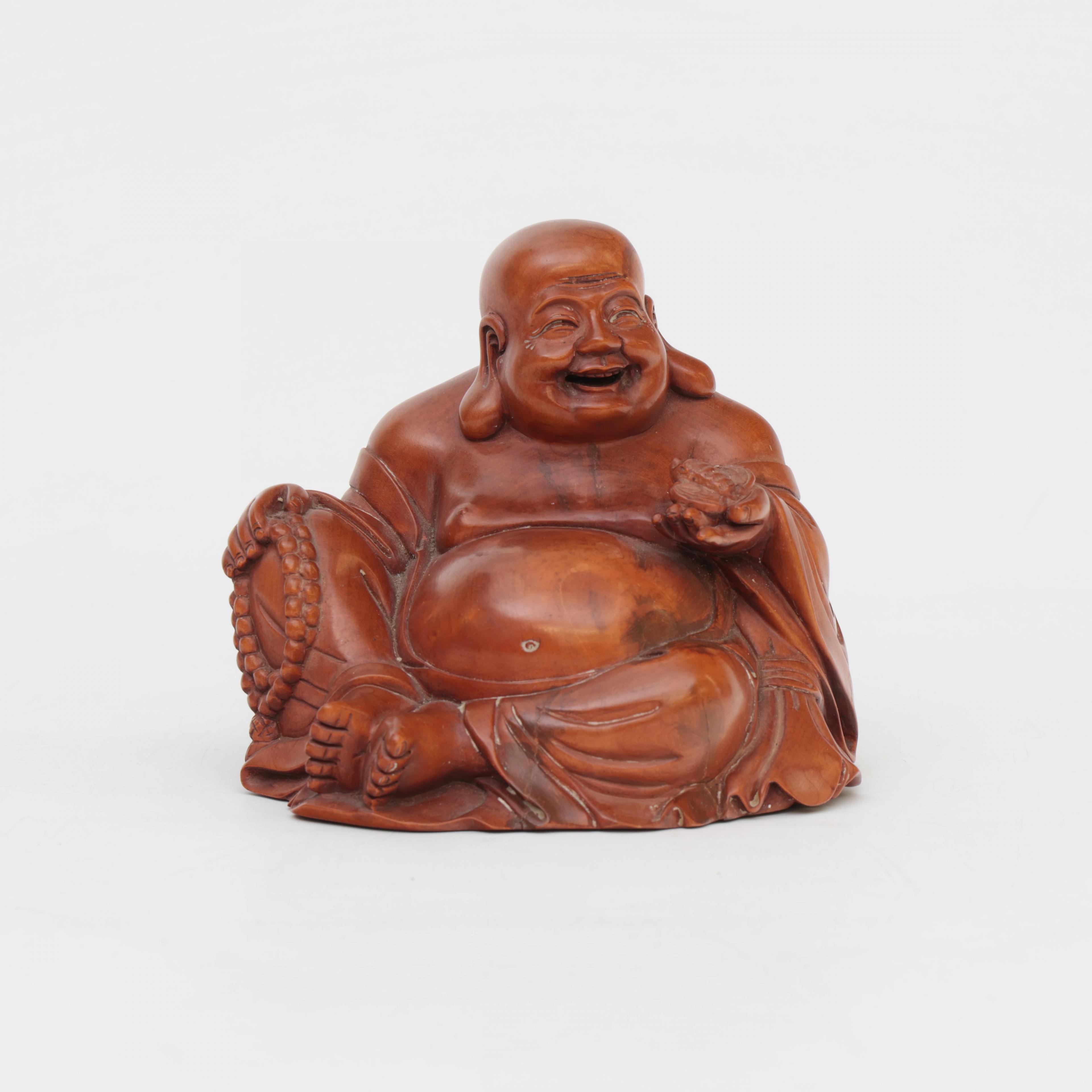 seated with his belly exposed, holding a butterfly and a string of beads, the base marked with two characters