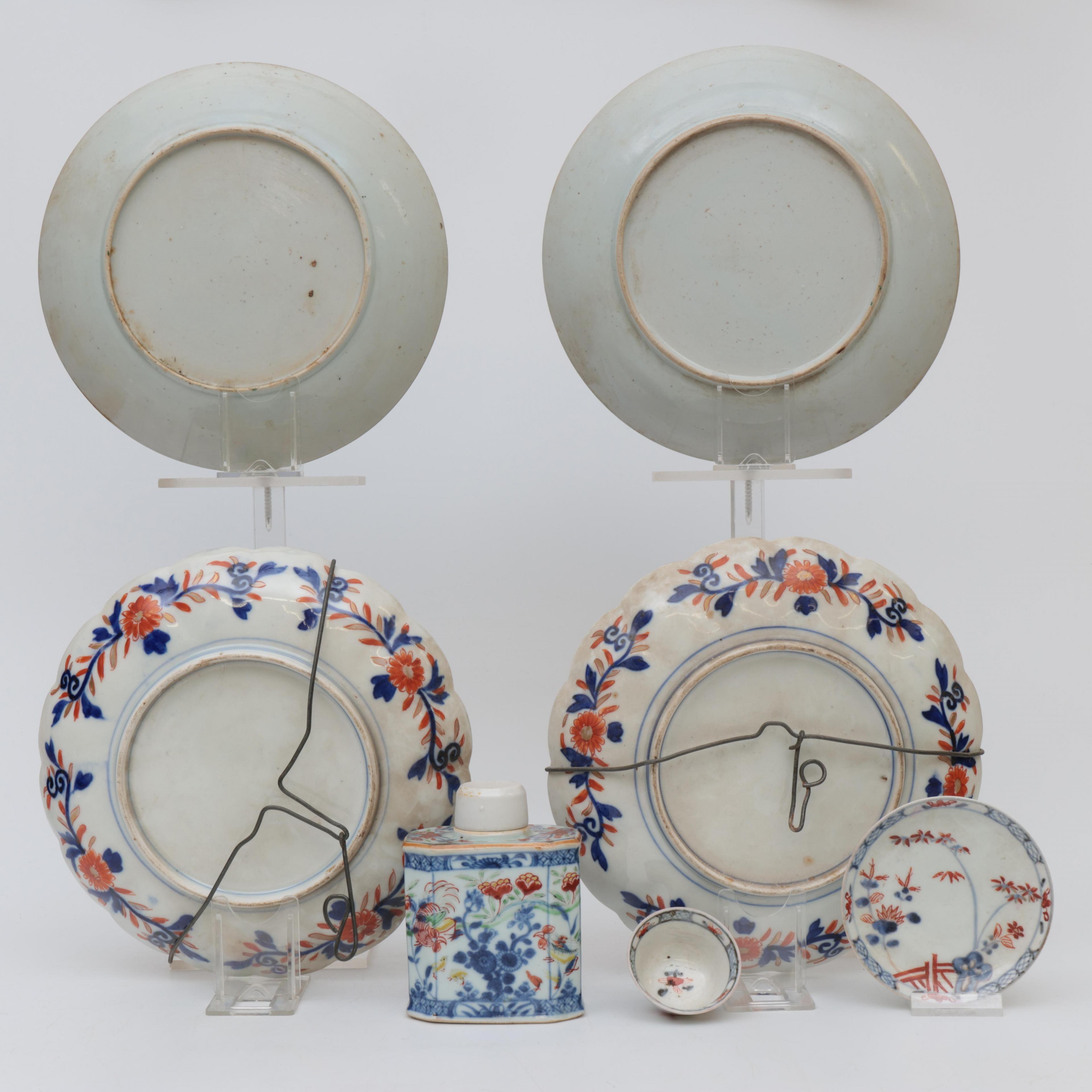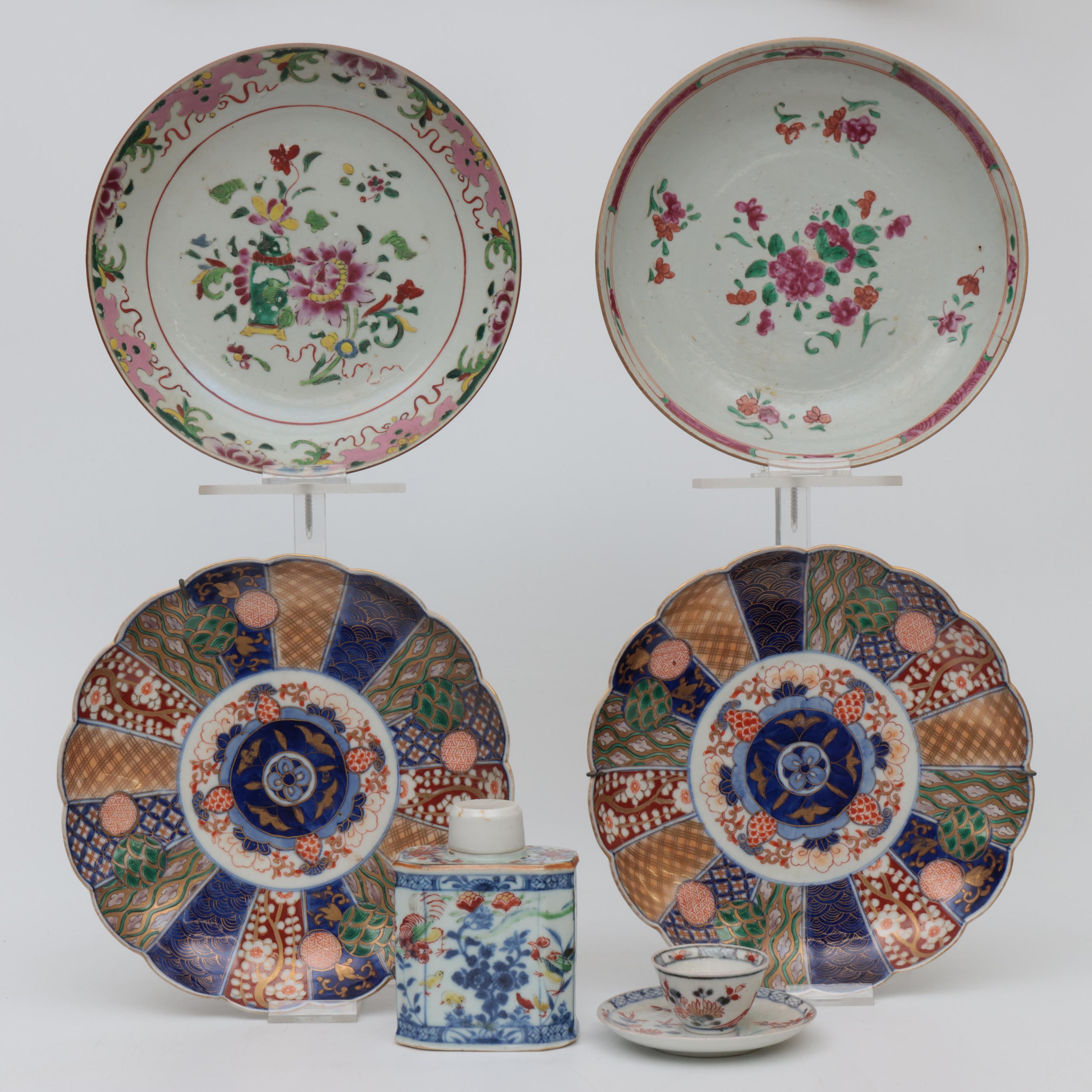 comprising two Chinese famille rose plates, a pair of Japanese Imari plates, an overdecorated tea-caddy and a cup and saucer