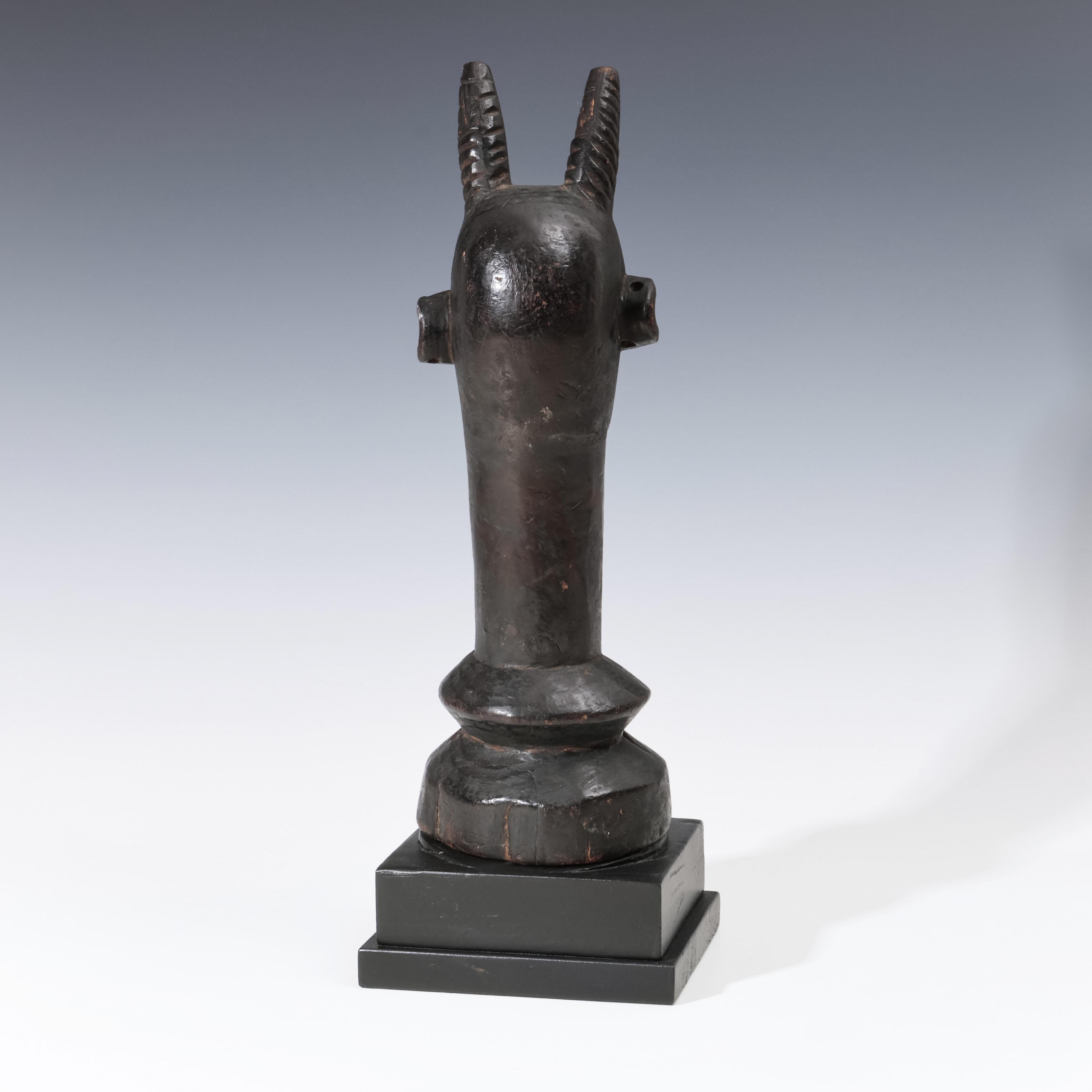 a horned figure with pierced nose, neck showing a disc shape, the cilindrical base with pierced attachment hole. Black patina.