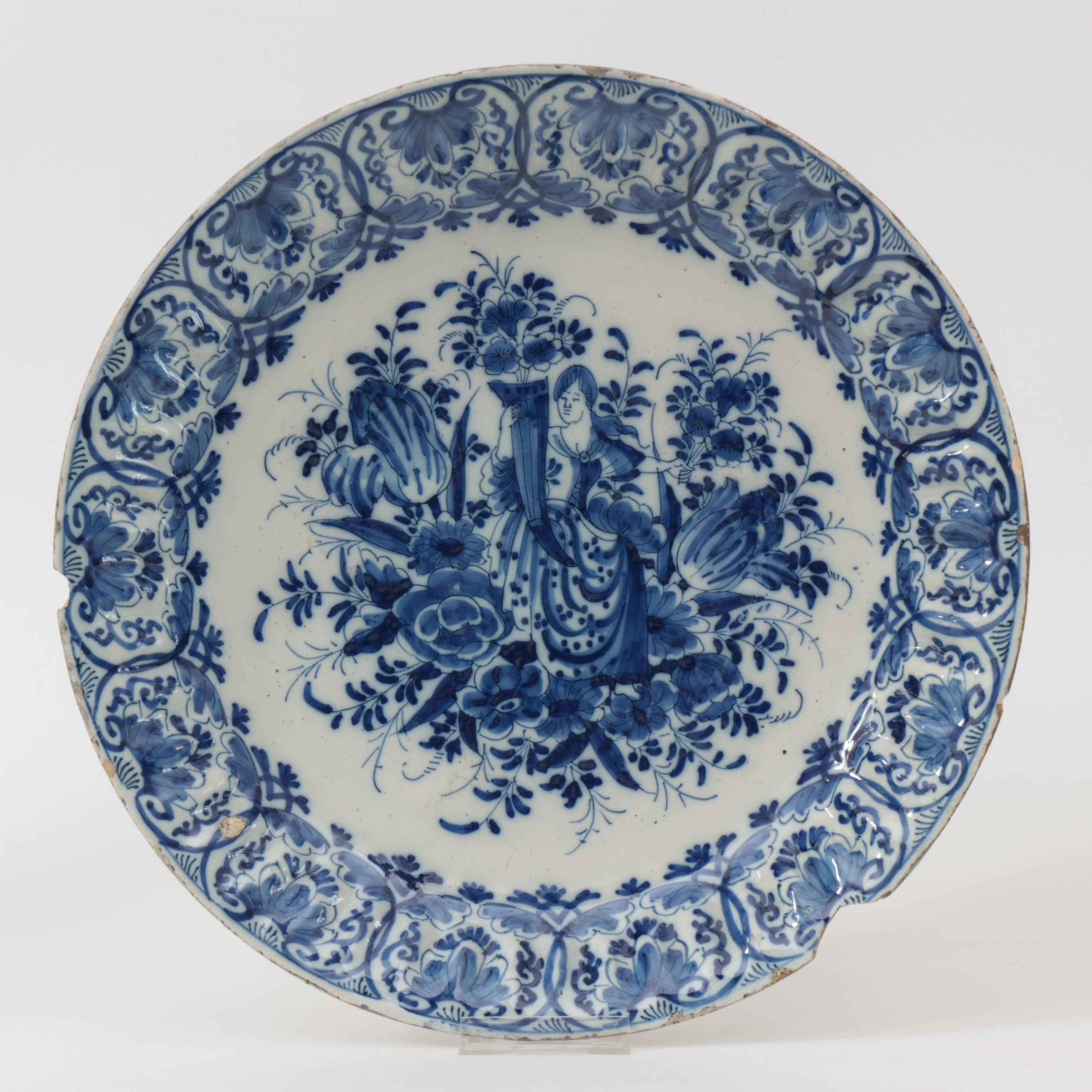 Uitgevoerd met voorstelling van Vrouwe Fortuna in florale setting. (twee chips, randschilfers).