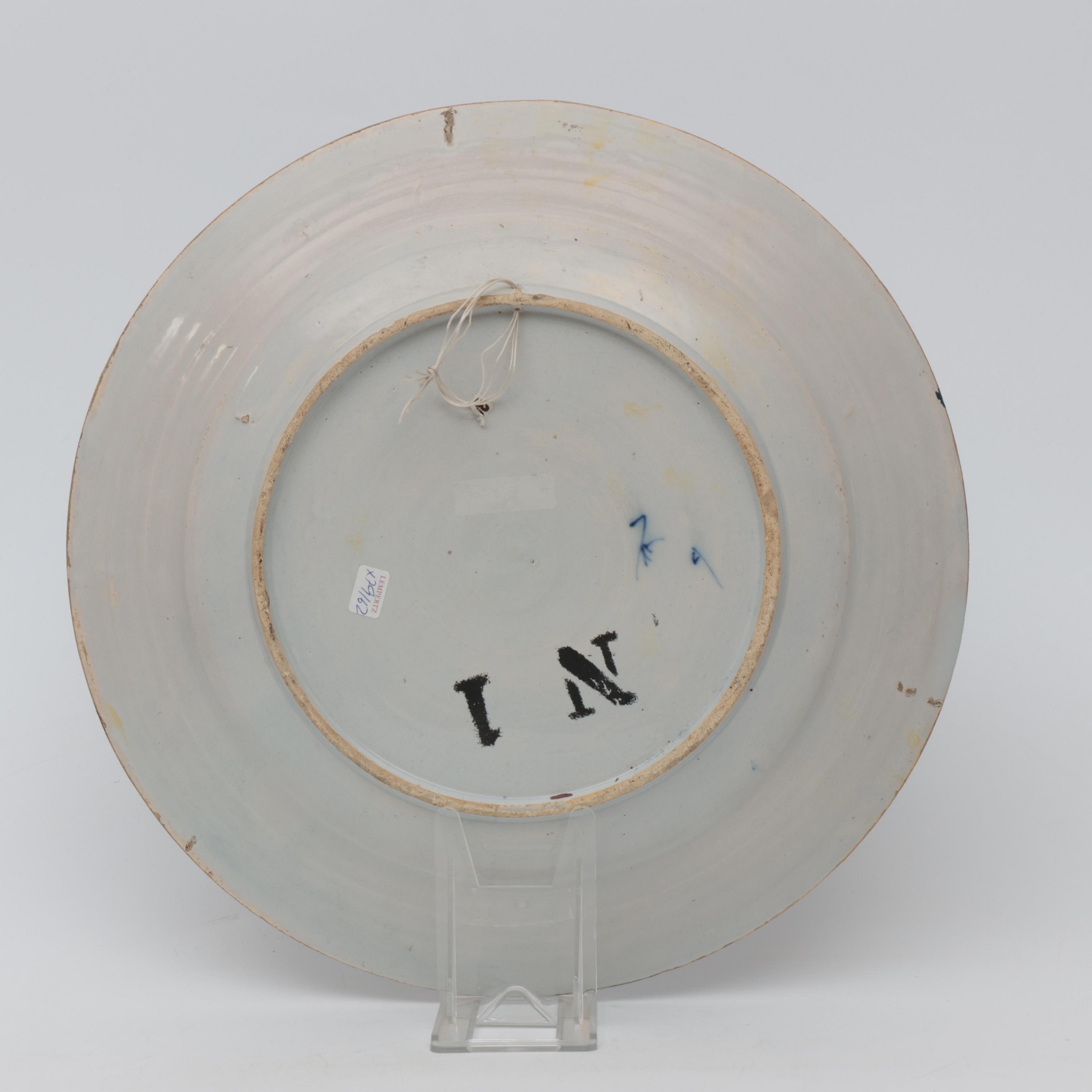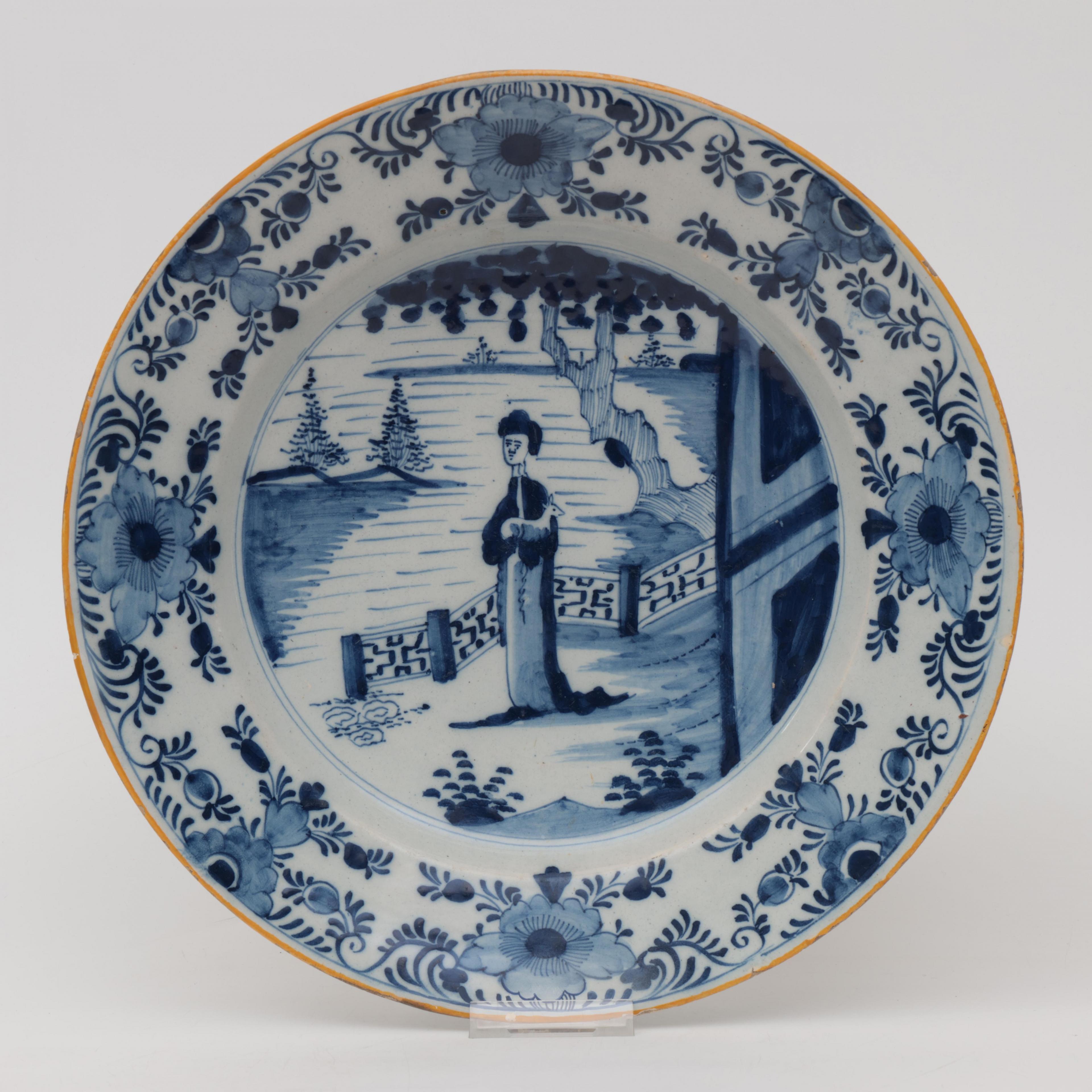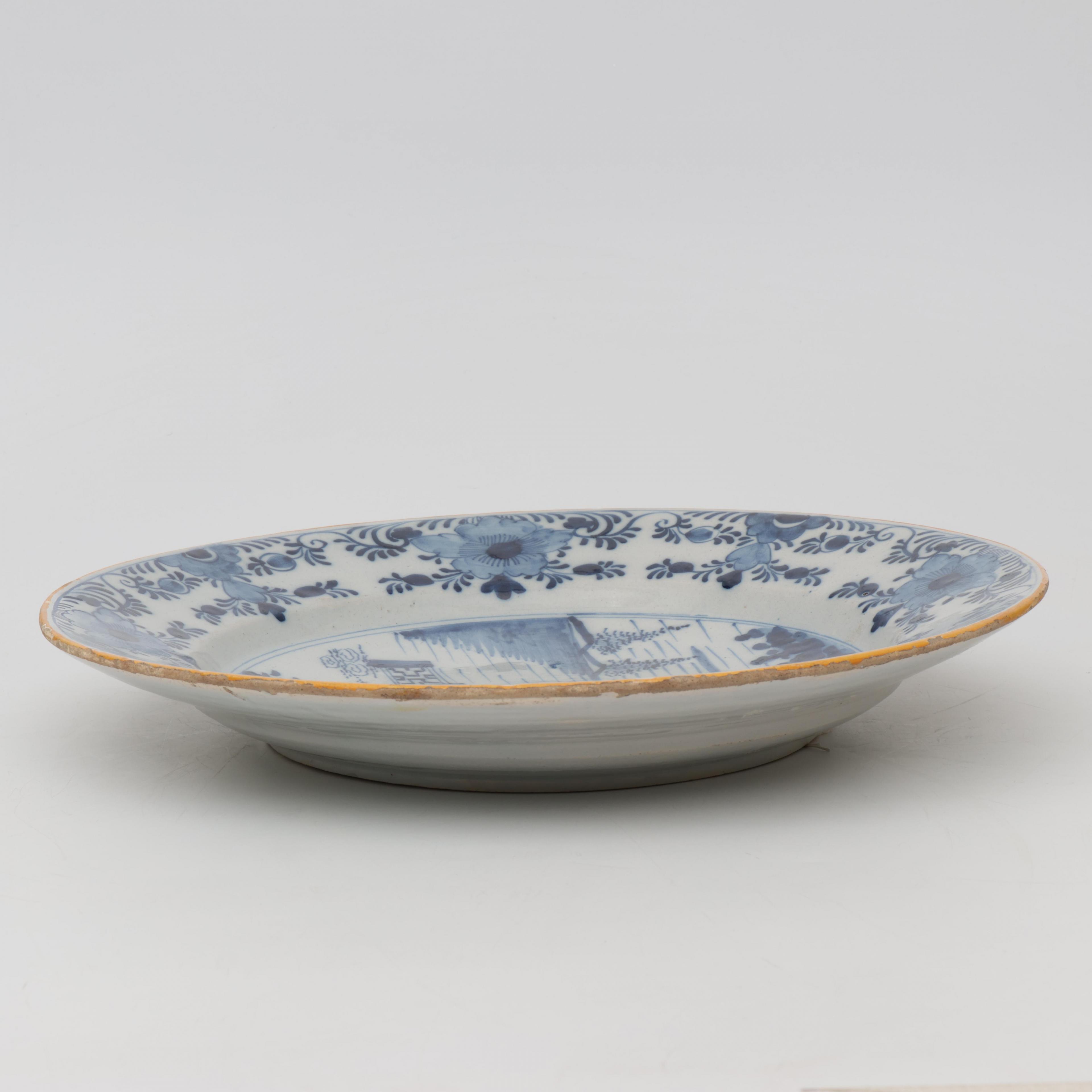 Delft, blauw wit aardewerk schotel met Chinoiserie decor, 18e eeuw;