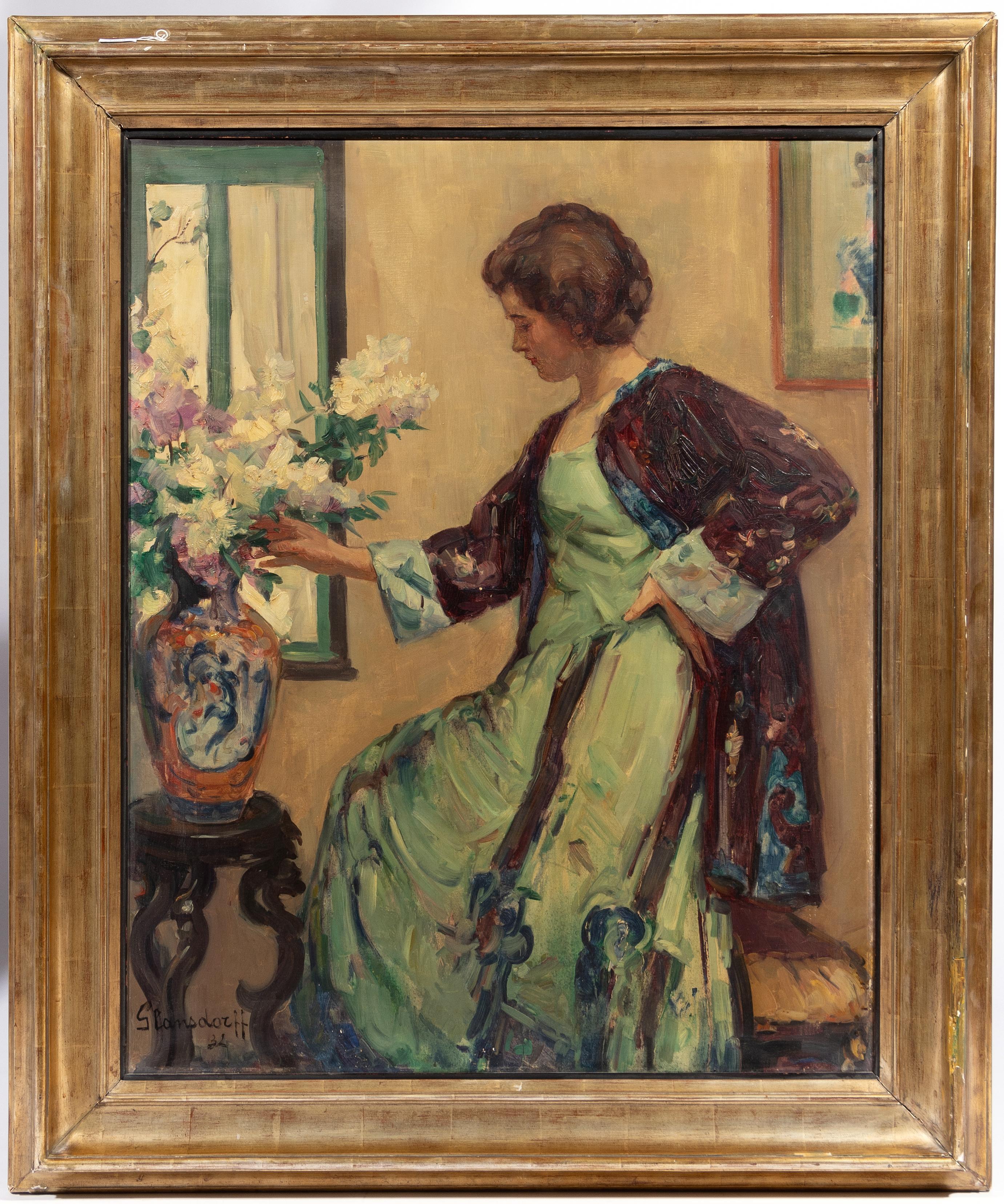 Dame in een interieur bij een porseleinen vaas met bloemen