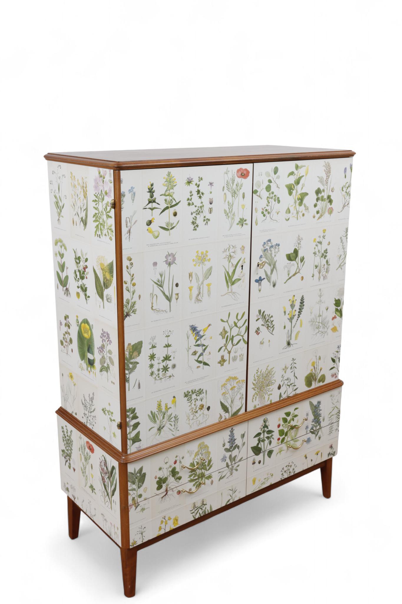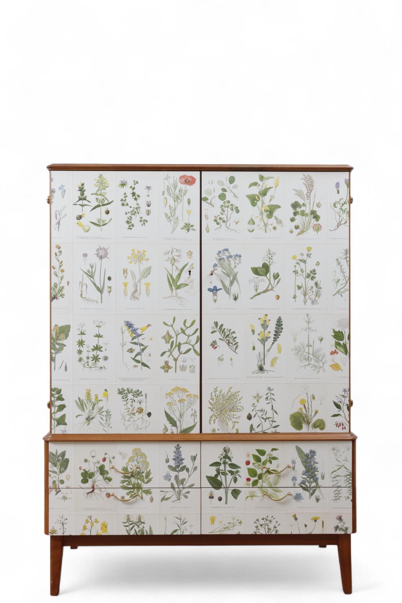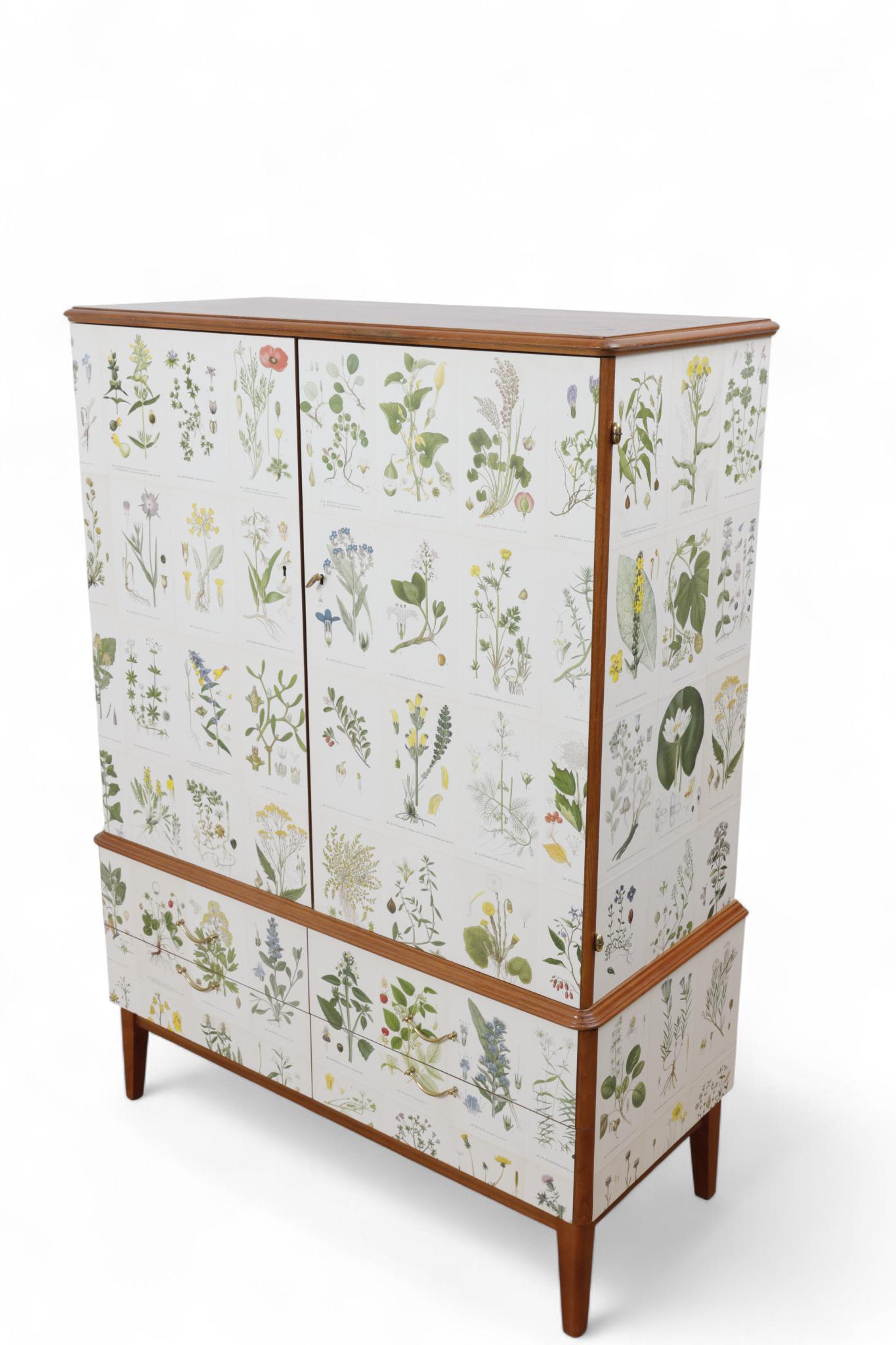 met twee deuren en vier laden. Belijmd met papieren behang met afbeeldingen van 'Nordens Flora' van C.A.M. Lindman