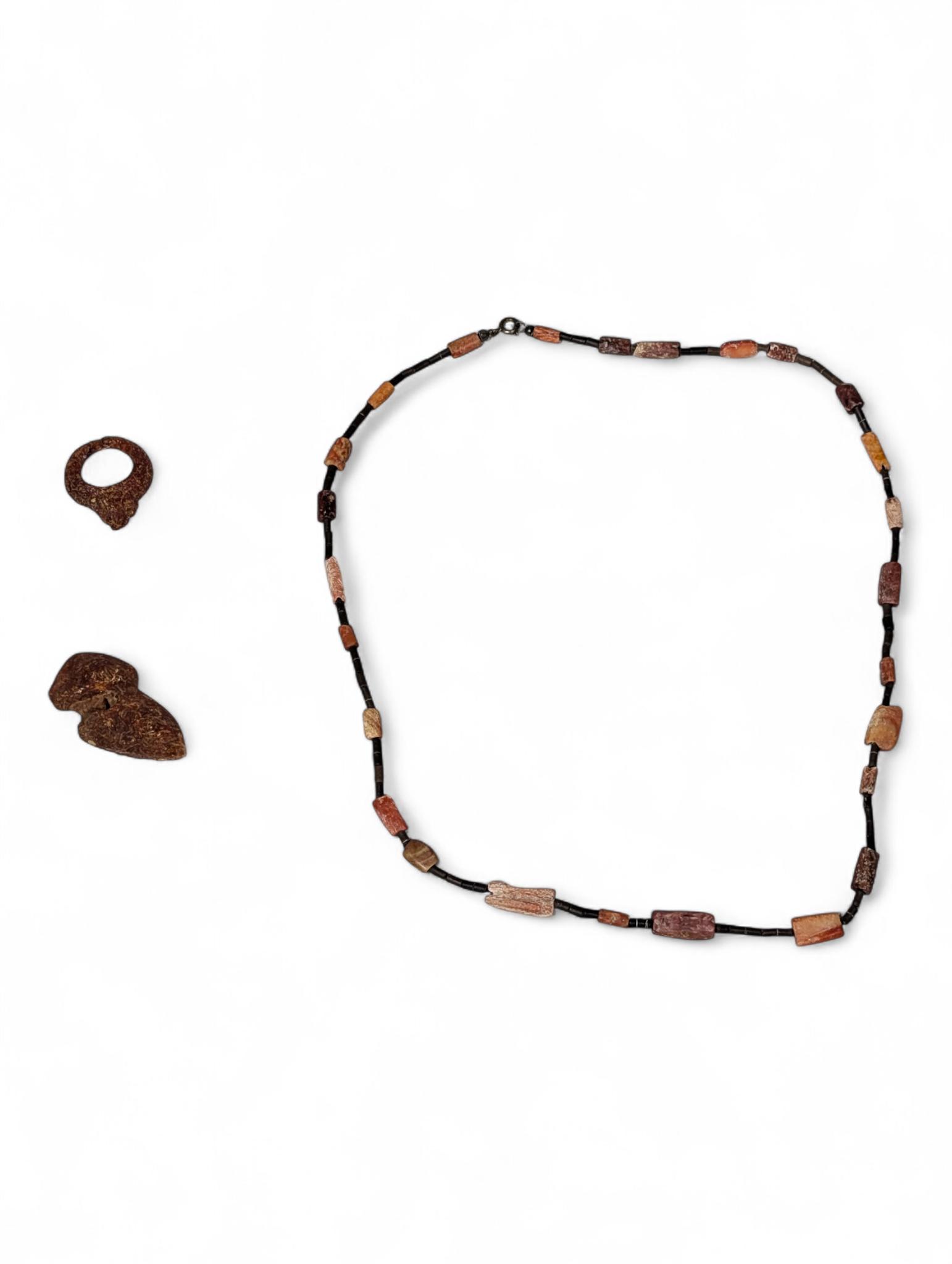 An antique coral and glass necklace, natural resin ring and hanger, possibly antique.