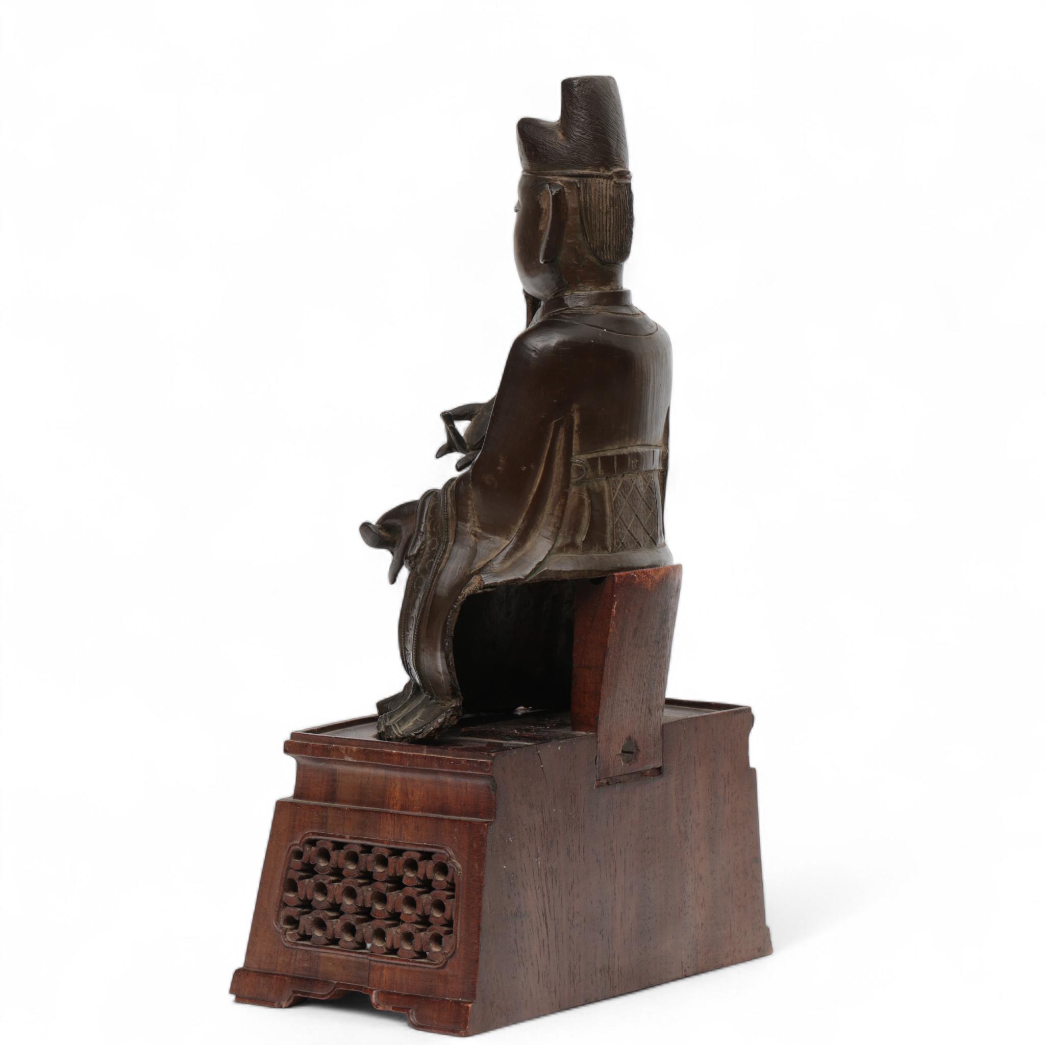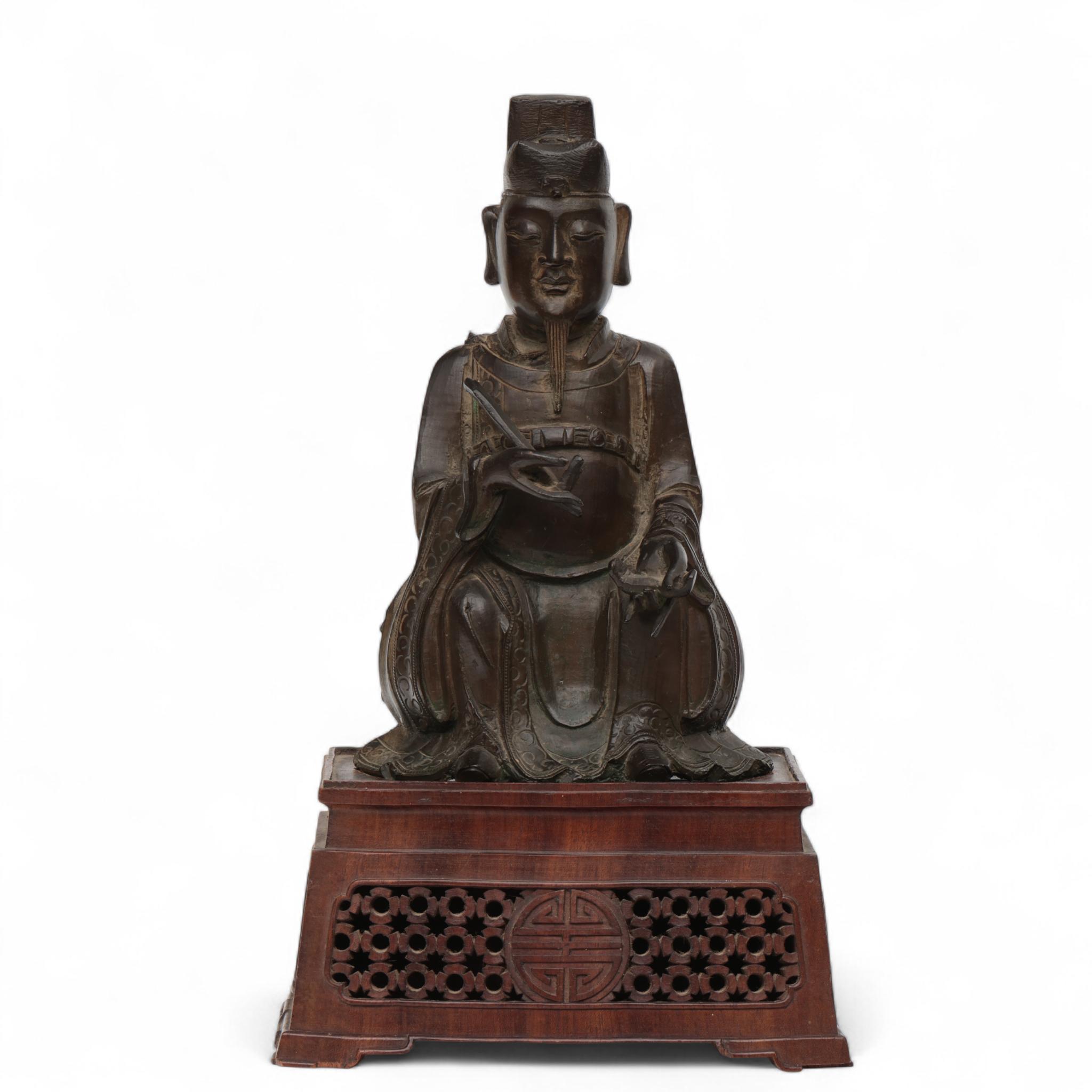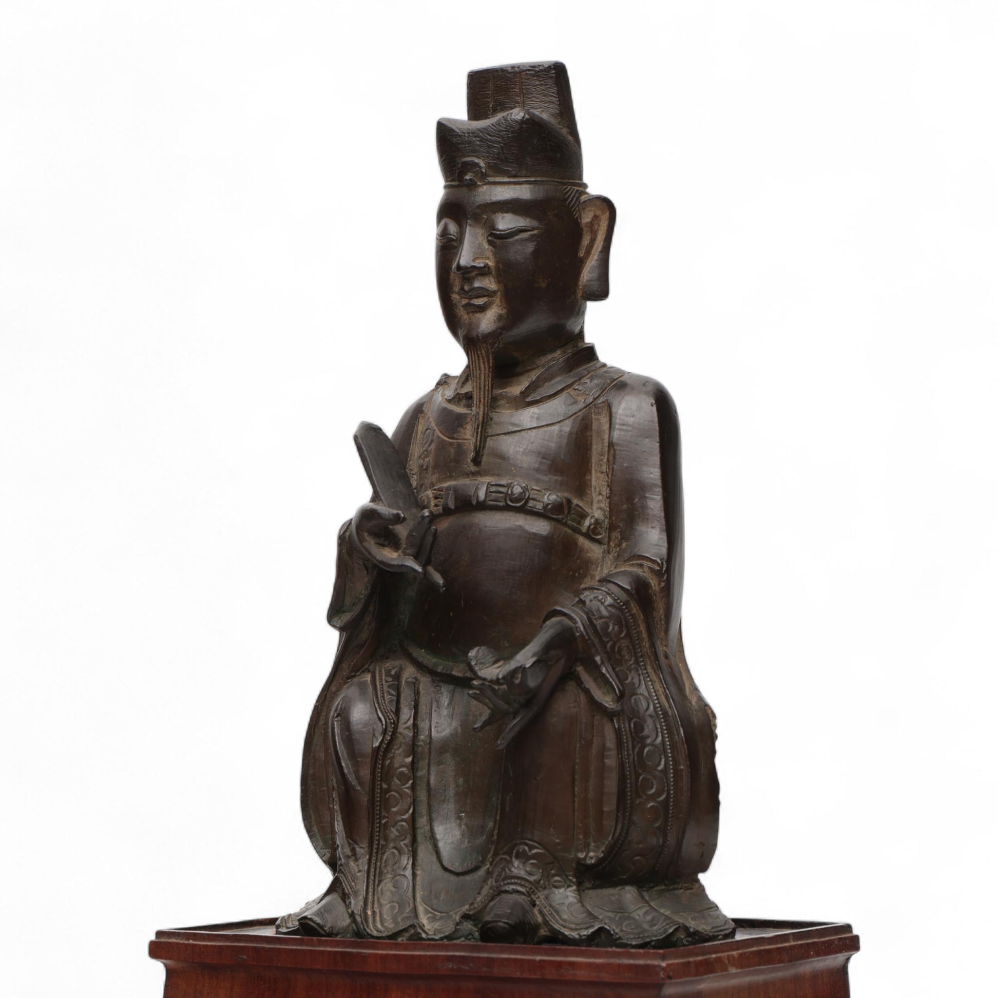 seated holding an ingot and an ancestor tablet, wearing decorated dress, on wood carved stand